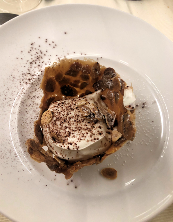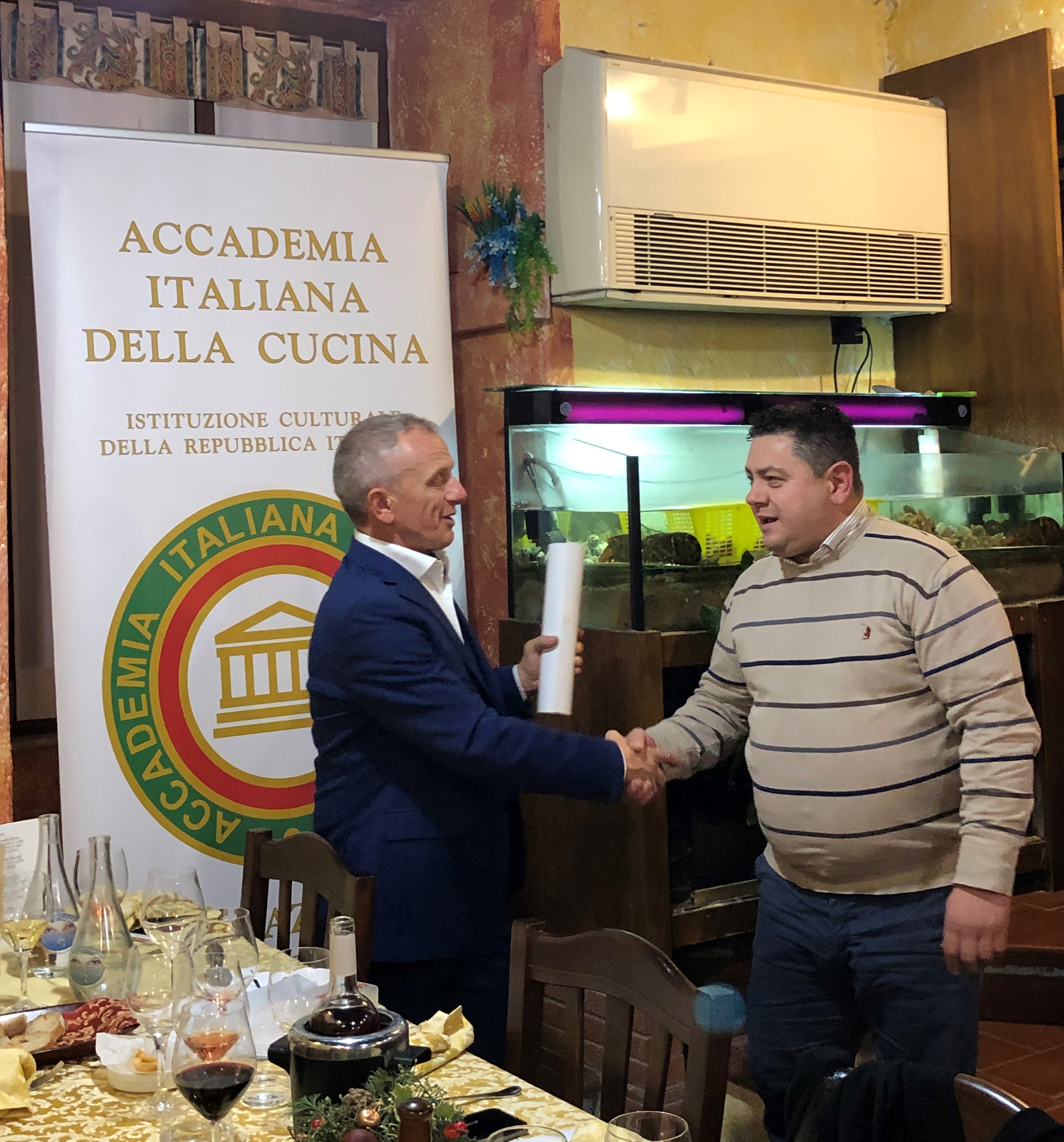 La Delegazione di Terni si è riunita per la cena degli Auguri presso il ristorante Piermarini a Ferentillo (TR), in una bella villa immersa nel verde della Valnerina. Durante la serata sono stati celebrati i trentacinque anni di appartenenza all’Accademia di Claudio Borzacchini, con la consegna del diploma e del distintivo da parte del Delegato Luca Cipiccia e del Delegato onorario e Coordinatore Territoriale Umbria Guido Schiaroli. I Simposiarchi, Guido Schiaroli e Mario Guerra, hanno scelto un menu ispirato alla cucina del territorio. Il ristorante Piermarini, già insignito del Diploma di Buona Cucina nel 2013, si conferma un riferimento nella ristorazione e gastronomia del territorio. Serata molto partecipata e ben riuscita, conclusa secondo tradizione con un brindisi di Buon Natale e di un felice e sereno Anno Nuovo agli Accademici e ai numerosi famigliari presenti. Foto 1. Da destra, il Delegato onorario e CT Umbria Guido Schiaroli, Claudio Borzacchini, il Delegato Luca Cipiccia. Foto 2. Il Delegato Cipiccia e Borzacchini. Foto 3. I Simposiarchi della serata Guido Schiaroli e Mario Guerra (a destra), il Delegato Luca Cipiccia e lo chef Primo Piermarini. Foto 4. Cestino croccante, ricotta mantecata e mandorle tostate.