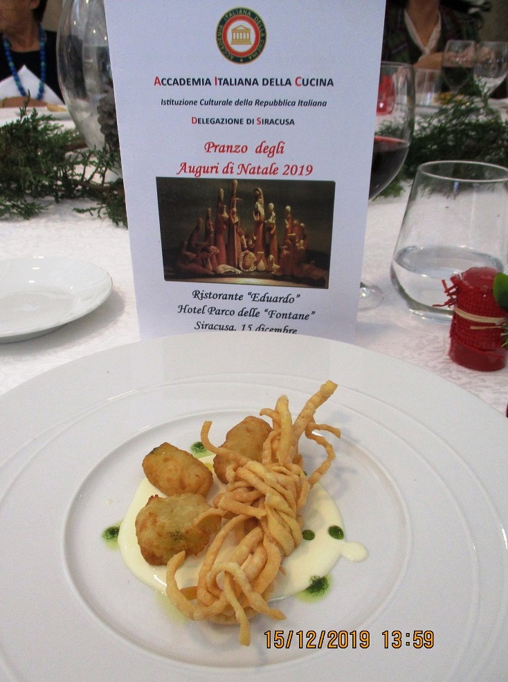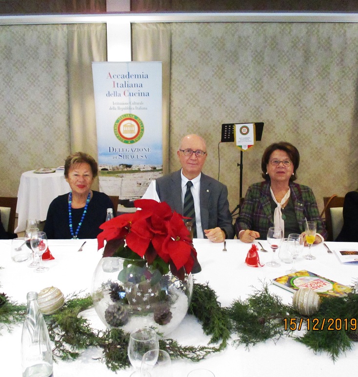 La Delegazione di Siracusa si è riunita per il pranzo degli auguri di Natale presso il Ristorante "Eduardo" dell'Hotel "Parco delle Fontane" a Siracusa. Il Delegato Angelo Tamburini ha invitato la Direttrice del Centro Studi Sicilia Orientale Cettina Voza Pipitone a presentare il volume della Biblioteca di Cultura Gastronomica "