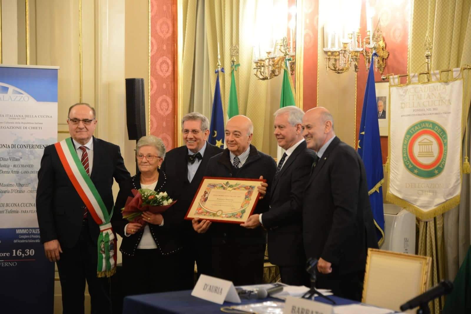 Il 9 gennaio 2020, nel Salone di Rappresentanza di Palazzo del Governo di Chieti, si è svolta la cerimonia di conferimento dei premi dell’Accademia Italiana della Cucina. Alla cerimonia hanno partecipato il Prefetto di Chieti, dott. Giacomo Barbato, il Delegato di Chieti Nicola D’Auria e il Consigliere di Presidenza Mimmo D’Alessio. Alla “Natural Industria di Bucchianico” e a “I segreti di Donna Anna” di Lama dei Peligni è stato conferito il Premio “Dino Villani”; alla storica Pasticceria “D’Orazio” di Chieti il Premio “Massimo Alberini” e il “Diploma di Buona Cucina” al Ristorante “Sant’Eufemia” di Fara Filiorum Petri.