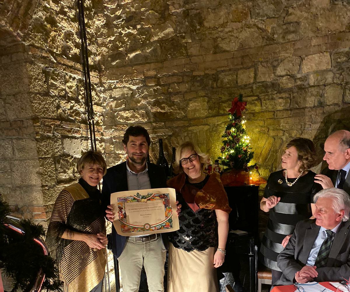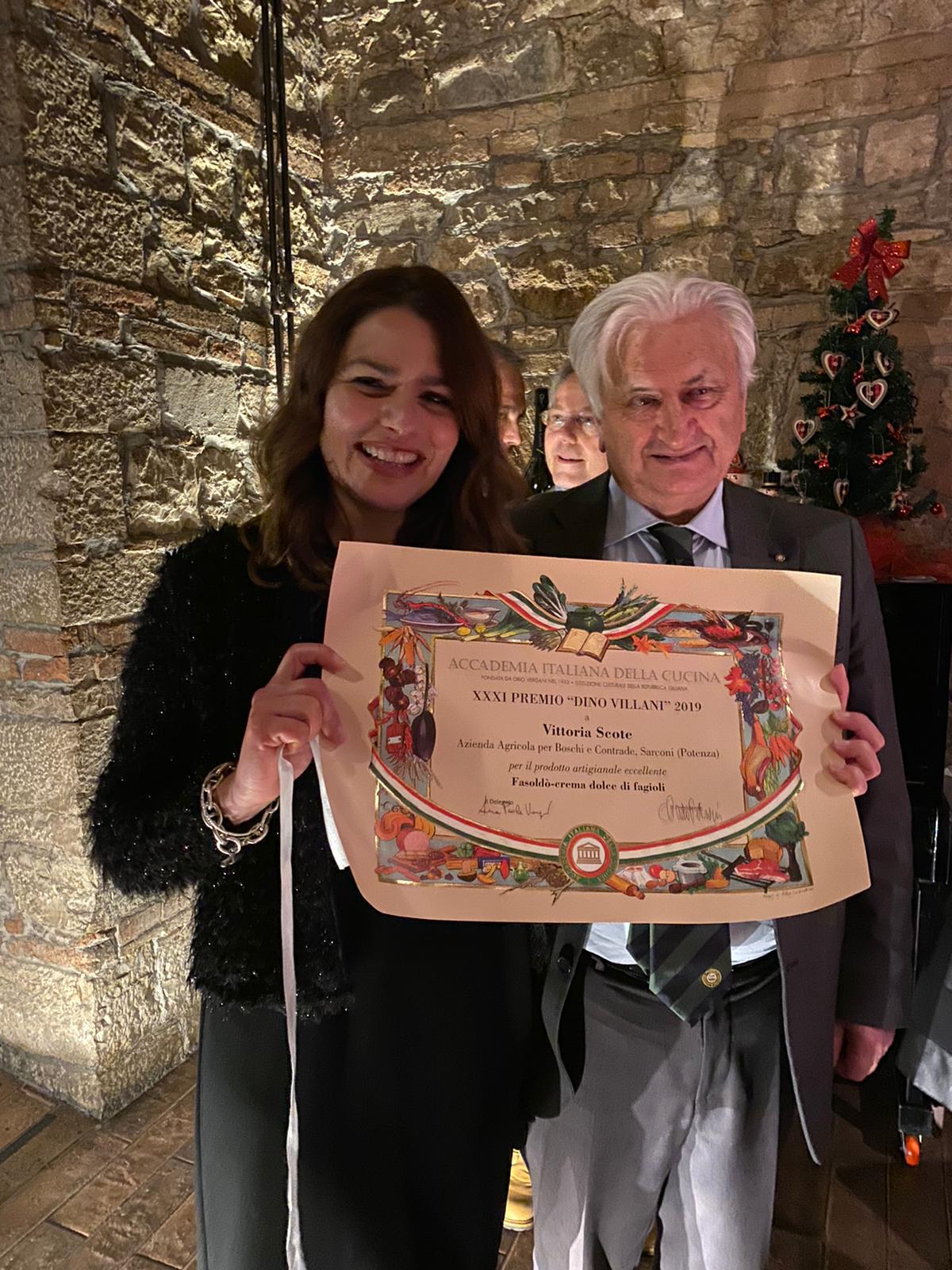 In occasione della consueta cena per lo scambio degli auguri di Natale tenuta presso la a vineria Sottapera a Potenza, è avvenuta la consegna dei premi nazionali assegnati su proposta della Delegazione locale guidata da Anna Paola Vergari. Il premio "Dino Villani" è andato a Vittoria Scote, titolare dell'azienda “Per Boschi e Contrade” che ha ricevuto il premio soprattutto per la famosa Fasoldò, crema dolce di fagioli rigorosamente di Sarconi coltivati ed essiccati come un tempo (in foto 1, Vittoria Scote con Ettore Bove, Direttore Centro Studi Basilicata). Assegnatario del premio "Giovanni Nuvoletti" è stato Rocco Catalano, “romantico assaggiatore e narratore di vini e storie di cibo di periferia, da sempre appassionato di ricerca e selezione di piccoli produttori di grande qualità”, come egli stesso si definisce (in foto 2 con le Accademiche Michela La Vecchia e Rosanna Santagata). Foto 3. Un momento della serata.
