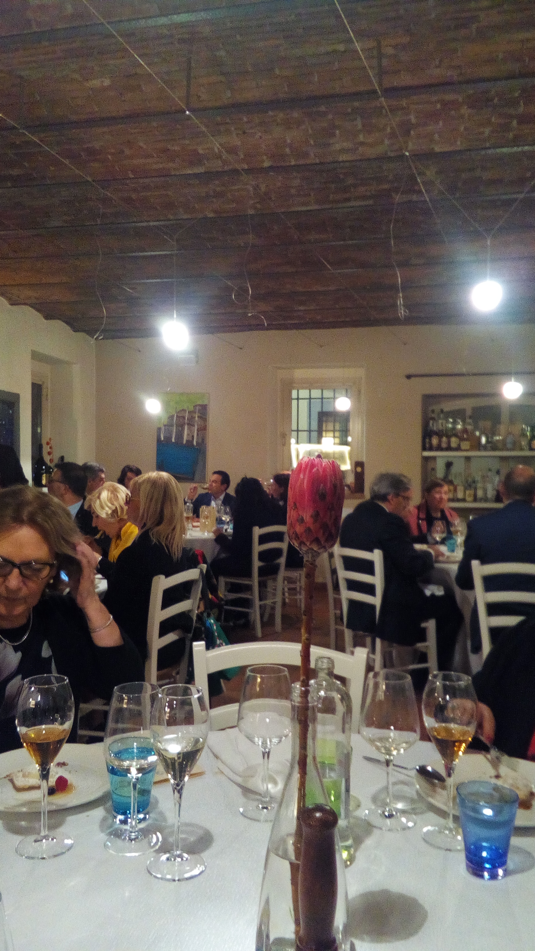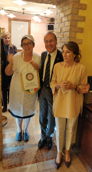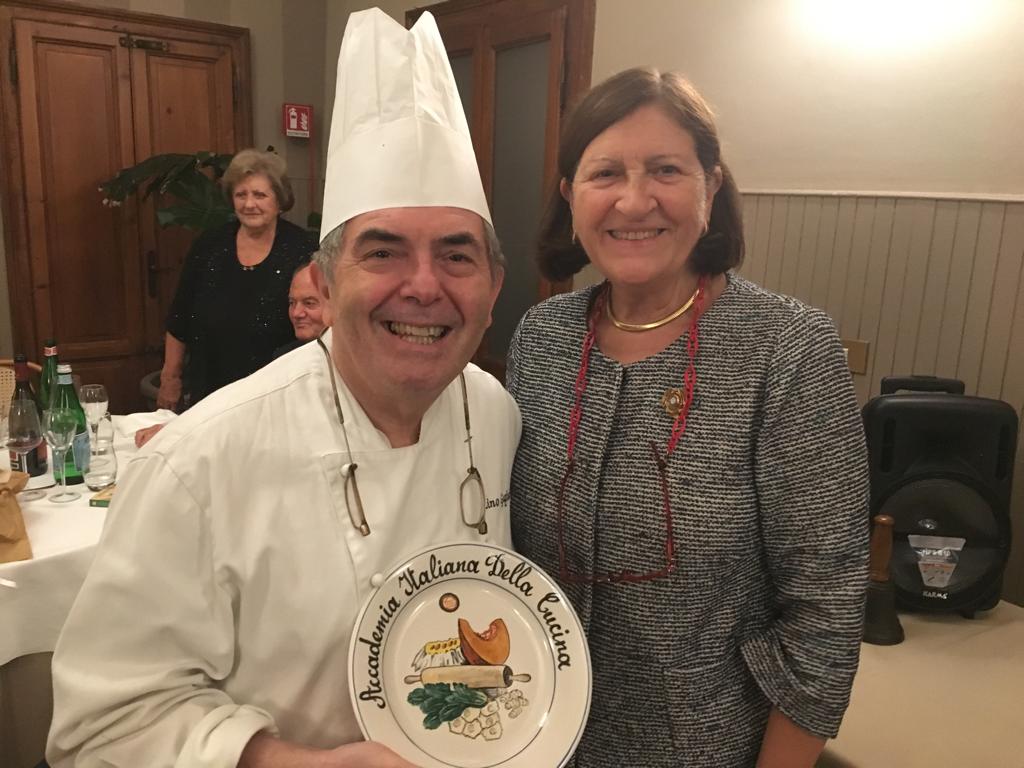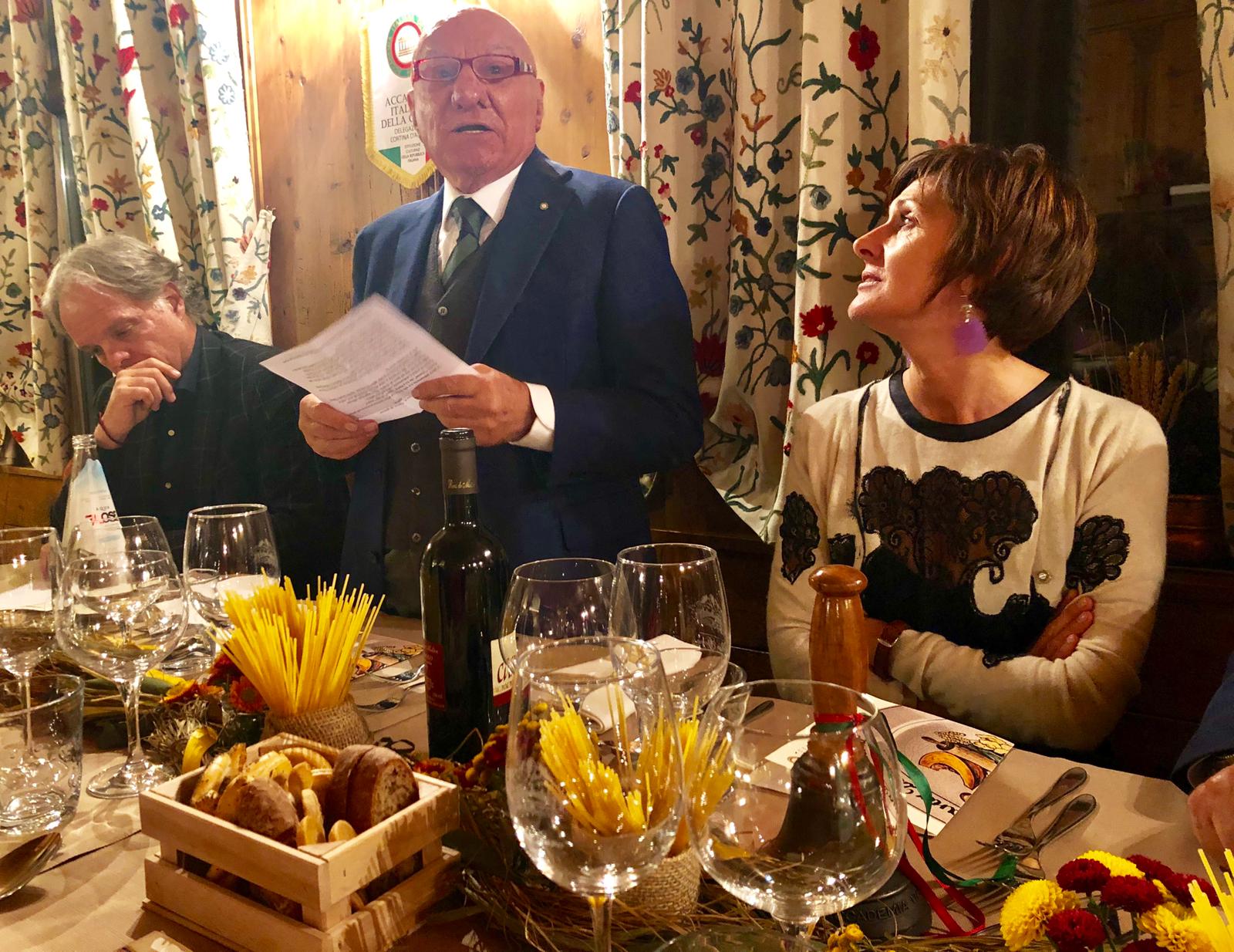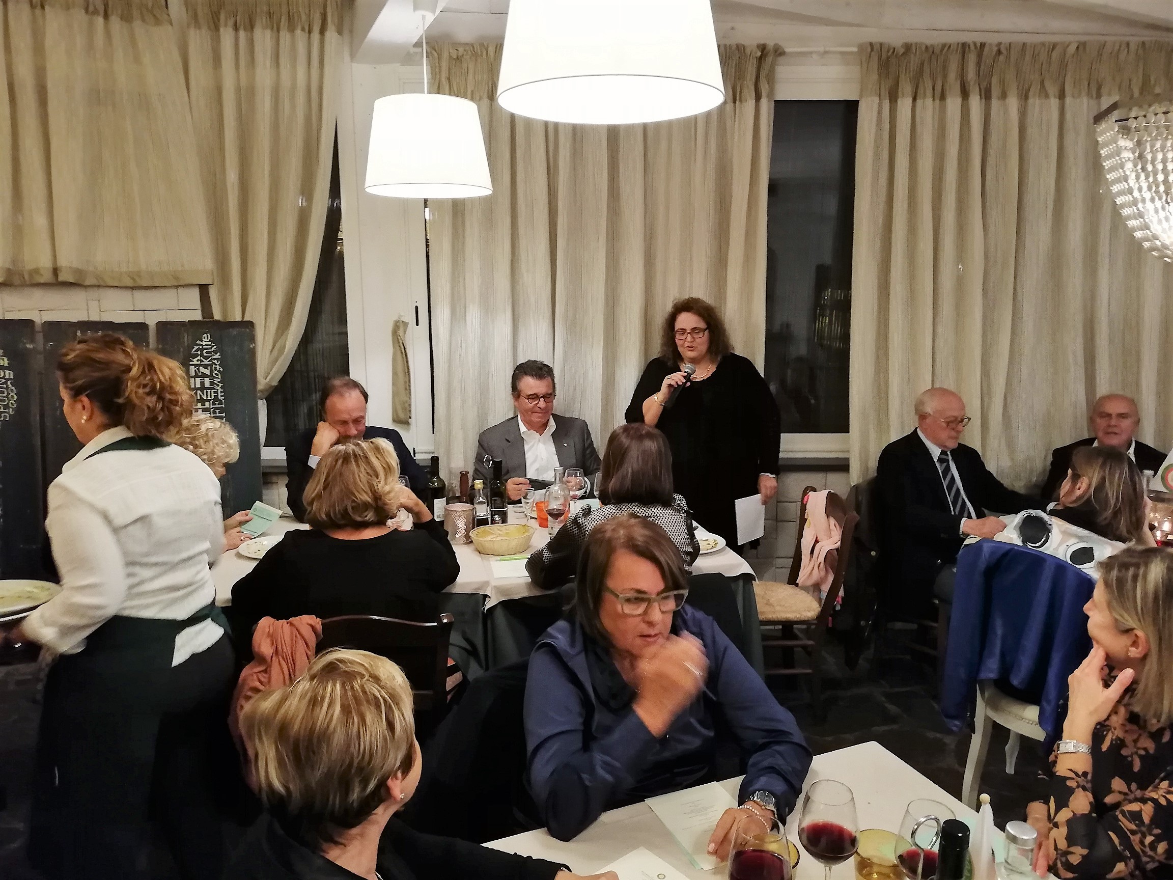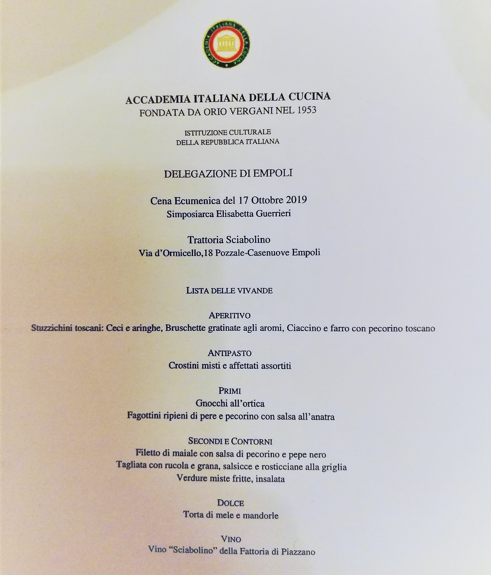 La Delegazione di Empoli ha organizzato la cena ecumenica 2019 sul tema "La pasta fresca, ripiena e gli gnocchi nella cucina della tradizione regionale" presso la “Trattoria Sciabolino” di Pozzale-Casenuove, frazione di Empoli. Il Delegato Massimo Vincenzini ha aperto la riunione conviviale ricordando ai presenti, tra cui numerosi ospiti, il significato e i valori dell’Accademia nonché della stessa Cena Ecumenica. Nel corso della serata Fabrizio Bagni (foto 1 con Delegato), cuoco e titolare della trattoria gestita dalla sua famiglia sin dal 1890, ha presentato l’ampia lista delle vivande selezionate per l’occasione dalla carta, tutte realizzate seguendo il libro delle ricette di famiglia; in ottemperanza al tema dell’anno, ha proposto Gnocchi all’ortica e Fagottini ripieni di pere e pecorino con salsa all’anatra. La Simposiarca Elisabetta Guerrieri (foto 2-3) ha poi ripercorso in breve la lunga e gloriosa storia del “Premio Letterario Pozzale - Luigi Russo”, istituito nel 1948 proprio in quella zona della campagna empolese, che vedeva anche la trattoria Sciabolino come luogo di incontro. Foto 3. Un momento della serata. Foto 4. Menu.