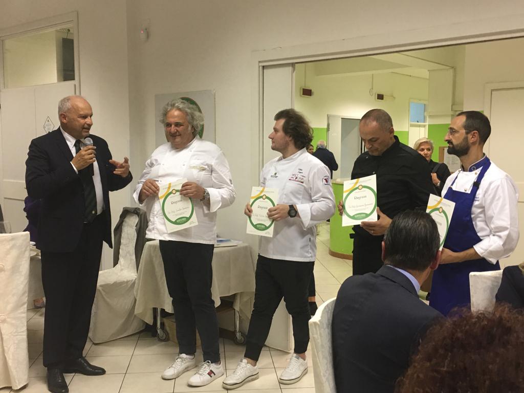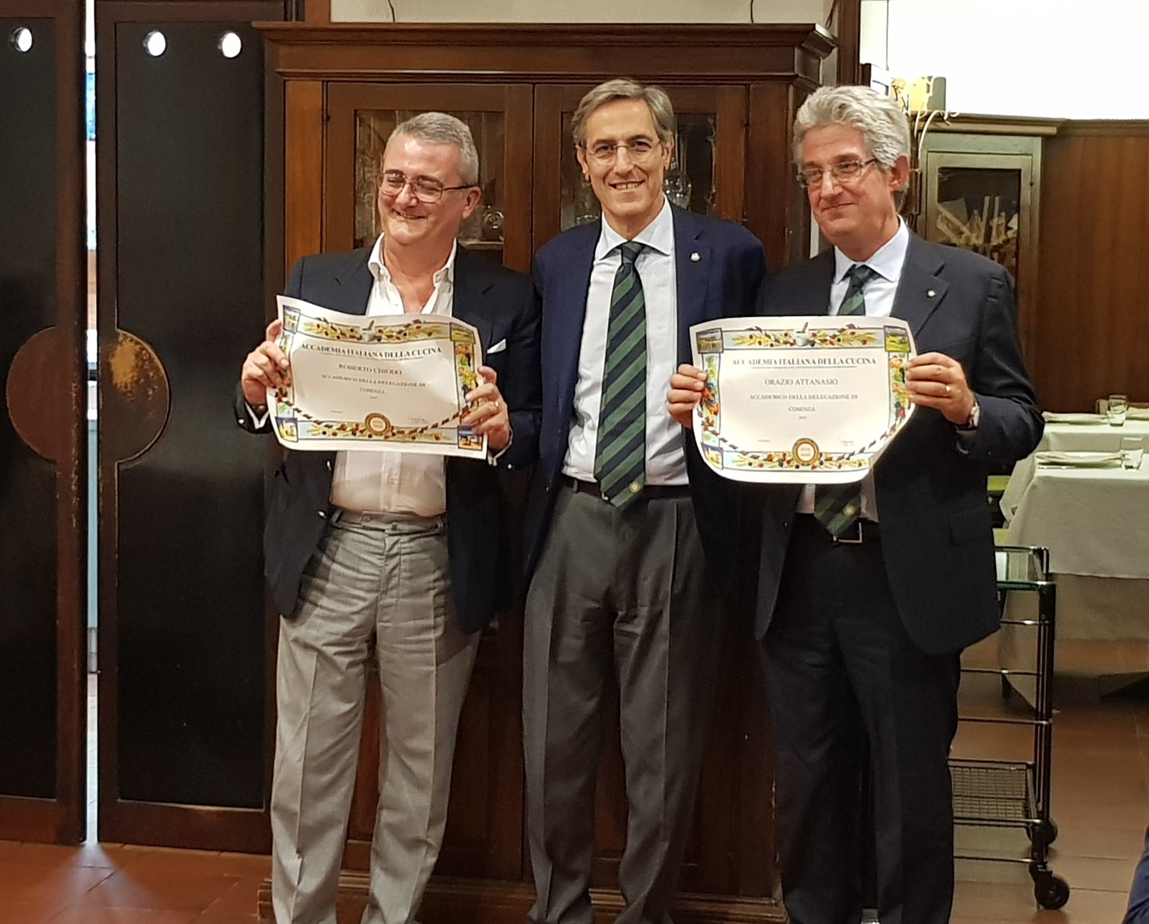 La Delegazione di Cosenza ha organizzato la cena ecumenica 2019 sul tema "La pasta fresca, ripiena e gli gnocchi nella cucina della tradizione regionale" al ristorante "La Locanda di Alia" in Castrovillari. Simposiarca della serata, Rosario Branda, Delegato di Cosenza (foto 1). Foto 2. I neo Accademici Roberto Chiodo e Orazio Attanasio ricevono dal Delegato Branda gli attestati di appartenza all'Accademia. Foto 3. Il contributo dell’Accademico Onorario Ottavio Cavalcanti. Foto 4. Gnocchi con verdure e pescato del giorno (chef Gaetano Alia).