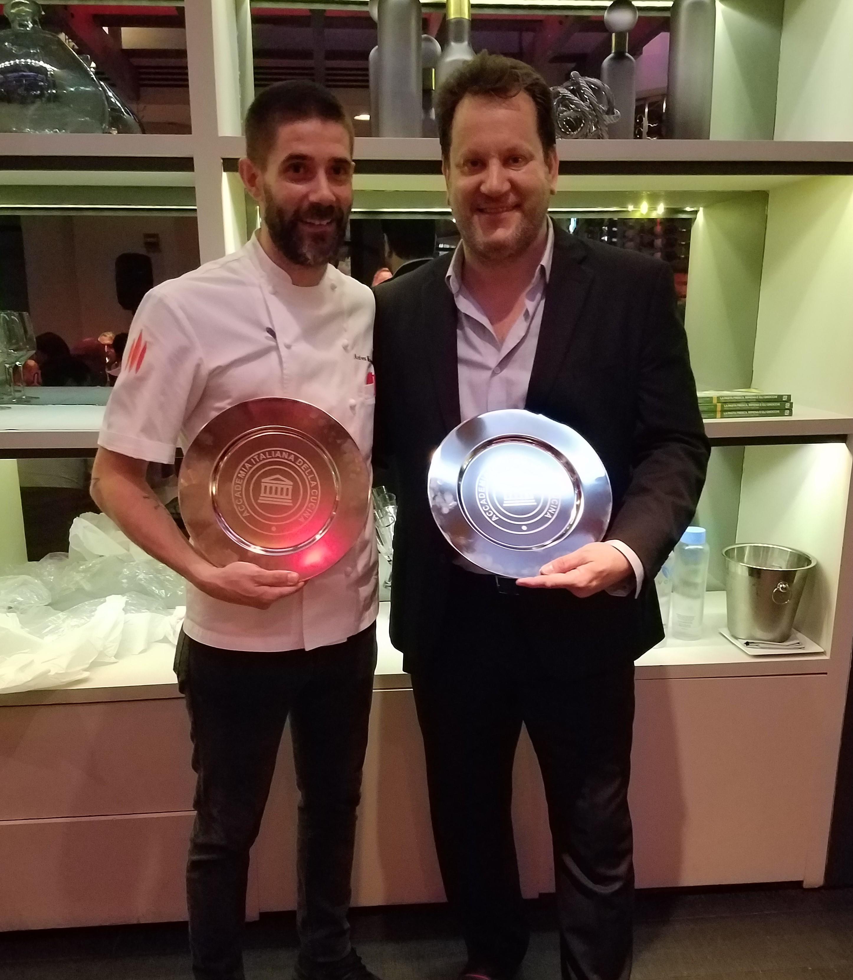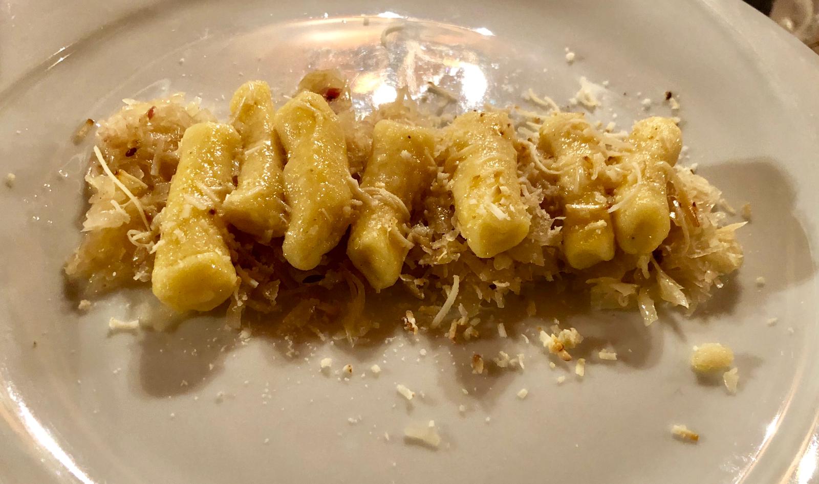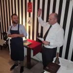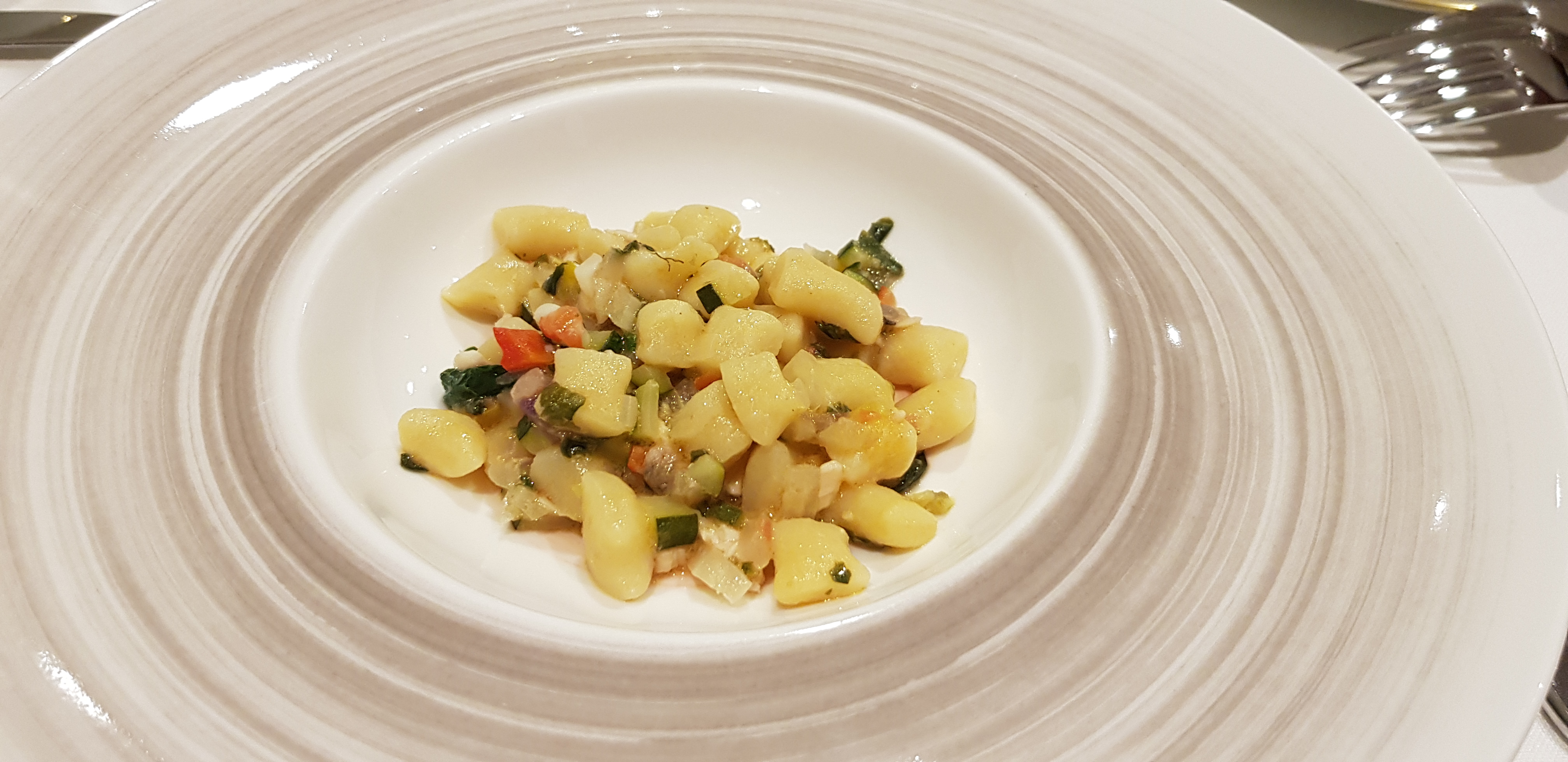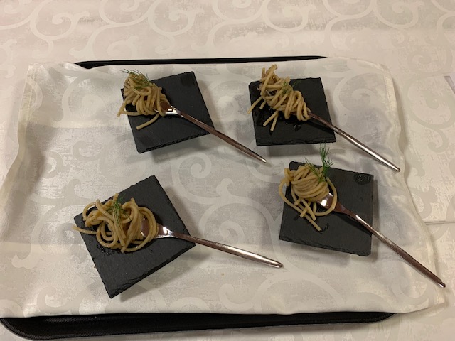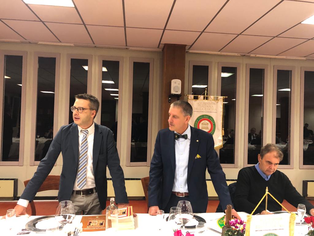 La Delegazione dell'Alto Vicentino ha organizzato la cena ecumenica 2019 sul tema "La pasta fresca, ripiena e gli gnocchi nella cucina della tradizione regionale" presso l’IPSSAR "Pellegrino Artusi" di Recoaro Terme (VI). In questa occasione il Delegato Renzo Rizzi ha consegnato il premio "Massimo Alberini" ai legali rappresentanti della gastronomia Lallo & Lolli di Valdagno (foto 1). Foto 2. Il Delegato al centro fra il Dirigente scolastico dell'IPSSAR di Recoaro (in piedi a sinistra) ed il relatore il cuoco A. Sandri (a destra seduto). Foto 2. Aperitivi: bigoli mori con la sardela. Foto 4. Gnocchi con la fioreta.