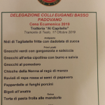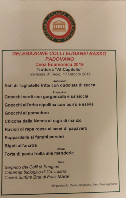 La Delegazione Colli Euganei-Basso Padovano ha organizzato la cena ecumenica 2019 sul tema "La pasta fresca, ripiena e gli gnocchi nella cucina della tradizione regionale" presso la trattoria "Al Capitello" collocata proprio ai piedi delle colline padovane. Foto 1. La Delegata Susanna Tagliapietra (a sinistra) consegna l'attestato di appartenenza alla nuova Accademica Elisabetta Boniver Conte. Foto 2. Accademici a tavola. Foto 3. La Delegata e il Consultore-Tesoriere Carlo Pampaloni, Simposiarca della cena, consegnano il guidoncino dell'Accademia alla cuoca Bertilla Fabris. Foto 4. Il menu della serata.
