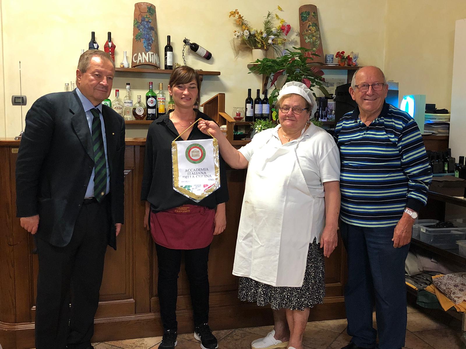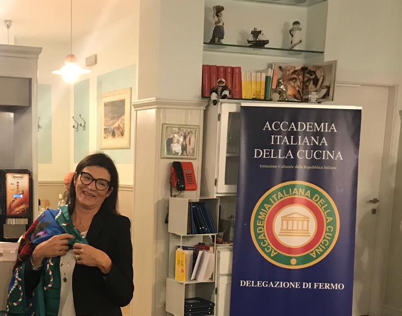 Graditissima e partecipata conviviale "Da Lorè", storica trattoria di Porto San Giorgio, per gustare il piatto tipico (DE.CO.) della città: il brodetto. La stagionalità ha determinato le 13 specie ittiche utilizzate per la pietanza servita con polentone o pane bruscato (foto 4). Il Delegato Fabio Torresi ha accolto nella Delegazione Maura Raccichini (foto 1) e Stefania Budassi (foto 2) investendole delle insegne accademiche. A chiusura della serata, il Delegato ha ringraziato la cuoca Maria Zazzetta che da 49 anni guida la cucina sotto la direzione di Edi Traini e Gabriele Vitali della cantina Casale Vitali per i vini in abbinamento (foto 3).