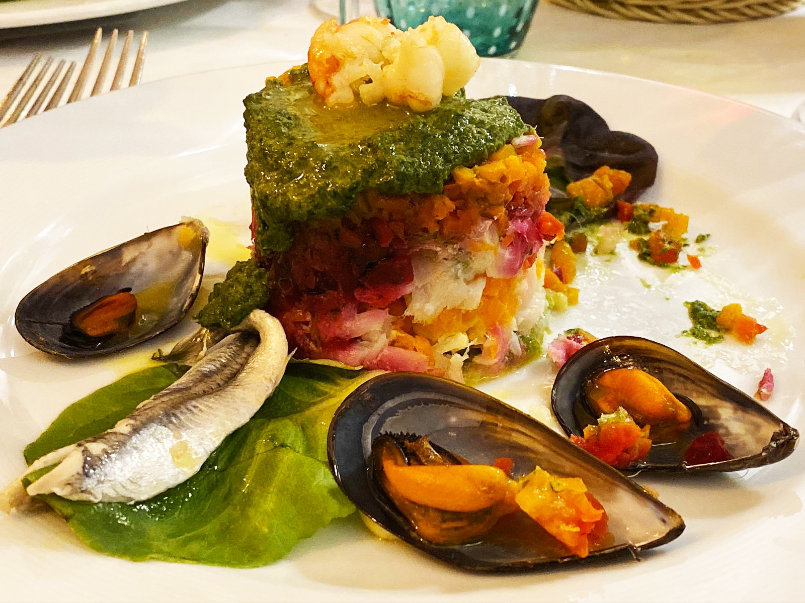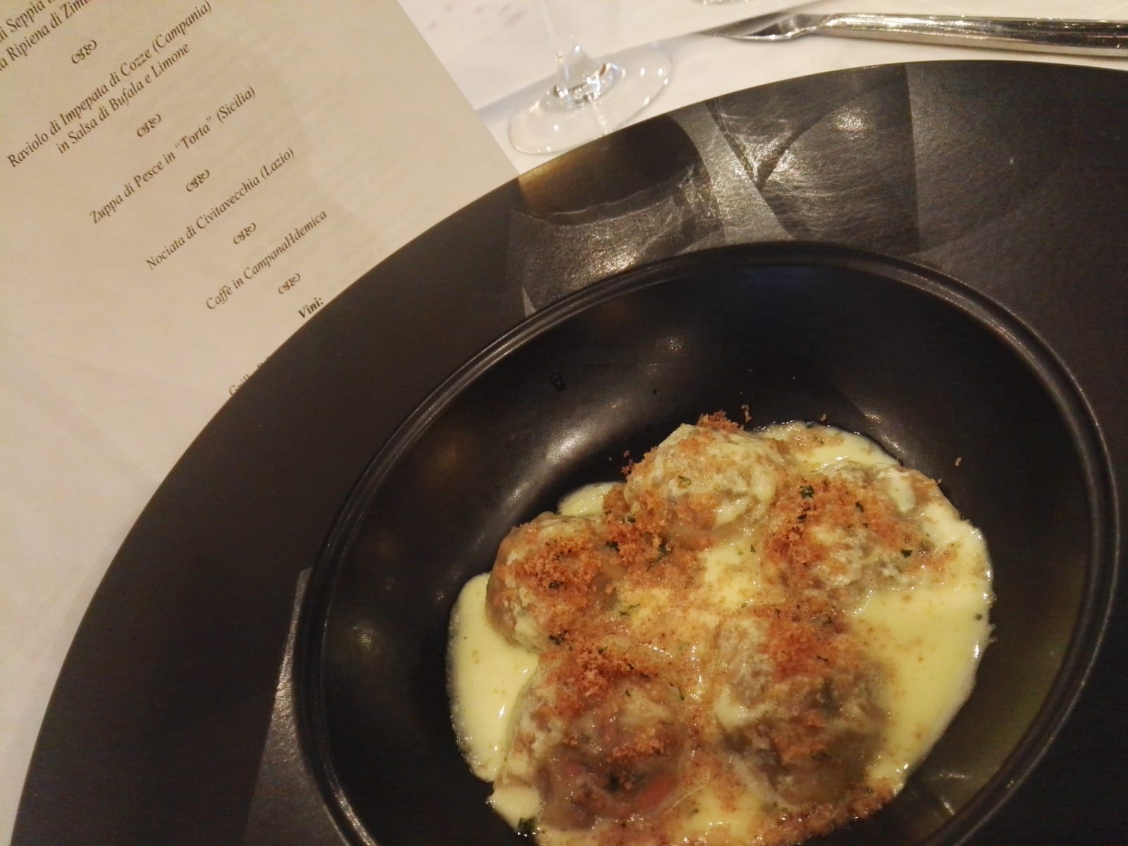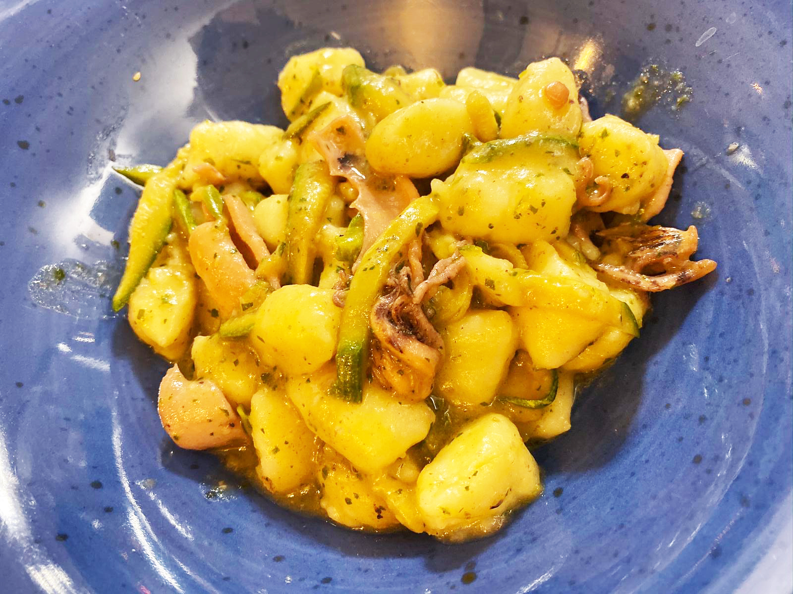 La Delegazione di Genova ha organizzato la cena ecumenica 2019 sul tema "La pasta fresca, ripiena e gli gnocchi nella cucina della tradizione regionale" presso l'Osteria del San Giorgio. La riunione conviviale si è aperta con un’esaustiva relazione del giornalista Marco Benvenuto e dell'Accademico Minestrini sul tema della serata (foto 1) per poi proseguire con la cena, tutta a base di pesce. Foto 2. Il Vice Delegato Stefano Cazzulo, Accademici e ospiti. Foto 3. Cappon Magro della tradizione. Foto 4. gnocchetti di calamaretti e julienne di zucchine.