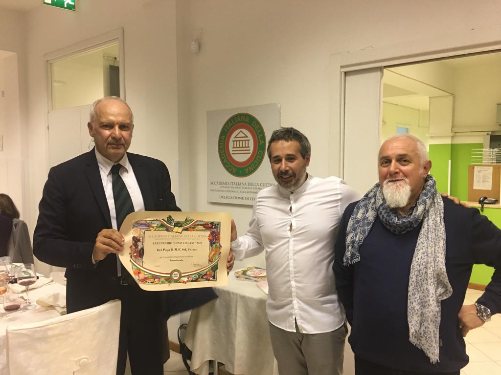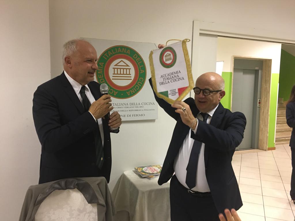 La Delegazione di Fermo ha organizzato la cena ecumenica 2019 sul tema "La pasta fresca, ripiena e gli gnocchi nella cucina della tradizione regionale" presso l’Istituto Alberghiero "Carlo Urbani" di Porto Sant’Elpidio con il patrocinio dei comuni di Amandola, Monterubbiano, Lapedona, Campofilone e Porto Sant’Elpidio: un evento culturale ed enogastronomico di altissimo livello che ha entusiasmato i numerosissimi ospiti e gli Accademici, ma soprattutto i ragazzi dell’Istituto. L’evento ha costituito l’occasione per la consegna del Premio Dino Villani alla Forneria Pasticceria 180° per la produzione dell’ Amandovolo che è stato l’apprezzato fine pasto della serata. Foto 1. Accademici e ospiti a tavola. Foto 2. La consegna del Premio Dino Villani. Foto 3. Ringraziamenti al Dirigente scolastico. Foto 4 (da sinistra). Gli chef Aurelio Damiani, Nikita Sergeev, Giampiero Gianmarini e Pierpaolo Piermarini.