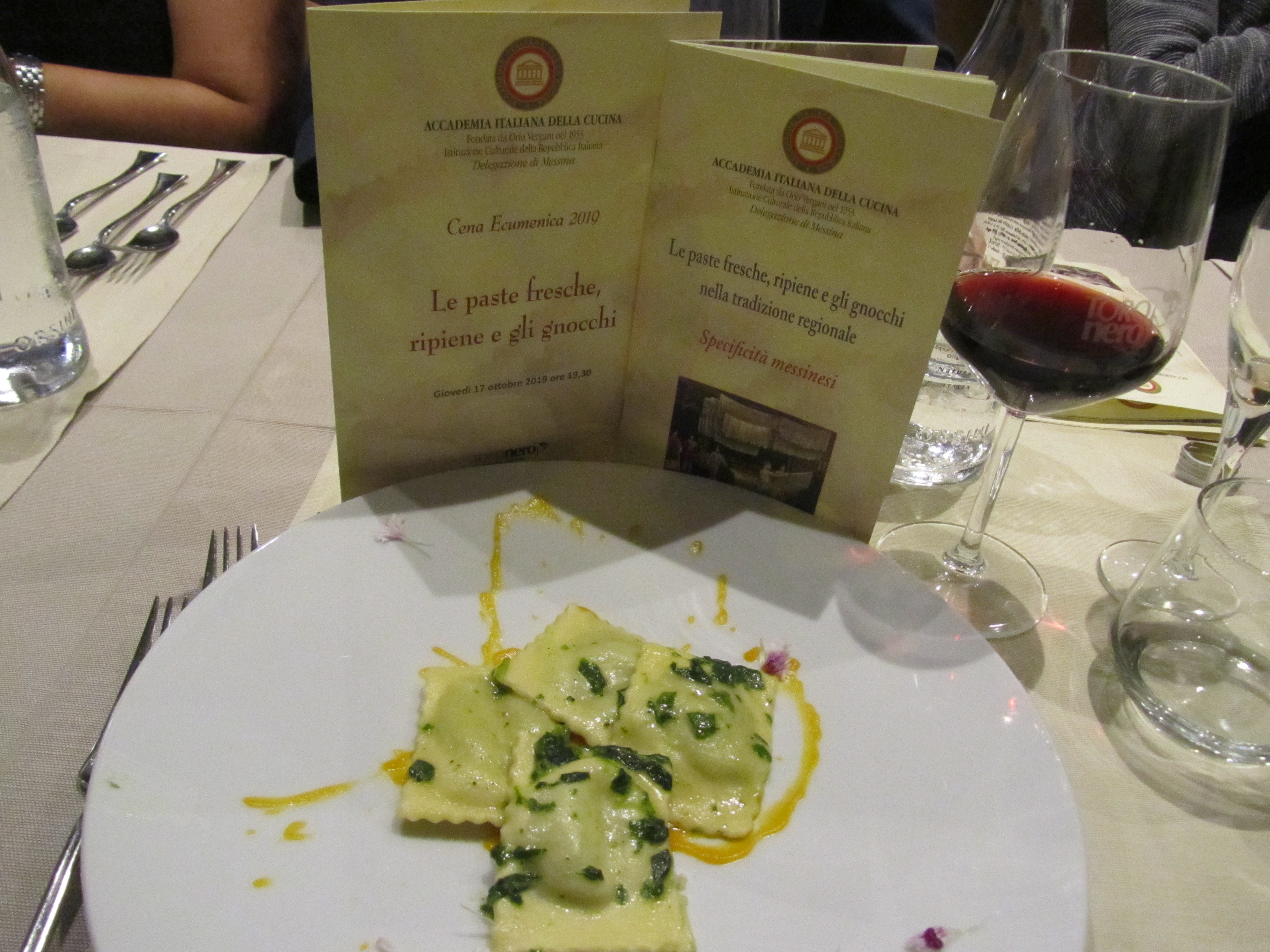 La Delegazione di Messina ha organizzato la cena ecumenica 2019 sul tema "La pasta fresca, ripiena e gli gnocchi nella cucina della tradizione regionale" presso il ristorante "Toro Nero" già visitato e apprezzato nel passato. Il Delegato Francesco Trimarchi (Foto 1) ha presentato il tema dell’Ecumenica in relazione alle peculiarità storico-culturali del territorio e il Consultore Attilio Borda Bossana (membro del CST Sicilia orientale) ha illustrato il volume dell’anno, integrato da un opuscolo edito dalla Delegazione e dedicato alle specificità messinesi. La Delegazione (Foto 2) ha unanimemente apprezzato tutte le portate, preparate filologicamente (Foto 3). Nel corso della serata il Delegato e il Segretario Giovanni Rossi hanno premiato la giovane Manuela Giordano, migliore diplomata in pasticceria dell’IIS "Antonello" (Foto 4).