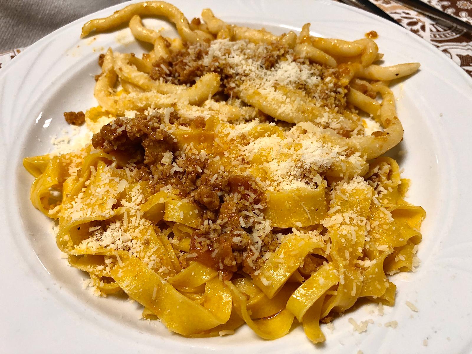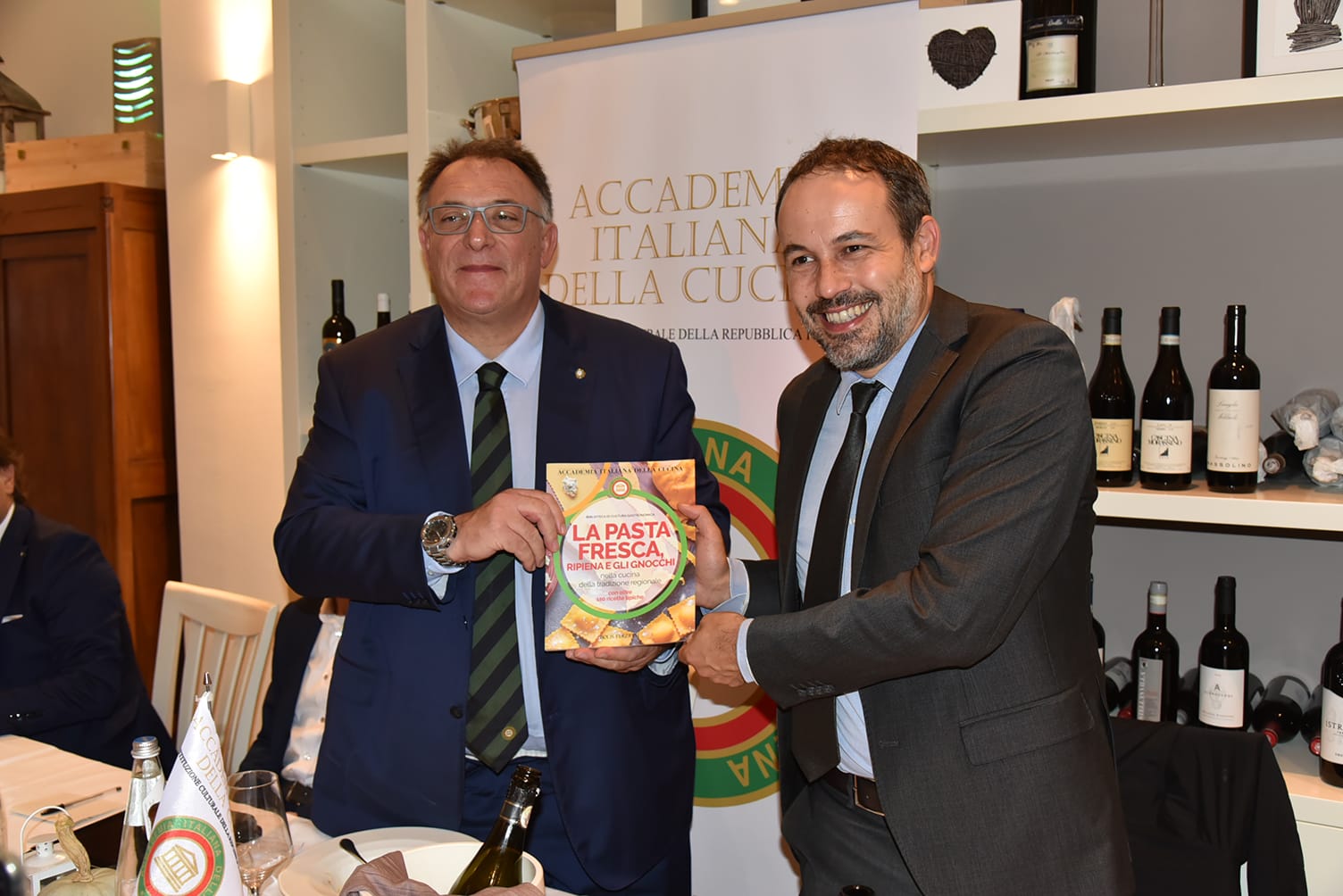 La Delegazione di Imola ha organizzato la cena ecumenica 2019 sul tema "La pasta fresca, ripiena e gli gnocchi nella cucina della tradizione regionale" presso l'agriturismo Frascineti. In questa occasione la Delegazione ha consegnato il premio "Massimo Alberini" al Laboratorio di Bettini Graziano per la trentennale attività di produzione di pasta fresca. Foto 1. Il Delegato Antonio Gaddoni apre la riunione conviviale illustrando le tipologie e le particolarità della pasta fresca del territorio. 2. La consegna del Premio Massimo Alberini al Laboratorio di pasta fresca di Bettini Graziano. Foto 3. La famiglia Frascineti che da tre generazioni gestice l'agriturismo. Foto 4. Tagliatelle e strozzapreti.