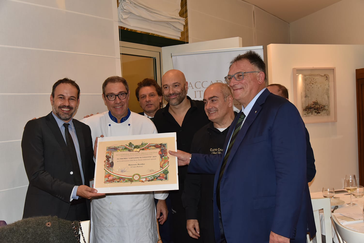 La Delegazione di Carpi-Correggio ha organizzato la cena ecumenica 2019 sul tema "La pasta fresca, ripiena e gli gnocchi nella cucina della tradizione regionale" al Ristorante Barolino che ha ricevuto, in questa occasione, il prestigio Premio "Giovanni Nuvoletti". Presenti, oltre al Sindaco di Carpi dott. Alberto Bellelli, gli enologi Rosetto della Cantina di Santa Croce di Carpi e Bocedi della Cantina San Martino in Rio, giornalisiti, numerosi Accademici e ospiti. Foto 1. Consegna del Premio "Giovanni Nuvoletti" al ristorante Barolino dei fratelli Barolo. Da sinistra: Sindaco Bellelli, i fratelli Barolo, il Delegato Veroni e in secondo piano il Simposiarca della serata Consultore Giuseppe Calabria. Foto 2. il Delegato Pier Paolo Veroni consegna al Sindaco il libro "Le paste fresche ripiene e gnocchi". Foto 4. Pier Paolo Veroni e il Sindaco Bellelli in piedi, seduto l'enologo Bocedi. Foto 4. Un momento della serata.