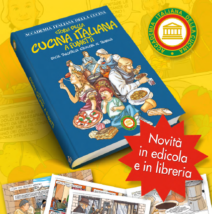 Available for sale in bookshops and newsagents throughout Italy, the Italian Academy of Cuisine’s brand-new volume History of Italian Cuisine in Comics: From Etruscan tagliatelle to tiramisù.