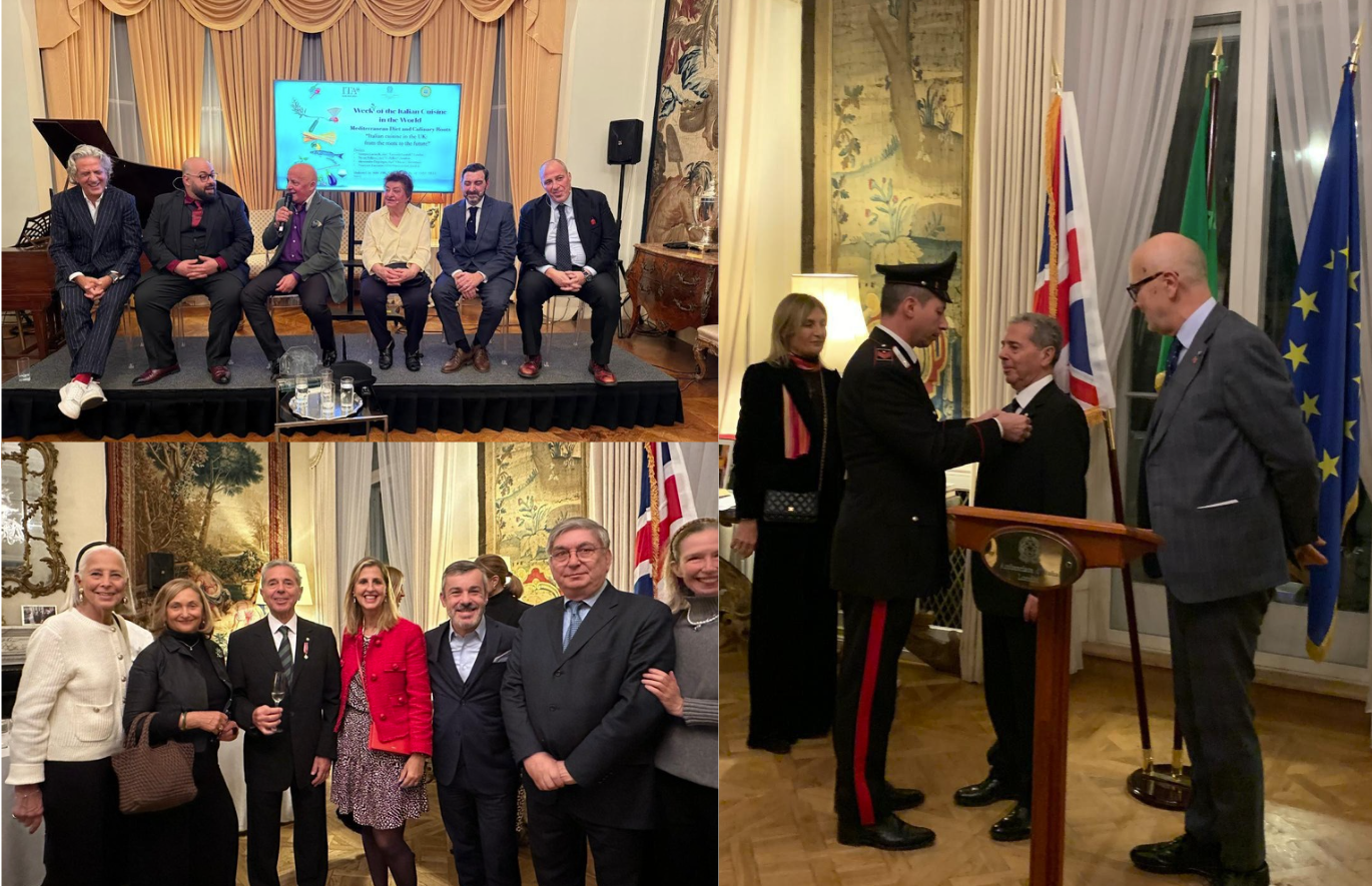 Numerosi sono stati gli eventi a Londra per la IX SCIM. La Delegazione locale ha curato, in particolare: la Cena di Gala del 19 nov. al Twiga, un evento esclusivo con la partecipazione di personalità e autorità, il cui menù è stato curato dagli chef Stavros Kiourkoulis e Francesco Perricone. Il Vice Ambasciatore Smimmo ha ringraziato l'Accademia per il suo impegno globale, sottolineando l'importanza della Settimana per la promozione dei prodotti italiani all'estero. Il Delegato ha evidenziato il valore della collaborazione tra l'Accademia e le istituzioni, fondamentale nei paesi esteri, dove la concorrenza agroalimentare è forte. A fine serata, complimenti allo chef Perricone e al Direttore Amodio per il menù e il servizio impeccabile. La Delegazione ha collaborato e partecipato anche al convegno del 21 nov., presso l’Ambasciata d’Italia, sulla 'Cucina delle Radici', moderato da Aldo Zilli. Chef e professionisti del settore hanno discusso le sfide della cucina italiana nel Regno Unito. Durante la serata, S.E. l'Ambasciatore Inigo Lambertini ha conferito, su mandato del Presidente della Repubblica, l'onorificenza di Ufficiale della Repubblica O.S.I. al Delegato e Vice Presidente Maurizio Fazzari e allo chef Theo Randall. Curato dalla Delegazione, in cooperazione con l'Addetta all' Agricoltura Gabriella Manfredi, il convegno del 25 nov. sugli sprechi alimentari, moderato da Roberta Re del Cambridge Food Institute. I relatori, tra cui esperti di Barilla e FareShare, hanno discusso l'importanza di combattere lo spreco alimentare e di come l’informazione e la condivisione ne siano la chiave. Il Delegato ha sottolineato l'impegno dell'Accademia in questa causa e la necessità di favorire l'educazione alimentare fin dalla giovane età; ha ricordato i volumi pubblicati 'La cucina del riuso' e 'Storia della cucina italiana a fumetti'. Contributo e partecipazione dell’Accademia anche alla serata del 26 novembre dedicata a Giacomo Puccini, sempre presso l'Ambasciata d'Italia.