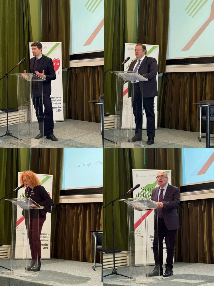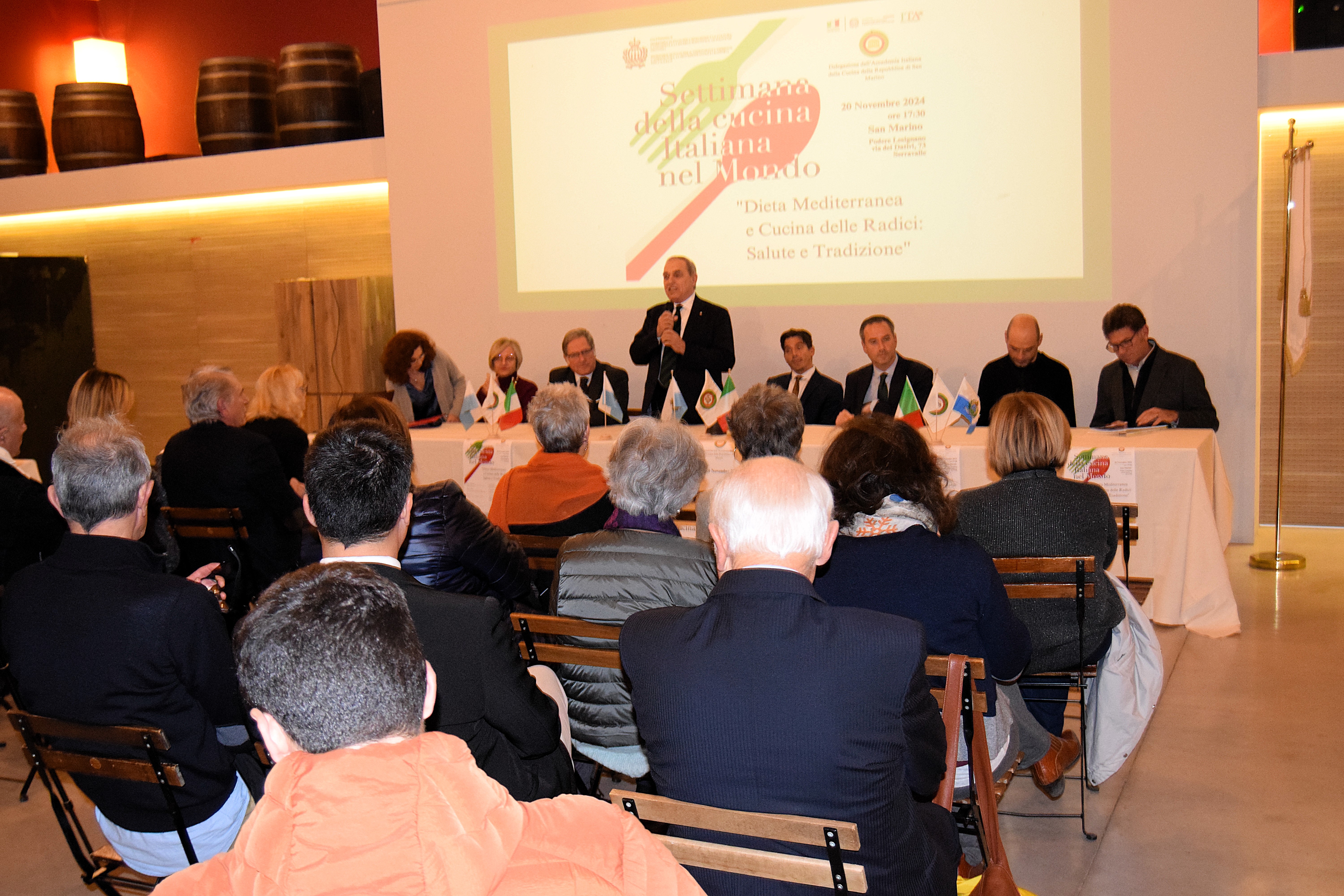 Presso l’Agriturismo Podere Lesignano si è tenuta la conferenza “Dieta Mediterranea e Cucina delle Radici: Salute e Tradizione”, patrocinata dalle Segreterie di Stato per l’Istruzione e per il Territorio di San Marino. I Segretari di Stato Teodoro Lonfernini e Matteo Ciacci hanno riconosciuto il ruolo centrale dell’Accademia Italiana della Cucina nella diffusione della tradizione gastronomica italiana e, in merito al tema della IX Settimana, l’importanza della Dieta Mediterranea come modello nutrizionale salutare e completo. L’Ambasciatore d’Italia in San Marino, Dr. Fabrizio Colaceci, ricordando gli eventi organizzati per la XI SCIM, ha evidenziato i fattori che hanno determinato nel tempo la formazione della Dieta Mediterranea. Tra i relatori, la dr.ssa Patrizia Di Luca, Responsabile del Centro ricerca sulla Emigrazione, ha raccontato come le comunità italiane all’estero abbiano diffuso la cucina tradizionale. Il Presidente della Cooperativa degli Olivicoltori Sammarinesi, Flavio Benedettini, ha parlato dell’olio extravergine di oliva come elemento chiave della Dieta Mediterranea, e il Dr. Michele Margotti, enologo e Direttore Commerciale della Cantina di San Marino, ha trattato la storia del vino nel Mediterraneo. La Dr.ssa Marina Corsi, medico nutrizionista, ha illustrato i benefici della Dieta Mediterranea per la salute e la prevenzione di malattie. Il Delegato Stefano Valentino Piva ha concluso la conferenza ricordando il ruolo pionieristico di Ancel Keys nell’introdurre il concetto di Dieta Mediterranea. L’evento si è concluso con la degustazione del Menù Mediterraneo, preparato da Casa Sartini, celebrando la cucina italiana come patrimonio amato in tutto il mondo.
