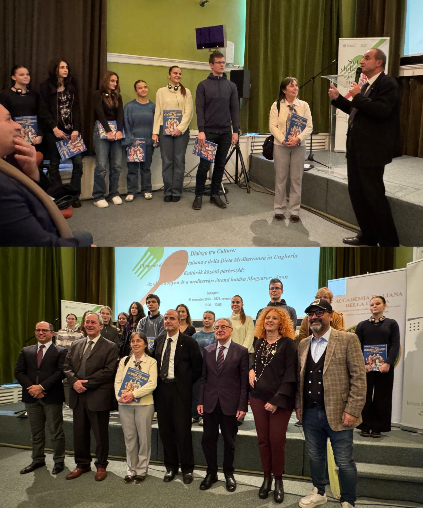 ll seminario organizzato dall'Ambasciata d'Italia in Ungheria e dalla Delegazione di Budapest si è svolto alla "Sala Fellini" dell'Istituto Italiano di Cultura, nell'ambito della IX SCIM. Dopo i saluti del Direttore dell'Istituto, Gabriele La Posta, il Consigliere d'Ambasciata Diego Randazzo, in rappresentanza dell'Ambasciatore e Accademico Onorario S.E. Manuel Jacoangeli, ha aperto i lavori, introducendo il tema dell'incontro.A seguire, il Segretario Generale dell'Accademia Italiana della Cucina, Roberto Ariani, ha fatto pervenire i saluti dell'Accademia. Il Delegato, che ha moderato l'evento, ha sottolineato come "mangiare, come parlare, è comunicare" e l'importanza di un approccio multidisciplinare alla corretta alimentazione. Successivamente, la Vice Delegata Maria Carmela Gaetani Aronica ha tenuto una stimolante presentazione sulla Dieta Mediterranea, esplorandone la storia e il ruolo fondamentale dell'Accademia. Il prof. Győző Szabó, già Direttore dell'Accademia d'Ungheria in Roma, ha illustrato l'influenza della gastronomia italiana sulle tradizioni culinarie ungheresi, evidenziando i forti legami di amicizia tra i due Paesi. A seguire, una tavola rotonda ha coinvolto esperti come Gianni Annoni, del ristorante "Pomo D'Oro", e l'Accademico Carlo Volpe, che hanno approfondito il rapporto tra corretta alimentazione e cultura gastronomica, trattando la cucina come una vera e propria forma d'arte. L'incontro si è concluso con la consegna del libro Storia della Cucina Italiana a fumetti agli studenti dell'Obudai Gymnasium, guidati dalla prof.ssa Terez Nagy Gongyi, e un buffet finale che ha visto la partecipazione attiva e competente dei presenti.