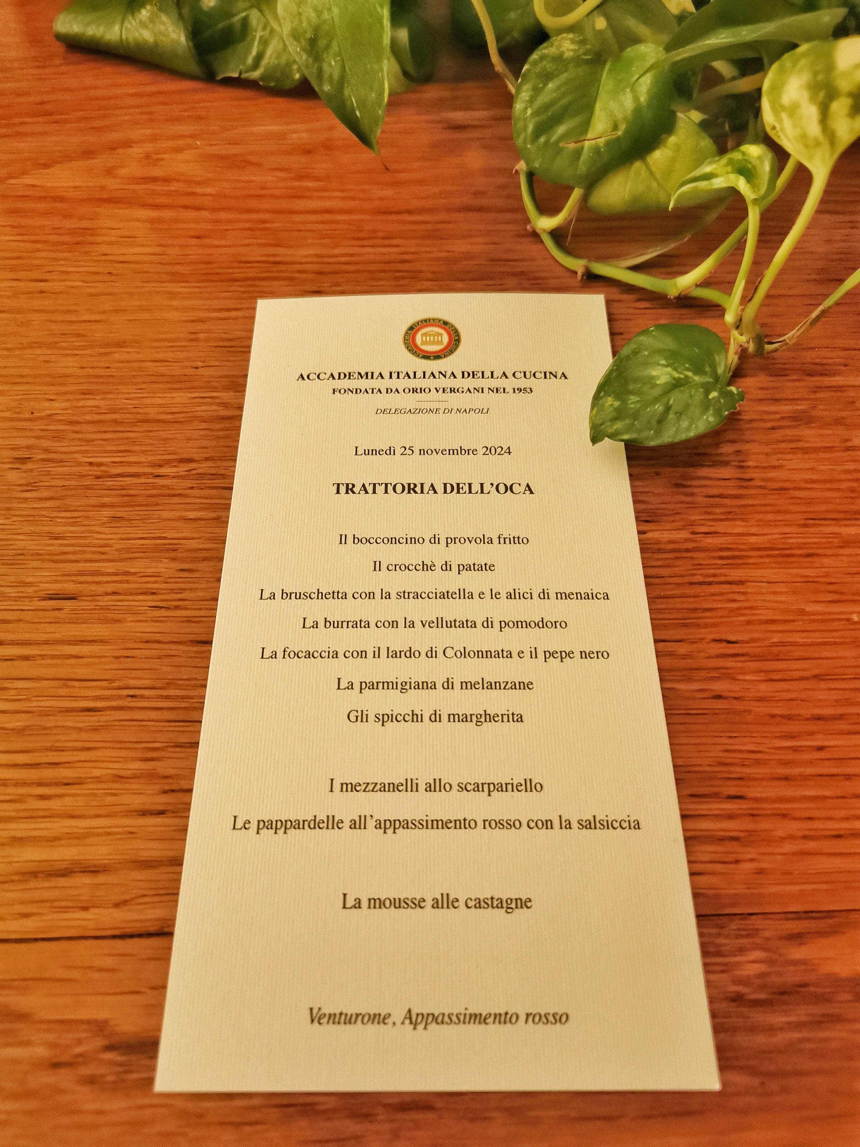 È alla “Trattoria dell’Oca” che si è tenuta la riunione conviviale di novembre della Delegazione Napoli. Come di consueto, l’appuntamento è stato caratterizzato da riflessioni e approfondimenti su questioni di interesse culinario. Nella scelta del tema “Il foie gras: una deliziosa controversia” un ruolo lo ha giocato certamente il nome della trattoria. Dalle sue presunte origini egiziane fino ai giorni nostri, la storia del foie gras è stata tratteggiata dall’Accademico Ruggero Rispo senza sorvolare sulla questione dell’ingozzamento, che rende il fegato grasso una delle preparazioni più eticamente controverse di tutta la Cucina. Scelta per la sua vocazione all’accoglienza e alla tradizione, la “Trattoria dell’Oca” ha confermato le aspettative. I crocchè di patate e la vellutata al pomodoro di contorno alla burrata hanno dimostrato quanto si possa imparare dal passato; la cottura perfetta dei mezzanelli allo scarpariello e l’equilibrio delle pappardelle all’Appassimento Rosso con la salsiccia sono state esempio di sincerità. Gradevolissima la mousse alle castagne di cui va rilevata la giusta dose di dolcezza.