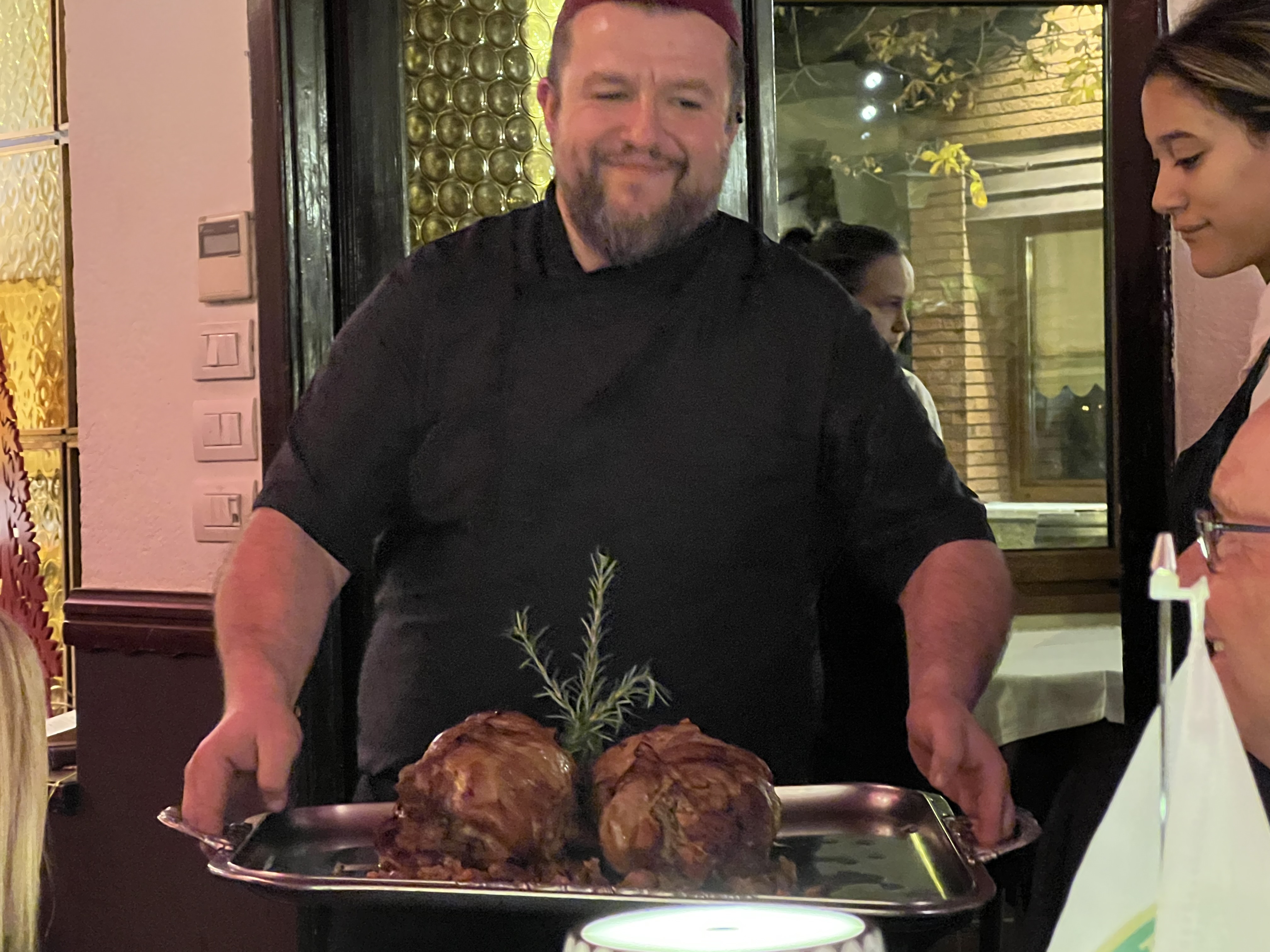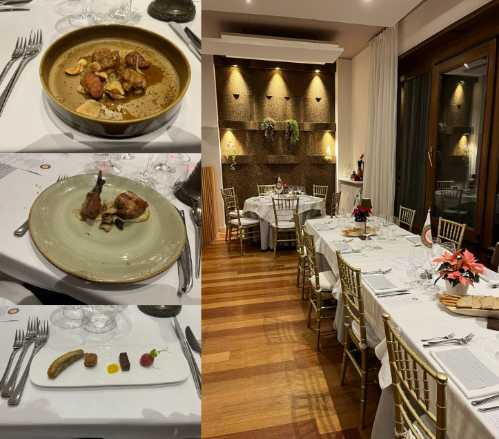 La cena degli Auguri si è svolta nella città più piccola d’Italia: Moncalvo. La Consulta ha scelto “Il Centrale” per il convivio trascorso in amicizia e serenità e con il cerimoniale per l’entrata di quattro nuovi Accademici. I cuochi Fabio e Cinzia hanno proposto un menù ricercato, arricchito da un tocco di fantasia e, al contempo, attento alle materie prime del territorio. Il menù proposto: aperitivo al tavolo con salsiccia di Bra, lingua con gelatina al mandarino, acciuga fritta e polpettina; antipasti con animella di vitello glassata al “Tosazu” accompagnata da topinambur grigliati e crema di buccia di limone, uovo therme con verdure invernali, salsa delicata all’acciuga e tartufo nero. Primo: raviolotti al gorgonzola, salsa alle pere e crumble di noci. Secondo: quaglia ripiena di frutta essiccata, sedano rapa e funghi. Autunno in Monferrato, il dolce, con pera cotta al moscato, zabaione, nocciola e gelato al tartufo.