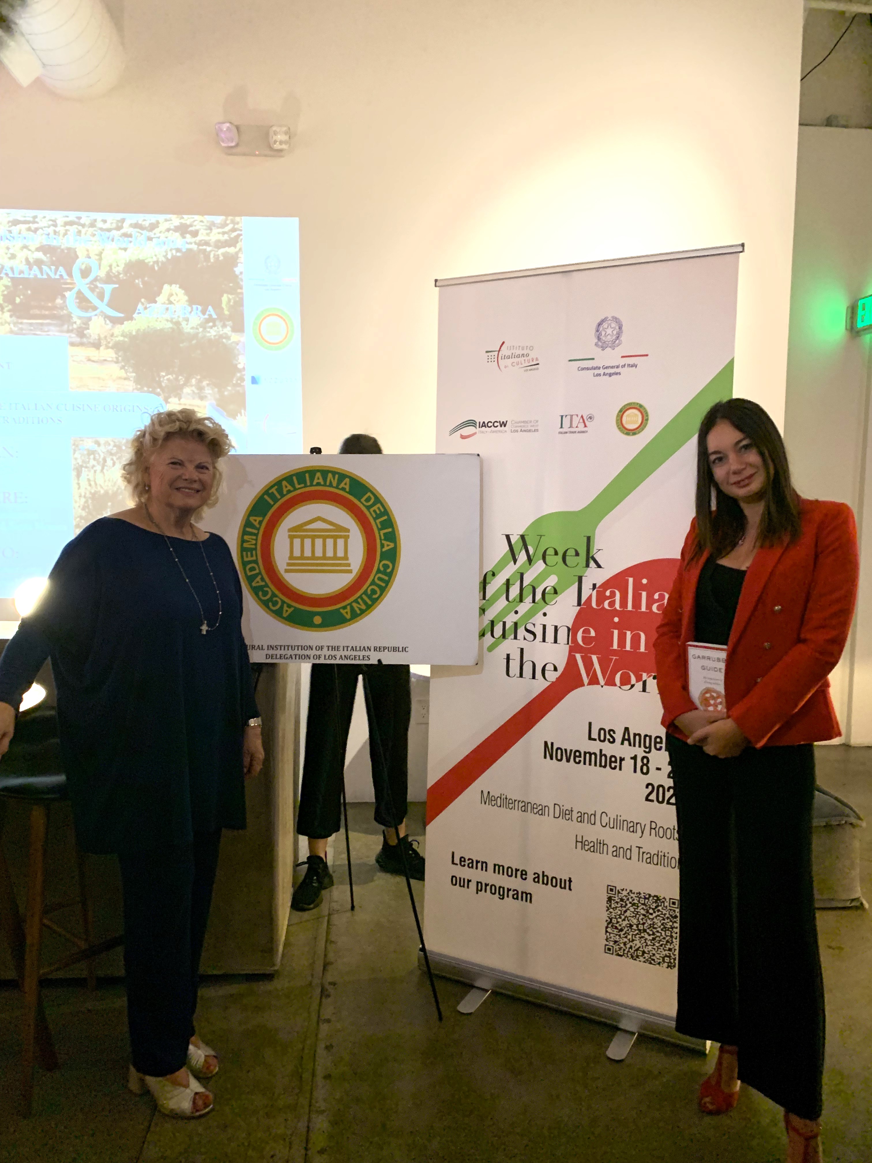 I vari eventi della IX edizione della Settimana, a Los Angeles, si sono conclusi con un convivio accademico, organizzato in collaborazione con il Consolato Generale e l’Istituto Italiano di Cultura, presso il ristorante La Puglia. Durante l'evento è stata presentata una pubblicazione a cura di Mariella Salvatori, Delegata di Los Angeles, con Alessia Patrignani, presidente dell’organizzazione culturale “Azzurra”. La Delegata ha illustrato l’operato dell'Accademia e la collaborazione con il Ministero degli Affari Esteri nell'ambito della SCIM. La Console d’Italia, Lorenza Errighi, ha sottolineato l'importanza della dieta mediterranea, ricordando che la cucina italiana è candidata a diventare Patrimonio Immateriale dell’Umanità UNESCO. Il menù, interamente pugliese, ha rispettato le tradizioni mediterranee della regione. La presentazione del libro The Garrubbo Guide, realizzata dall’avvocato italo-americano Edwin Garrubbo, Accademico della Delegazione New York Soho, ha suscitato grande interesse tra gli ospiti. L’autore ha condiviso le sue ricerche sulle ricette, tradizioni e prodotti italiani, frutto degli anni trascorsi in Italia.