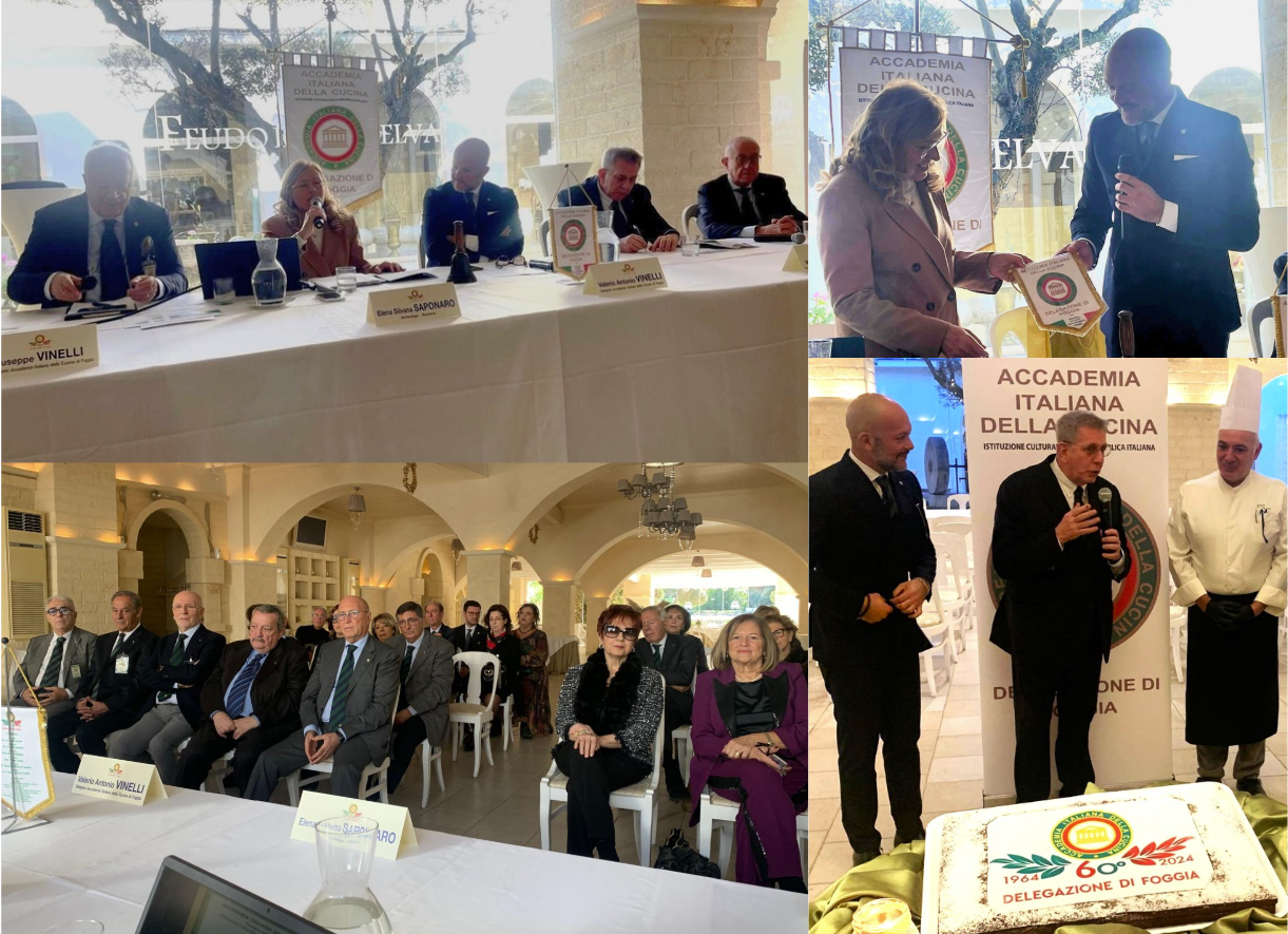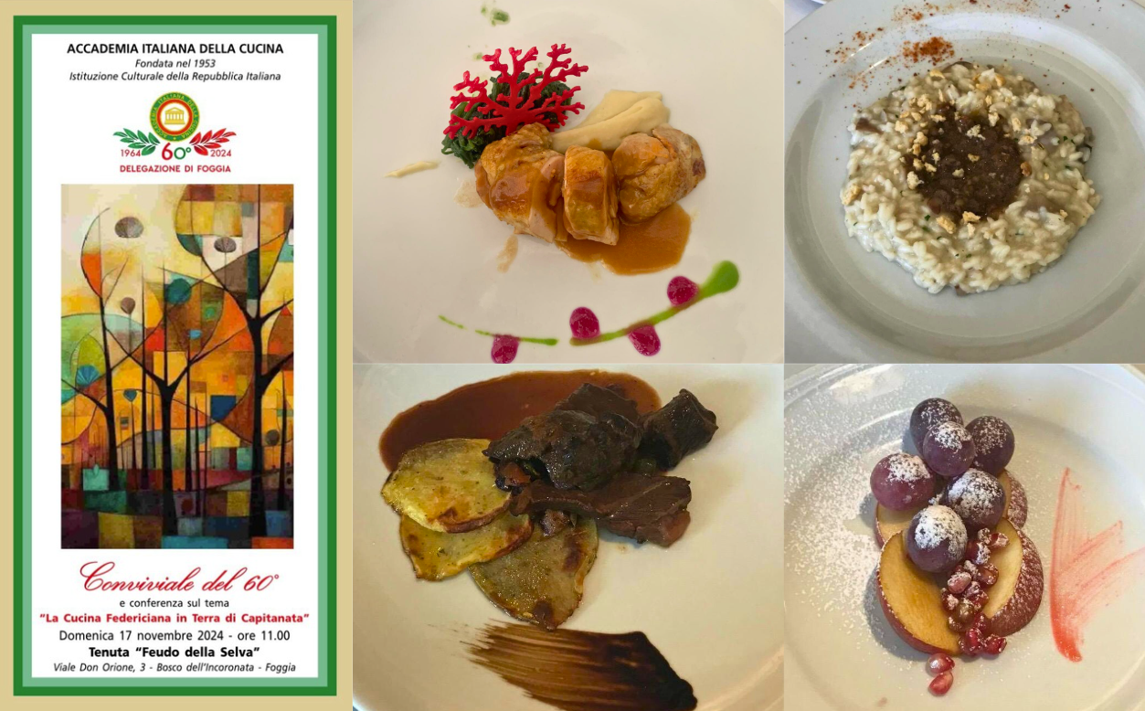 La Delegazione di Foggia ha celebrato il 60° anniversario della sua costituzione nella tenuta “Feudo della Selva”, nel bosco dell’Incoronata, con una partecipazione numerosa di Accademici e ospiti. Presenti tutti i rappresentanti delle Delegazioni della Puglia Nord: Bari, Castel del Monte, Altamura, Gargano e Foggia-Lucera. In rappresentanza del Presidente Paolo Petroni, ha presenziato il Vice Presidente Vicario Mimmo D’Alessio. Dopo l’introduzione del Delegato Valerio Antonio Vinelli e i saluti del Coordinatore della Puglia Nord, Vincenzo Rizzi, il Vice Delegato Giuseppe Vinelli ha esposto la storia della Delegazione, dalla cerimonia di costituzione, a cui partecipò il Vice Presidente dell’epoca Luigi Volpicelli, ai giorni nostri. La conferenza “La Cucina Federiciana in Terra di Capitanata”, tenuta dalla dr.ssa Elena Silvana Saponaro, archeologa, già direttrice del monumento di Castel del Monte, ha esplorato la cucina dell'epoca federiciana e i convivi del Puer Apuliae nel Palazzo Imperiale di Foggia, ormai completamente scomparso. Ha concluso gli interventi il Vice Presidente Vicario Mimmo D’Alessio, che si è congratulato con la Delegazione di Foggia per l’intensa attività svolta e per il coinvolgimento delle altre Delegazioni. Il pranzo, preparato dallo chef Pino Iacovo, ha proposto piatti tipici della cucina federiciana, come anguilla alla “scapece”, faraona, funghi porcini, cinghiale e caponata. La giornata si è conclusa con una torta a base di grano saraceno, mandorle e scorze d’arance con i simboli della Delegazione.