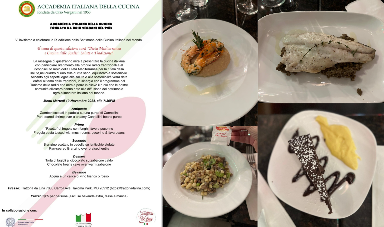 In occasione della IX Settimana della Cucina Italiana nel Mondo, e per il terzo anno consecutivo, la Delegazione di Washington DC ha organizzato, in collaborazione con l’Ambasciata d’Italia a Washington DC, una cena celebrativa presso il ristorante Trattoria da Lina a Takoma Park. Durante l’evento, la dottoressa Beatrice Ciorba, Attaché per l’Agricoltura e la Nutrizione presso l’Ambasciata, ha illustrato il suo lavoro nel garantire la sicurezza alimentare e il benessere. Alla serata hanno partecipato, oltre agli Accademici della Delegazione, rappresentanti dell’Ambasciata, in particolare dell’Ufficio Commerciale, nonché ospiti italiani e internazionali. Tra questi figuravano professori universitari, giornalisti e professionisti provenienti da vari Paesi, tutti accomunati dalla passione per la cucina italiana. L’evento si è così trasformato in un incontro non solo celebrativo, ma anche internazionale e particolarmente piacevole. La Delegata Maby Palmisano, nel suo saluto finale, ha presentato l’ultimo volume della Biblioteca di Cultura Gastronomica, dedicato ai legumi, già distribuito agli Accademici in occasione della Cena Ecumenica. Durante il suo intervento, ha condiviso alcune ricette tratte dal libro e ha chiesto allo chef Roberto Dejas se fosse possibile replicarne alcune nella cucina della Trattoria da Lina. La serata si è conclusa con un caloroso applauso e un evidente entusiasmo per future partecipazioni, confermando il successo dell’iniziativa.