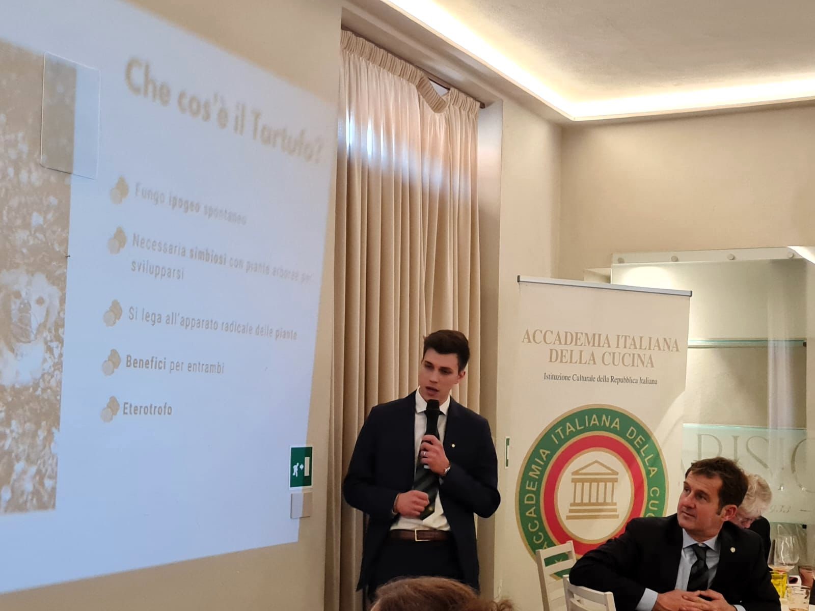 Riunione conviviale congiunta tra la Delegazione di Alessandria e la Delegazione del Monferrato presso il ristorante Nuovo Parisio. Gli Accademici alessandrini hanno accolto gli Accademici del Monferrato ad Acqui Terme per un convivio incentrato sul Tartufo Bianco pregiato. L'Accademico Luca Garruto ha illustrato i risultati della sua ricerca “Studio di tracciabilità e autenticazione del Tartufo Bianco pregiato dell’Alto Monferrato”, dimostrando con dati concreti come, grazie alla presenza di particolari componenti chimici e organici riscontrati nei terreni e nei tartufi, sia possibile tracciarne la provenienza. Alla conviviale erano presenti, oltre al Delegato del Monferrato Pietro Caire, il Consigliere Regionale Marco Protopapa, Piero Coco, presidente del Distretto del cibo “Colline delle Langhe e Monferrato”, insieme a Walter Astengo e, in rappresentanza dell’Istituto professionale alberghiero acquese, la Professoressa Samuela Mattarella. Come ha sottolineato il Delegato di Alessandria, Matteo Pastorino, si è trattato di un momento di incontro incentrato sull’amicizia, l’arte, la cultura e la tradizione gastronomica, in linea con i principi e i valori dell’Accademia Italiana della Cucina.