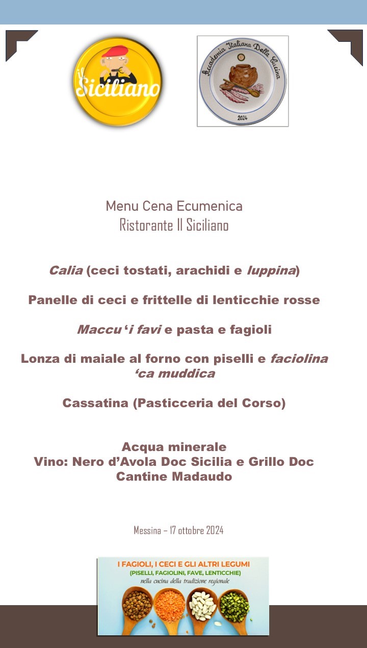Con il supporto della Consulta, la Delegazione ha individuato in centro città un locale dove celebrare l’Ecumenica per consentire la più corale partecipazione, nella consapevolezza che la produzione del fagiolo «carrazzo», tipica del territorio peloritano, trova le migliori trasformazioni culinarie in alcuni ristoranti dei Nebrodi. Una tipicità ricordata dal Delegato ed evidenziata dal volume dedicato al tema dell’anno, che elenca le varietà presenti in questa parte montuosa del messinese. La buona consuetudine della Trattoria il Siciliano di proporre alla clientela abituale, ma anche ai più curiosi avventori dei circuiti turistici, la «Zuppa del giorno» ha sodisfatto gli Accademici che hanno accolto positivamente la proposta del patron Danny Anna e dello chef Fabio di Stefano di far degustare: calia (ceci tostati, arachidi e luppina); panelle di ceci e crespelle di lenticchie rosse decorticate; maccu ‘i favi con finocchietto selvatico; pasta e fagioli; lonza di maiale al forno con piselli e faciolina ca muddica; cassatina della pasticceria del Corso. Generale apprezzamento per la selezione della cantina e il servizio ai tavoli.