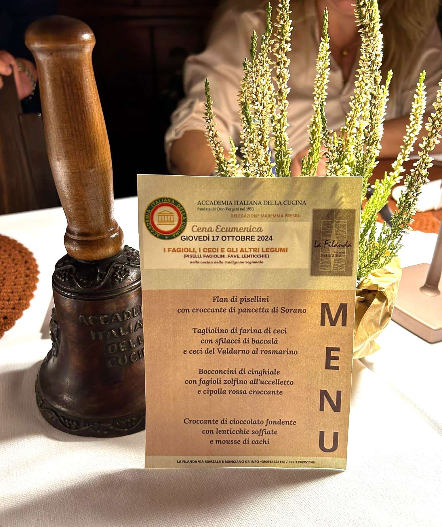 La prima cena ecumenica organizzata dalla nuova Delegata, Nunzia Costantini, si è tenuta alla Filanda di Manciano, un ristorante di fiducia noto per la qualità e l'originalità dei suoi piatti, grazie alla passione della chef Barbara Cannarsa. La serata, molto partecipata, è iniziata con un’interessante relazione della dottoressa Laura Zandonai, docente di scienza dell’alimentazione all’istituto Alberghiero di Orbetello e titolare di un’azienda agricola, che ha approfondito l’importanza dei legumi, un tempo considerati "la carne dei poveri", nella nostra dieta, soprattutto se abbinati ai cereali. Il menù, molto interessante, ha proposto vari tipi di legumi rivisitati in maniera estrosa e ogni piatto è stato presentato in sintonia con la sontuosa decorazione della tavola, squisitamente autunnale. Tra le portate più apprezzate, il flan di pisellini con croccante di pancetta di Sorano e il croccante di cioccolato fondente con lenticchie soffiate e mousse di cachi. Durante la cena, la Delegata ha accolto tre nuove Accademiche a cui sono stati consegnati il materiale istituzionale e la pubblicazione sul tema dell’anno, omaggiato anche a tutti gli altri Accademici presenti.