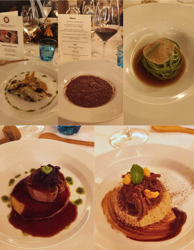 Il tema della Conviviale Ecumenica 2024 non favoriva il territorio di Ampezzo per ovvie ragioni ambientali e climatiche: si potevano coltivare con discreti risultati le fave, ma altri legumi erano praticamente assenti. Ciononostante la famiglia Gregori, del ristorante “Al Capriolo“ di Vodo di Cadore, è riuscita con il cuoco Francesco Paonessa ed i Simposiarchi Monica De Mattia e Diego Dipol a riprendere ricette della tradizione ed utilizzare i legumi nel menu proposto anche con quanto reperibile in territori di minore altitudine. Va riconosciuto quindi alla cucina un grande lavoro di ricerca storica ed innovazione allo stesso tempo. Relatrice della serata la Presidente dell'Union de i Ladis de Anpezo Elsa Zardini, che con sapienza e simpatia ha fatto compiere ai presenti un vero salto nel tempo, preziosa custode delle memorie della valle.
