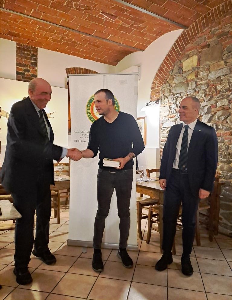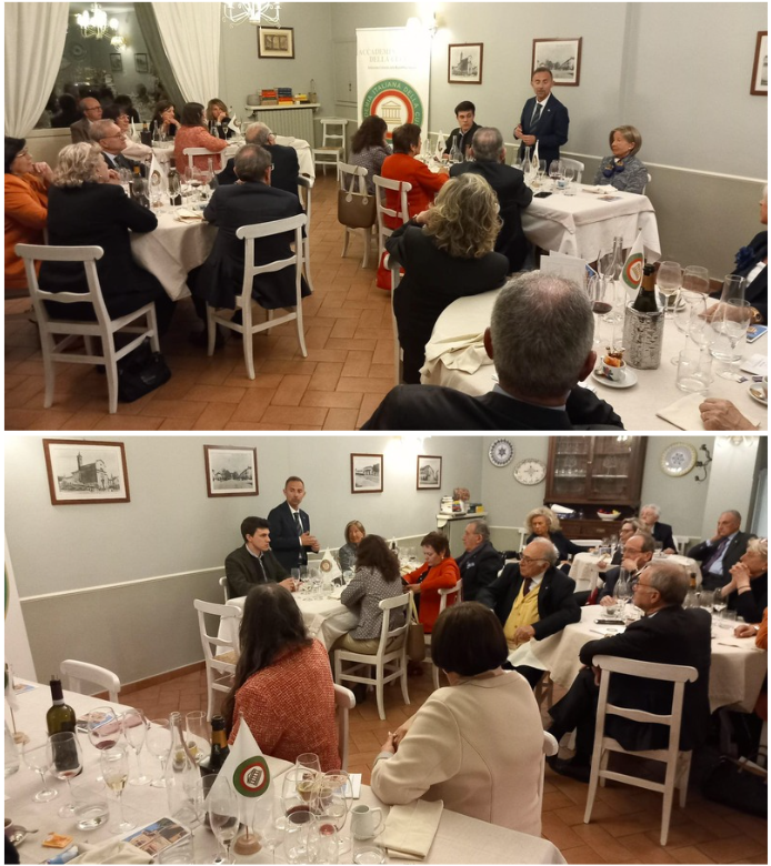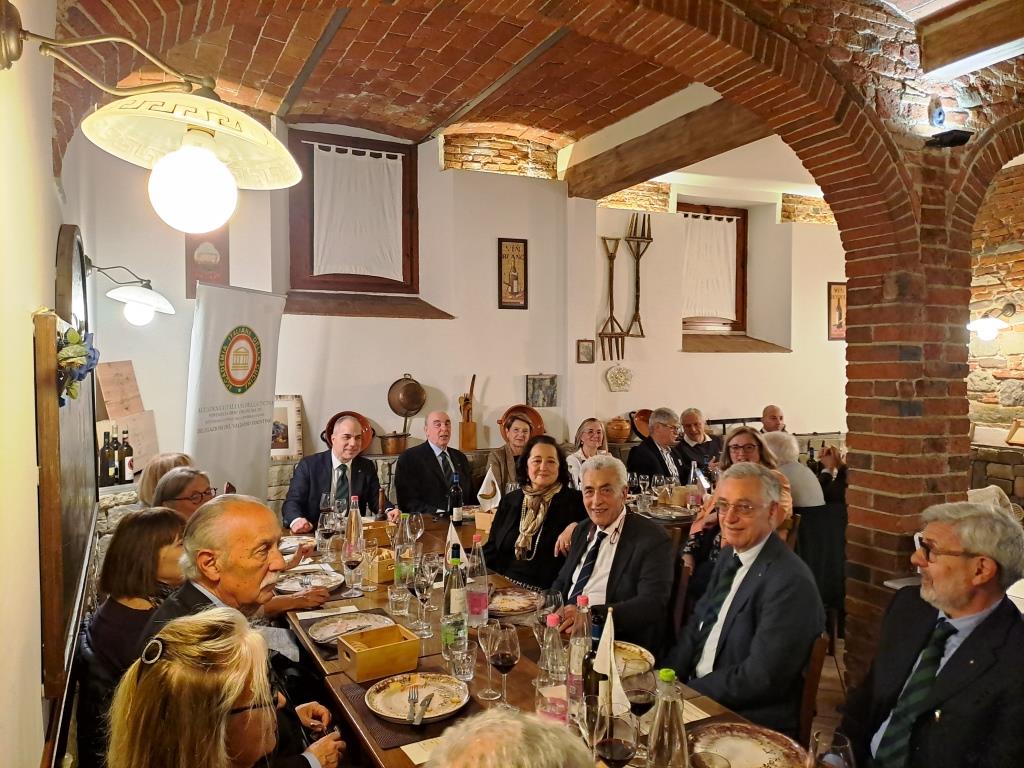 La riunione conviviale si è svolta all’Osteria Il Postiglione, un ristorante alle porte di Figline Valdarno, per la prima volta visitato dalla Delegazione che è stata accolta in un ambiente riservato del ristorante, in un’atmosfera rustica e accogliente. La cucina è basata su ingredienti freschi e di alta qualità, con un’attenzione particolare alle produzioni locali. Il ristorante ha anche un angolo gastronomico con vendita di prodotti freschi locali della tradizione toscana. Il Simposiarca Marco Massagli ha concordato insieme al titolare Davide Martinez e al cuoco Daniele Del Mira un menù gustoso della tradizione locale. Dopo un antipasto con crostini neri e cipolla caramellata, affettati misti e formaggi, si sono susseguiti: maccheroncini alla cinta senese, pappardelle al sugo di nana, peposo “alla fornacina” con ceci rosa e fagioli zolfini e, per finire, cantucci con Vin Santo. In abbinamento è stato scelto un ottimo rosso Casa al Piano di Bolgheri. Durante il convivio il Simposiarca ha descritto i piatti della serata: la loro coltivazione, la loro preparazione e alcuni aneddoti sull’origine del peposo. Tutto il menù ha ottenuto un’ottima votazione, in particolare i maccheroncini, il peposo che è risultato morbido e saporito, i cantucci fatti in casa. Il servizio è stato gentile e premuroso. Al termine della serata il Delegato Sandro Fusari e il Simposiarca hanno ringraziato il titolare con una collezione di volumi dell’Accademia.