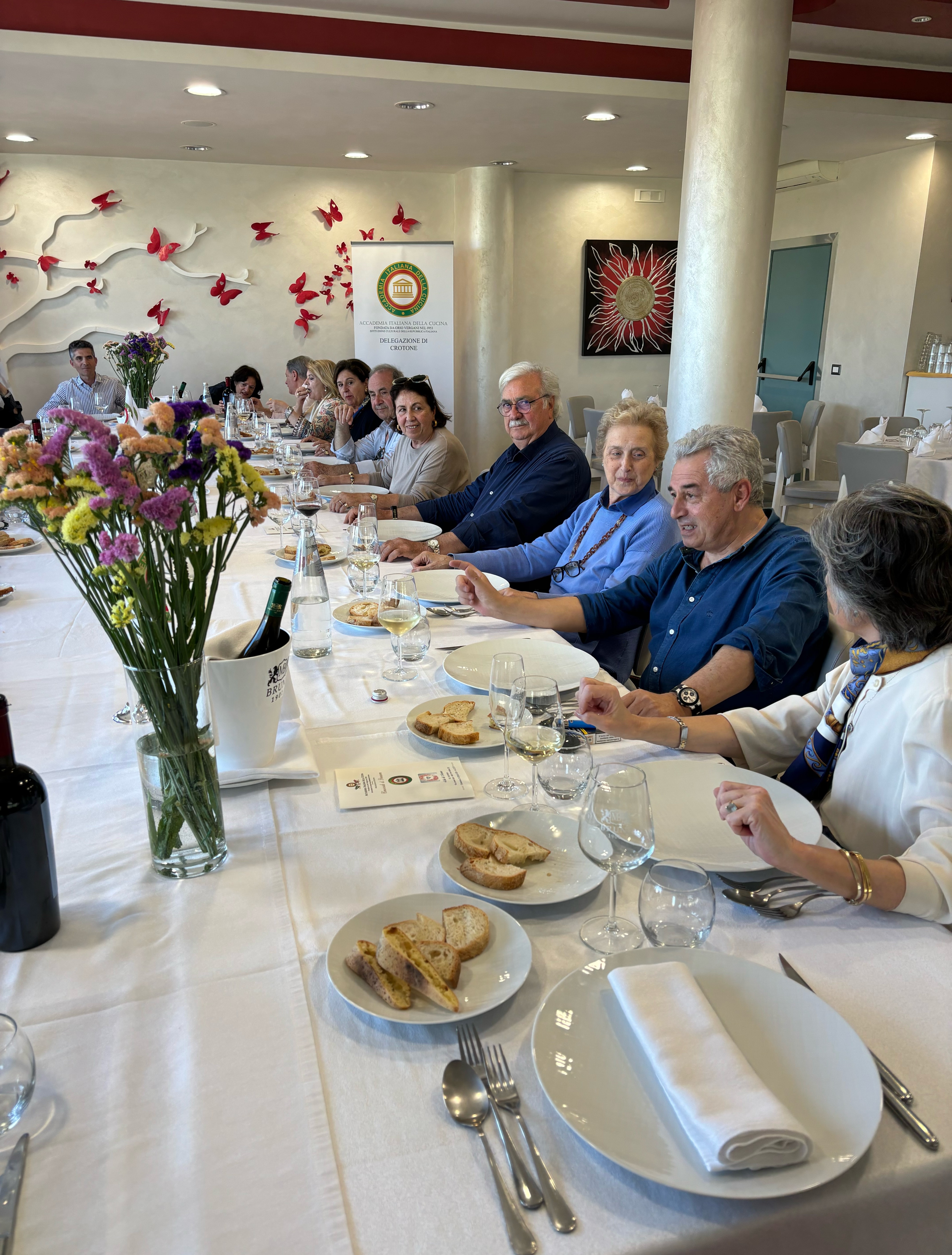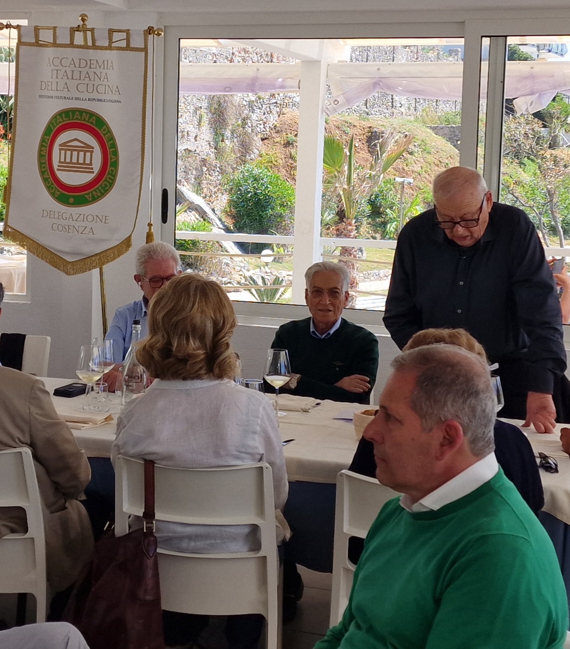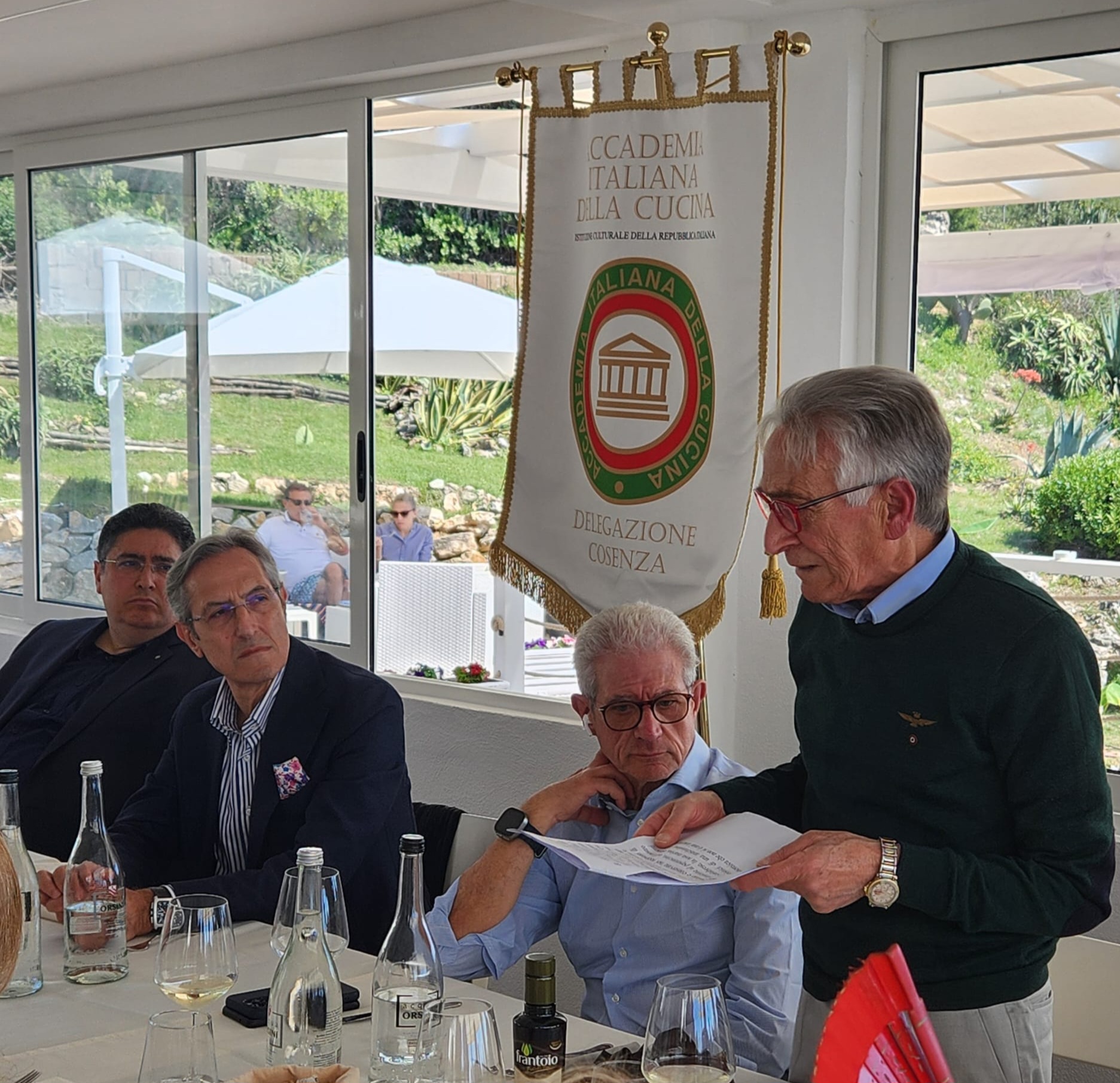La Delegazione di Cosenza si è preparata ad accogliere la bella stagione che incede come si sarebbe fatto con un amico che torna. La ben indovinata combinazione tra la ridente posizione del ristorante “Da Lucio” appena poggiato sugli scogli, con la possibilità di guardare da un lato all’isolotto di Cirella e dall’altro al golfo di Policastro, in uno con una gradevole giornata di sole ha finito con l’esaltare lo spirito accademico della convivialità (foto 1). Le interessanti relazioni dei Simposiarchi Franco Gentile e Pietro Vivona (foto 2 e 3) che hanno spaziato dagli approfondimenti sul pescato del periodo - con particolare riguardo alle specie che iniziano a tornare sotto costa e alle loro caratteristiche organolettiche e nutrizionali - fino alla storia delle antiche salagioni di pesce azzurro che, seguendo l’evoluzione dei tempi, resistono ancora ai giorni nostri. Ricca, varia ed apprezzata la proposta dello chef tra preparazioni in umido, fritte e al forno, con qualche citazione della migliore tradizione locale come le “raganelle di alici” (foto 4). La circostanza è risultata utile per accogliere in maniera formale i nuovi Accademici Marco Ghionna e Roberto Siciliano.