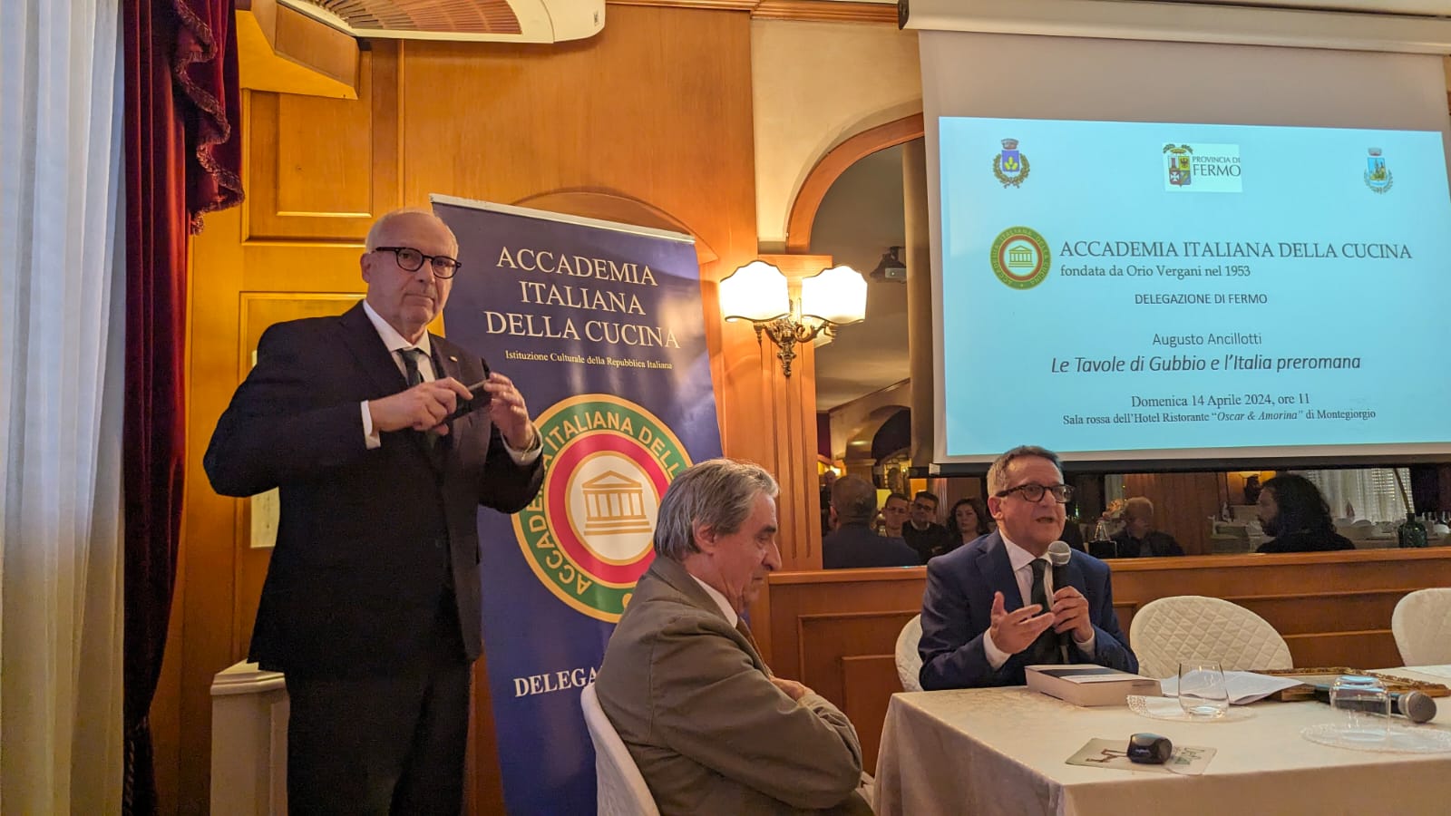 Per l’evento incentrato sulle Tavole Eugubine organizzato dalla Delegazione, autorità, relatori, Accademici e ospiti si sono ritrovati numerosi presso l’Hotel Ristorante OSCAR & AMORINA di Montegiorgio. Questo evento di rilievo, che ha goduto del patrocinio della Provincia di Fermo, del Comune di Montegiorgio e del Comune di Belmonte Piceno, si è aperto con il convegno: le tavole di Gubbio e l’Italia preromana, agli albori della Dieta Mediterranea e proseguito con un pranzo a tema. Il Simposiarca di turno, Lando Siliquini, Presidente del Laboratorio Piceno per la Dieta Mediterranea, ha proposto una giornata di approfondimento delle origini dell’enogastronomia picena di cui le tavole sono una preziosa testimonianza. Ai saluti del Delegato di Fermo Fabio Torresi sono seguiti quelli istituzionali del Presidente della Provincia e Sindaco di Montegiorgio Michele Ortenzi e del Sindaco di Belmonte Piceno, Ivano Bascioni e del CT Marche (AIC) Sandro Marani. Ha aperto i lavori il prof. Augusto Ancillotti, già ordinario di Glottologia e Linguistica all’Università di Perugia, cui ha fatto seguito Giacomo Recchioni, dottore in etno-antropologia, con le conclusioni di Lando Siliquini. Per il menu del pranzo conviviale che ne è seguito, Francesco Conti patron del ristorante, ha tratto spunto dall’elenco delle parole umbre antiche presenti nelle Tavole creato con grande disponibilità dal prof. Ancillotti. In chiusura il Delegato ha ringraziato i partecipanti, le autorità e gli illustri ospiti per aver dato vita ad una giornata da ricordare.