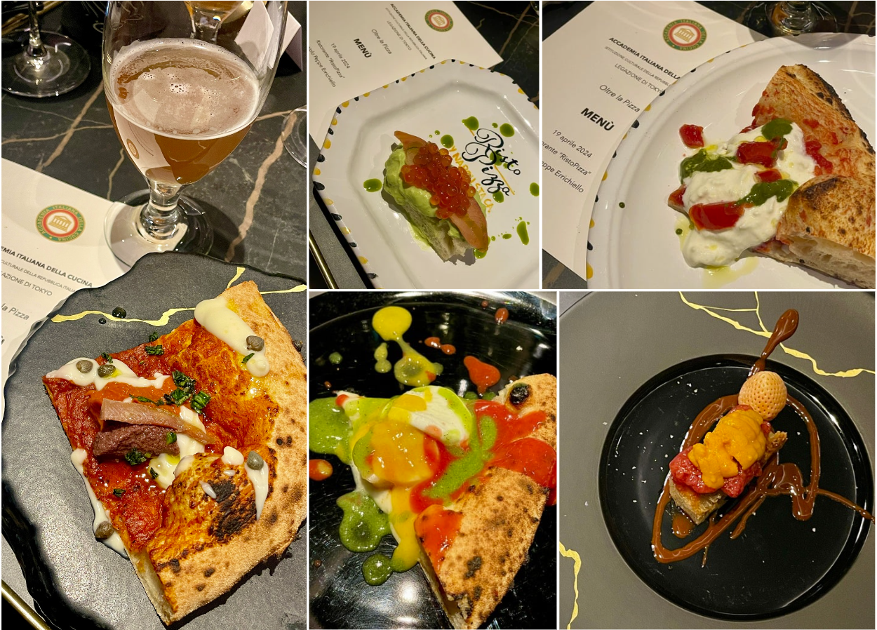 Esiste qualcosa di più “classico” di una pizza e birra con amici nel fine settimana? Solo che questa volta la Legazione di Tokyo, sotto la guida del Simposiarca Matteo Belfiore, si è riunita nel nuovo ristorante di un pizzaiolo di vecchia conoscenza che ha avuto un’idea innovativa. Parliamo di Giuseppe Errichiello e del suo Ristopizza all’interno del nuovo e prestigioso complesso di Azabudai Hills. Un impasto tecnicamente impeccabile, toppings accuratamente studiati e tanta fantasia partenopea. La marinara sbagliata, la pizza psichedelica e poi la margherita in Giappone, il futuro della salsiccia e friarielli, la margherita revolution, per finire in dolcezza con la pizza ricci di mare e fragole che ha davvero sorpreso i presenti. Ma tutto questo non ha scalzato la pizza Margherita che è stato il primo assaggio: buona, rassicurante, come una mamma che ha condotto per mano gli Accademici a provare tutto il resto con la certezza di non rimanere delusi e con l’unica raccomandazione di mantenere la mente aperta e di pensare al futuro. Questo il menù degustazione che Giuseppe Errichiello ha proposto ad un entusiasta gruppo di Accademici che si è complimentato anche per l’abbinamento dei vini e delle birre in accompagnamento.