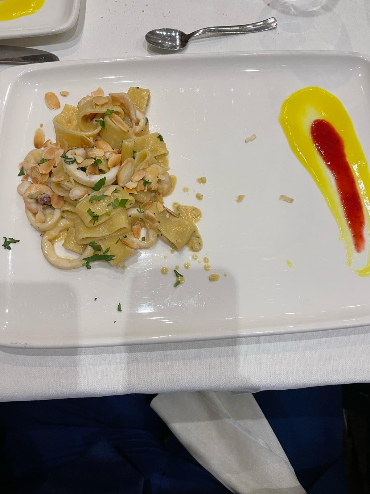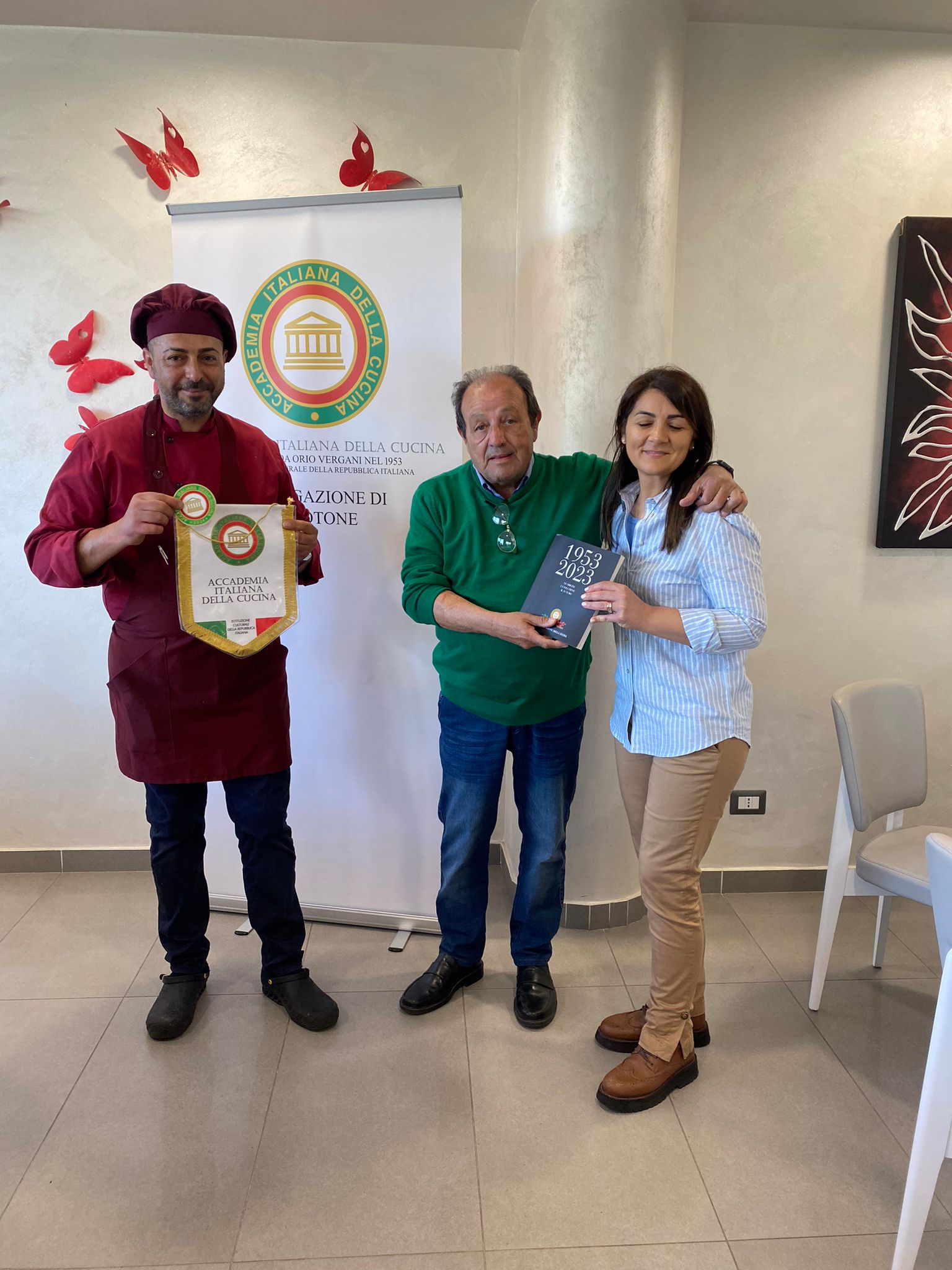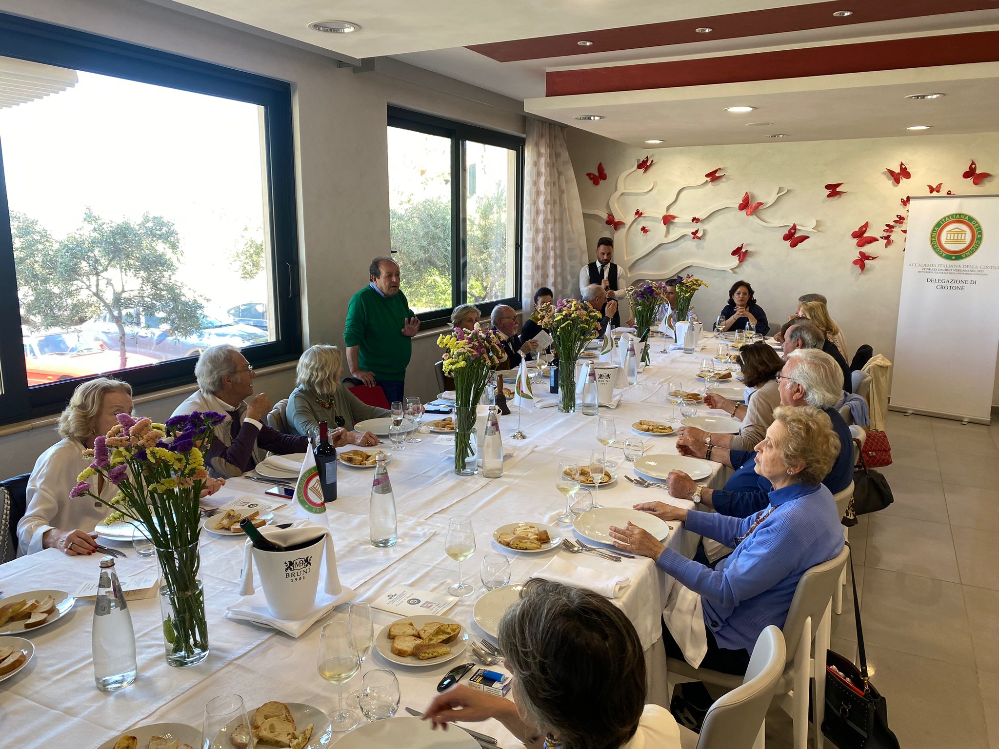 La Delegazione di Crotone ha organizzato la riunione conviviale di primavera dandosi appuntamento sulla litoranea che costeggia il mare al Ristorante “Lido’ del Miramar“ a Torre Melissa. Un pranzo completamente a base di pesce. Tiziana ha accolto con affabilità gli Accademici e con freschi calici di benvenuto e sfiziosi bocconcini in pastella. Per il convivio è stata riservata una sala alla Delegazione, ben curata con tavolo unico adorno di fiori di campo di primavera. Poi sono stati serviti a tavola gustosi antipasti preparati con cura e dedizione dallo chef Pietro il quale ha fatto seguire un prelibato e delicato risotto alla crema di scampi con un tocco di polvere di liquirizia di Calabria e un assaggio di paccheri ai frutti di mare. Come seconda portata, rana pescatrice con cipolle di Tropea caramellate e cicoria selvatica che ha deliziato tutti. Fragole e gelato al limone e tartufi gelati di Pizzo hanno chiuso golosamente il convivio. Ottimi i vini dalle Cantine Bruni sia il Rosso San Giù che il Bianco Marigiù. Un cenno particolare lo merita il servizio per la puntualità, lo stile, la discrezione e la professionalità. Allo chef Pietro le congratulazioni della Delegazione per prediligere i prodotti e le materie prime esclusivamente del territorio.