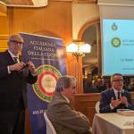 La riunione conviviale di primavera tenutasi presso il ristorante Lago Scin di Cortina d’Ampezzo e organizzata dai Simposiarchi Alessandro Degan e Renzo Zagallo, ha avuto come tema la “Musica a Tavola”. Nel corso della serata, l’Accademica e relatrice Paola Franco ha compiuto un rapido excursus storico sulla presenza della musica a tavola: iniziando dall’era mesopotamica, ha attraversato le antiche civiltà, il Medioevo, il Rinascimento, le corti francesi, tedesche ed inglesi e le opere liriche, sino a giungere al novecento con Leonard Bernstein e le creazioni contemporanee. La cena ha visto in tavola piatti inconsueti, come il risotto mantecato agli asparagi e rane, i medaglioni di cervo con purè di ceci e pere al vino rosso e i fiori di zucca dolci in pastella con salsa all’arancio. Nella calda e accogliente atmosfera creatasi è stato ufficializzato l’ingresso dei tre nuovi Accademici Patrizia Mini, Lucia Nicolardi e Nico De Villa: a loro il nostro sincero benvenuto.