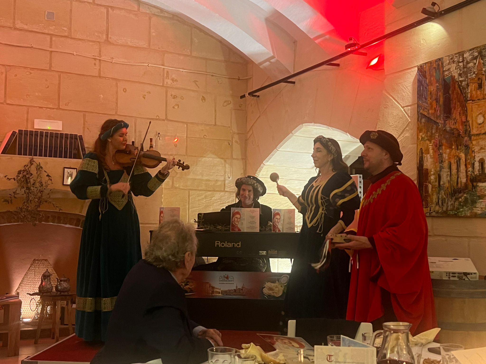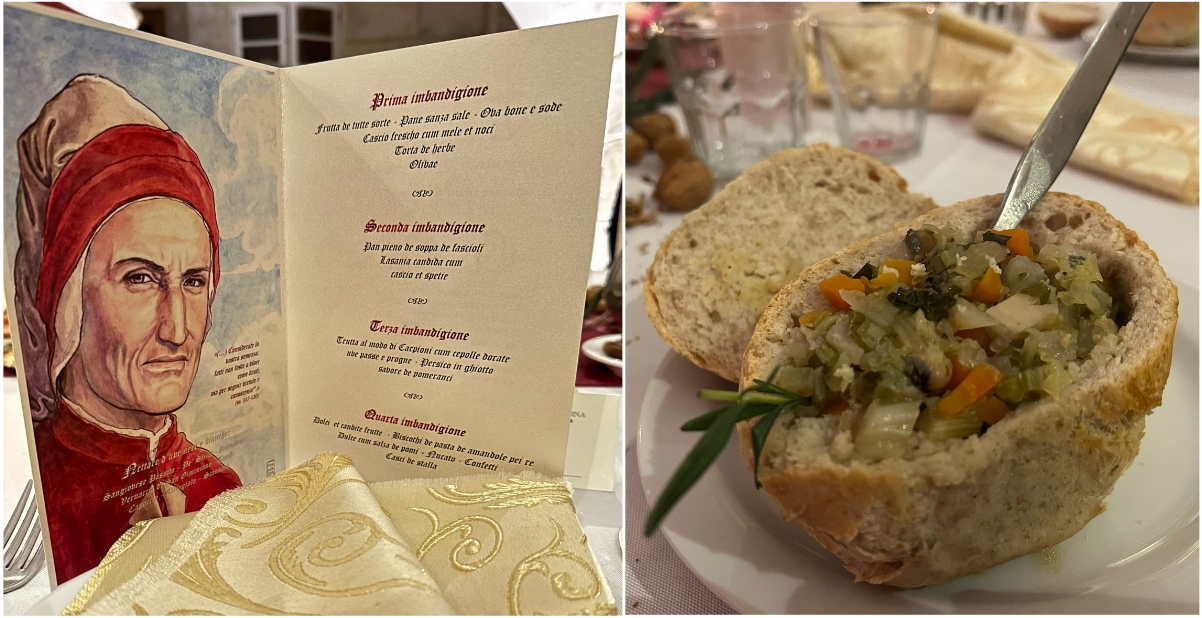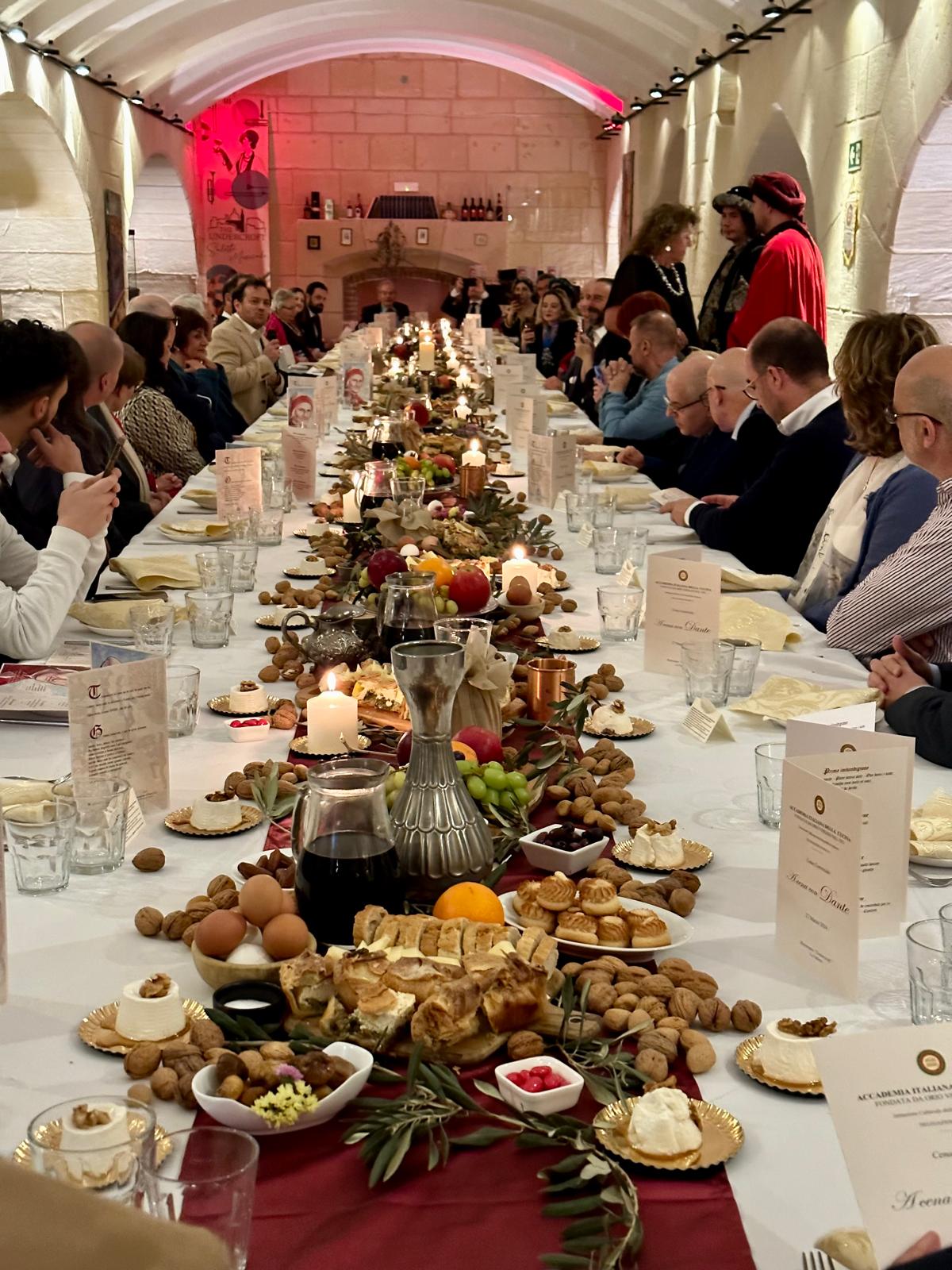 L’ampia sala del ristorante Undercroft, con le sue scenografiche arcate, è stata teatro della celebrazione del “ Dantedì” a Malta. L’evento, che si è svolto col patrocinio dell’ambasciata d’Italia a Malta e in collaborazione con Fondazione Italiani.it e Costantino Films, è stato dedicato a Durante degli Alighieri, detto Dante, e al periodo in cui visse. Insieme alla riconosciuta grandezza del Sommo Poeta è emersa l’insolita immagine di un Dante poco incline ai piaceri della tavola che, novello “nutrizionista” trecentesco, punisce coloro che si macchiano del peccato capitale della gola, mettendoli all’Inferno. Il menu proposto per la serata è stato autenticamente medievale sia nella preparazione dei piatti scelti da ricettari dell’epoca, resi gradevoli al palato da un sapiente uso delle spezie, sia nel rigido ordine della loro presentazione, come richiesto dalla scienza medica del tempo, che nell’essere rigorosamente di “magro”, nell’osservanza delle consuetudini liturgiche del periodo quaresimale. Per contrasto, la tavola è stata approntata in modo sontuoso. Ad allietare gli ospiti non è mancato neppure l’entremet, una singolare interpretazione di musica medievale eseguita da Accademici in costumi d’epoca generosamente contribuiti dall’Associazione “Il Mastrogiurato” di Lanciano. La serata si è conclusa con il conferimento del titolo di accademico a quattro “postulantes”, risultati più che meritevoli di ricevere le insegne accademiche, in una sentita cerimonia e fra gli applausi di oltre sessanta convitati.