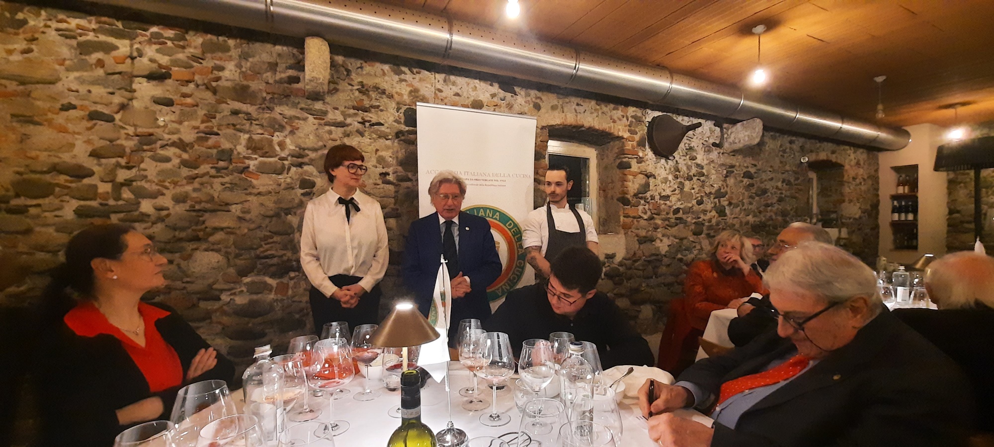Alcuni versi del poeta dialettale veronese Berto Barbarani, recitati dal Simposiarca Roberto Fostini, hanno donato il benvenuto alla Delegazione. Il luogo, l'Osteria da Morandin, una delle storiche osterie della città. Una delle poche, rimaste veraci, tra le mura scaligere. Un luogo d’altri tempi, che serve piatti tipici della cucina del territorio. Una saletta accogliente, poco distante dal bancone d’ingresso, dove vengono serviti “goti e cicchetti” a chi necessita di ristoro. Il menu prevede un lungo e gustoso percorso gastronomico. Cotechino e verze, le ambite polpette, nervetti e cipolla, pasta e fagioli e gli straordinari bigoli col musso. A seguire, la pastisada de caval con polenta. Prima dei saluti finali, un racconto emozionante sulle osterie di Verona curato dalla graditissima ospite, Francesca Capobianco. Scrittrice, appassionata di memorie veronesi ed autrice del volume “Goti Ostrogoti e mezigoti, guida alle osterie di Verona”. Un plauso all’ottima riuscita della serata al caro Accademico Roberto ed alla titolare del locale, Signora Sofia. Quest’ultima, impeccabile esempio di professionalità’ ed accoglienza. Lunga vita alle osterie, che mantengono intatte le loro precarietà.
