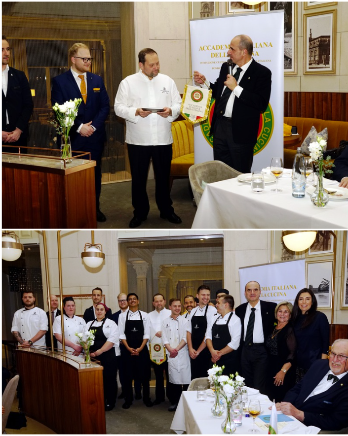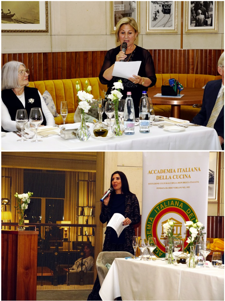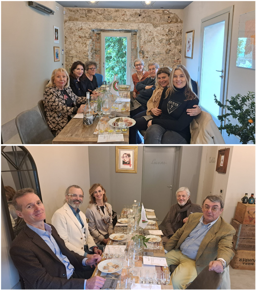 Camminando in una zona signorile di Milano vicino a Corso Vercelli, si raggiunge una via appartata priva di locali dove le insegne del ristorante Bianca accolgono i passanti. Un luminoso locale e una veranda hanno fatto da sfondo alla riunione conviviale della cultura. Presente sul territorio dal 2009, è da sei anni sotto la guida esperta di Fabio Pareto. In cucina Kevin Avino, giovane talento che si è formato al fianco di Andrea Aprea al Park Hyatt. Il Simposiarca Consultore Francesco Zappone ha svelato curiosità del menù di pesce abbinato a materie prime che raccontano un’identità che nasce lungo il Piave, prodotte dall’azienda agricola di Leonardo Tumiotto. Come l’olio e.v.o, le uova di galline di razze Araucana e Livornese di Salgareda con tartufo bianchetto di Norcia, i pistilli di zafferano di Salgareda per la crema di patate da accompagnare alla ricciola. Ha sublimato i palati il chitarrino Verrigni ai ricci di mare. In dialogo con queste storie e percorsi, insieme al Vice Delegato Davide Vignotti, gli Accademici si sono immersi nell’innovazione che parla a tavola dipingendo possibili scenari dall’ntelligenza artificiale al microbiota, volti al gusto del benessere. Con i commenti su una visione internazionale da parte di Silvio Conforti, celebrato per i suoi 25 anni di Accademia iniziati a Zurigo, e John Leopoldo Fiorilla Di Santa Croce, ospite accademico della Delegazione New York.