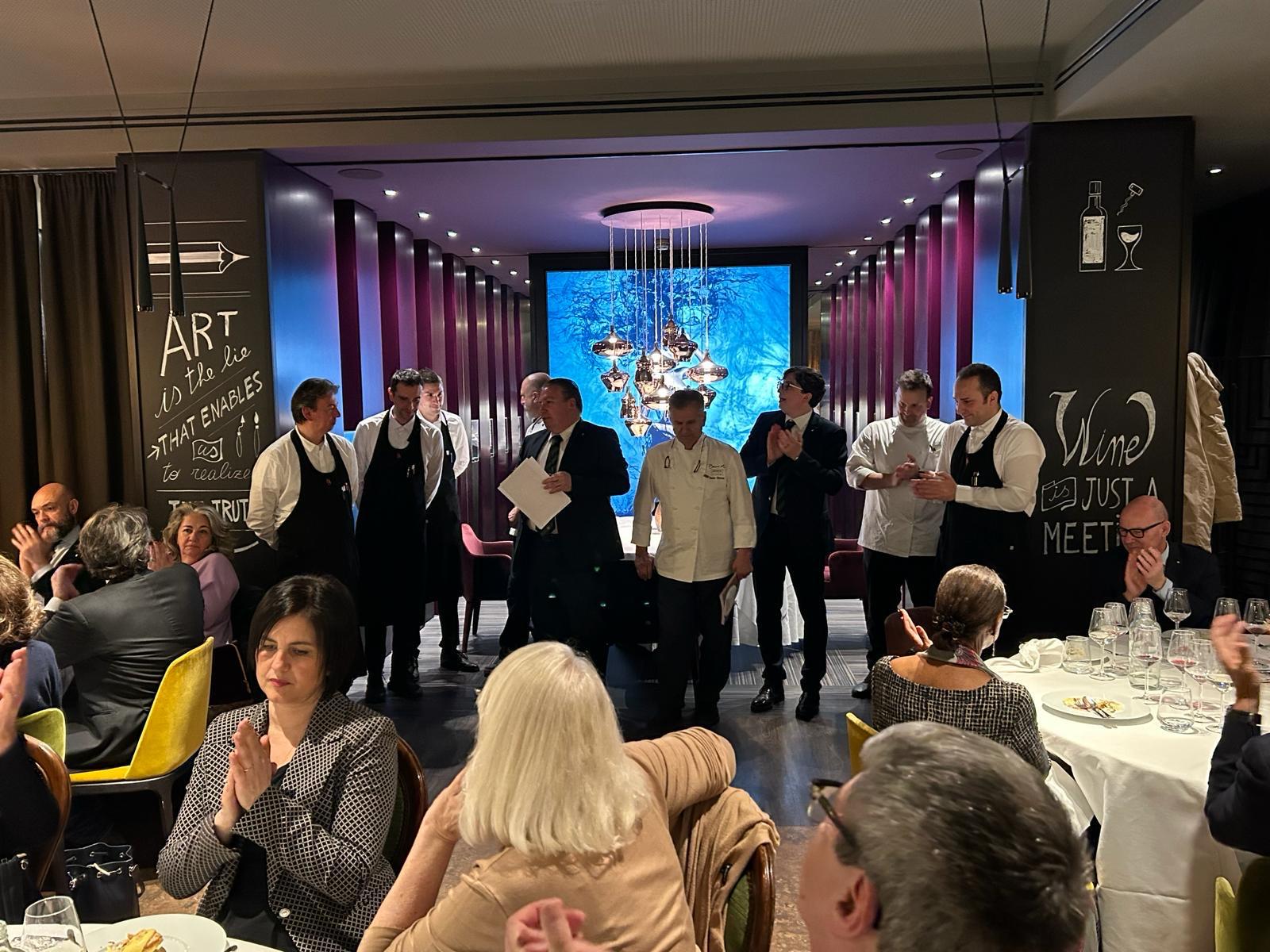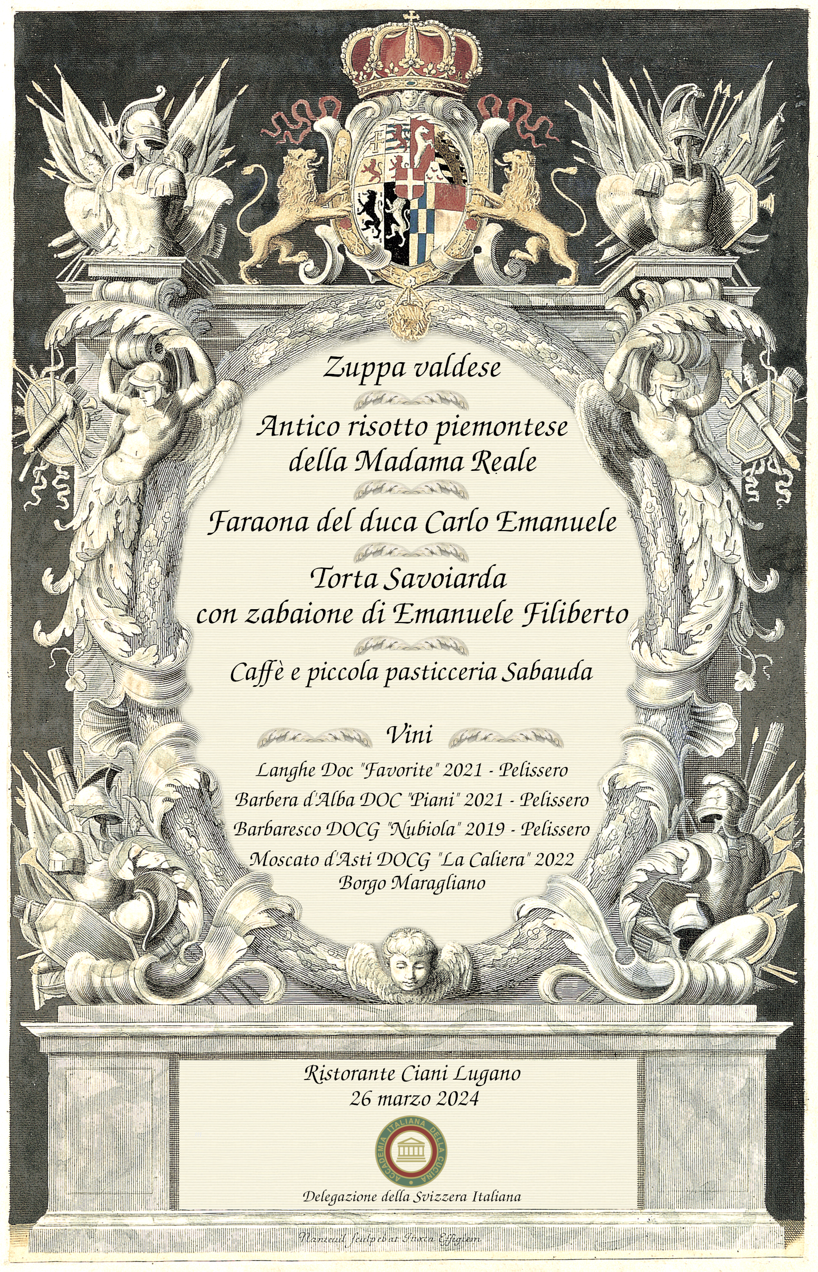 La prima riunione conviviale del 2024, dedicata alla cultura, si è svolta come ormai da tradizione presso l’iconico ristorante "Ciani Lugano", nel parco della città affacciata sul Lago Ceresio. Lo speciale convivio ha fatto rivivere a tutti gli Accademici e ai loro ospiti un'esperienza unica, ossia quella di tornare indietro nei secoli, assaporando delle pietanze tratte da antiche ricette, rivisitate dallo chef Ranza, portando a riscoprire la civiltà della tavola sabauda, sia dal punto di vista gastronomico ed enologico, sia da quello musicale grazie ai selezionati brani dei compositori che suonarono proprio alla corte ducale. Ogni piatto appositamente scelto ha avuto un commento storico, arricchito da leggende e da curiosi aneddoti, tutti brillantemente illustrati dal Simposiarca della serata Francesco Cerea, docente universitario e consultore della Delegazione della Svizzera Italiana. Il menu proposto, grazie alla maestria dello chef Dario Ranza, Premio Giovanni Nuvoletti 2020, ha saputo riportare, con l’ausilio delle melodie d’epoca, tutti i convitati ai fasti della Corte torinese d’antico regime. Alla cena hanno partecipato 45 ospiti, tutti entusiasti della qualità gastronomica offerta e della peculiare esperienza culturale vissuta.