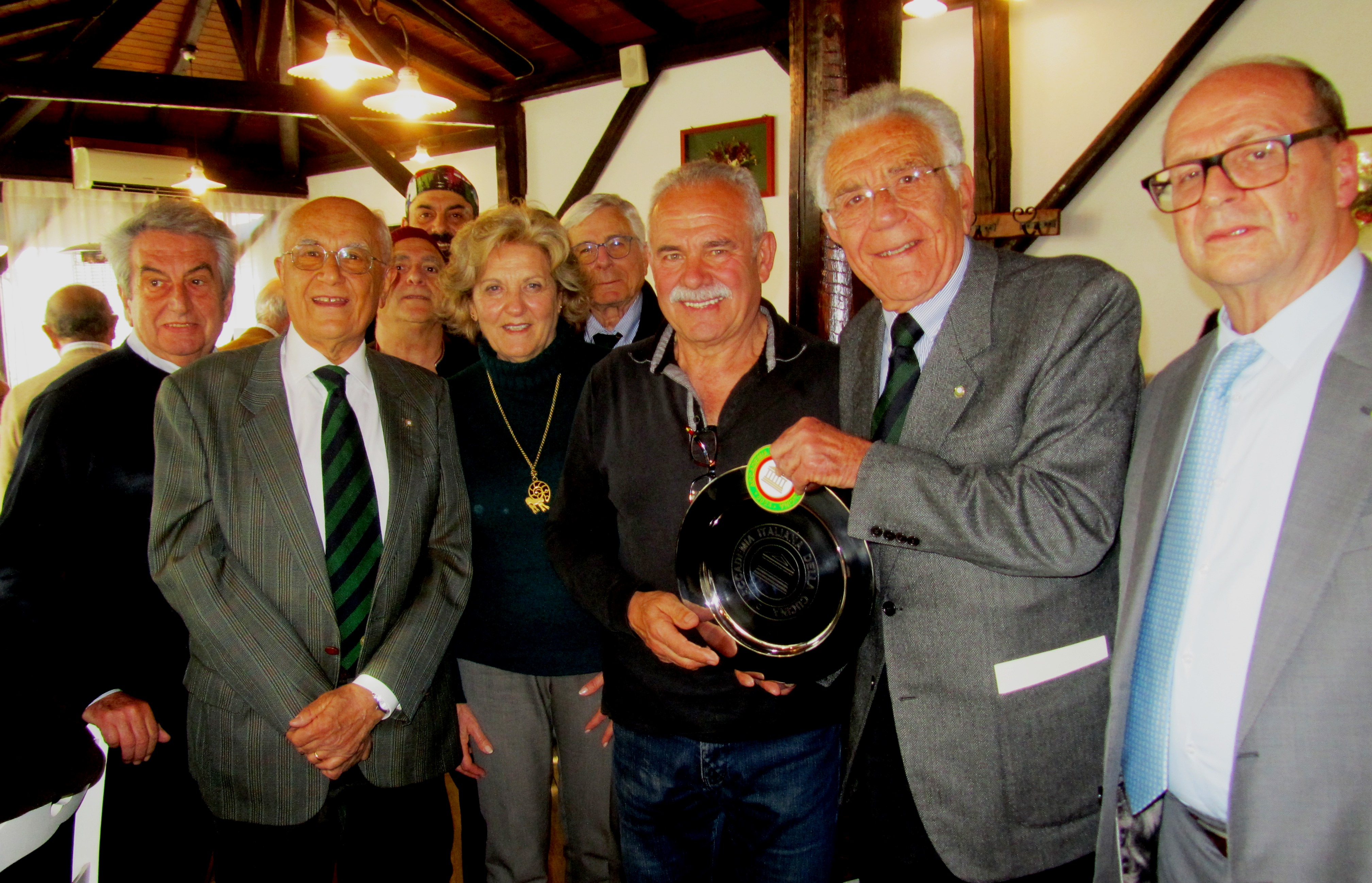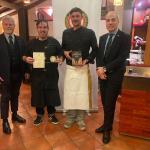 Una folta rappresentanza della Delegazione con numerosi graditi ospiti ha visitato la trattoria Fratelli Borrello, nelle campagne di Sinagra sulle prime pendici dei monti Nebrodi, che ha proposto un menu compiutamente rispettoso della tradizione e della disponibilità di materie prime del territorio del suino nero. Il Delegato ha introdotto la riunione conviviale intrattenendo brevemente l’accogliente sala gremita e riservata alla Delegazione (Foto 1) che ha espresso un’unanime valutazione di eccellenza. Numerosi e appropriati sono stati i commenti dei presenti che hanno stimolato anche un breve dibattito. La Consulta al completo, in accordo con i convinti e meritati applausi (Foto 2) , ha voluto consegnare a Borrello, allo chef e al suo aiuto il piatto d’argento dell’Accademia orgogliosamente e immediatamente esposto nel locale.