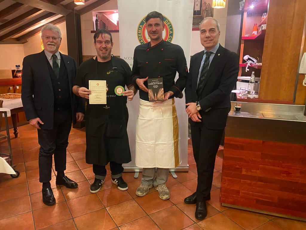 La riunione conviviale della cultura si è tenuta presso il ristorante “Da Padellina” di Strada in Chianti, già insignito dall’Accademia con il Diploma di Buona Cucina, alla presenza di numerosi ospiti, tra i quali il giornalista Querusti de “La Nazione” e Beppe Cannici della Delegazione di Monaco di Baviera. In occasione del 450° anniversario della morte di Giorgio Vasari, il Simposiarca Ruggero Larco ha scelto come tema: “Giorgio Vasari: il salone dei Cinquecento e il banchetto del matrimonio di Maria de’ Medici”. Durante la serata Larco ha raccontato il personaggio, scrittore, pittore, architetto di fiducia di Cosimo de’ Medici e il ruolo che ebbe nella Firenze della seconda metà del Cinquecento. Ecco allora che il menù scelto per la serata richiama alcuni dei 72 piatti serviti, seppure con le necessarie rivisitazioni odierne: tartara di Fassona guarnita, gnudi olio e parmigiano, fusi di pollanche affagianati, carciofi ritti (carciofo violetto della Val di Cornia), crostata di arance con cioccolato caldo. Il convivio si è svolto in un ambiente riservato del ristorante, il Delegato Sandro Fusari ha moderato la serata che è risultata piacevole e interessante sia sotto l’aspetto gastronomico che culturale. A fine serata Sandro Fusari e Ruggero Larco hanno ringraziato Daniele Parenti e lo chef Francesco Cappelli donando loro un libro personalizzato su Giorgio Vasari.