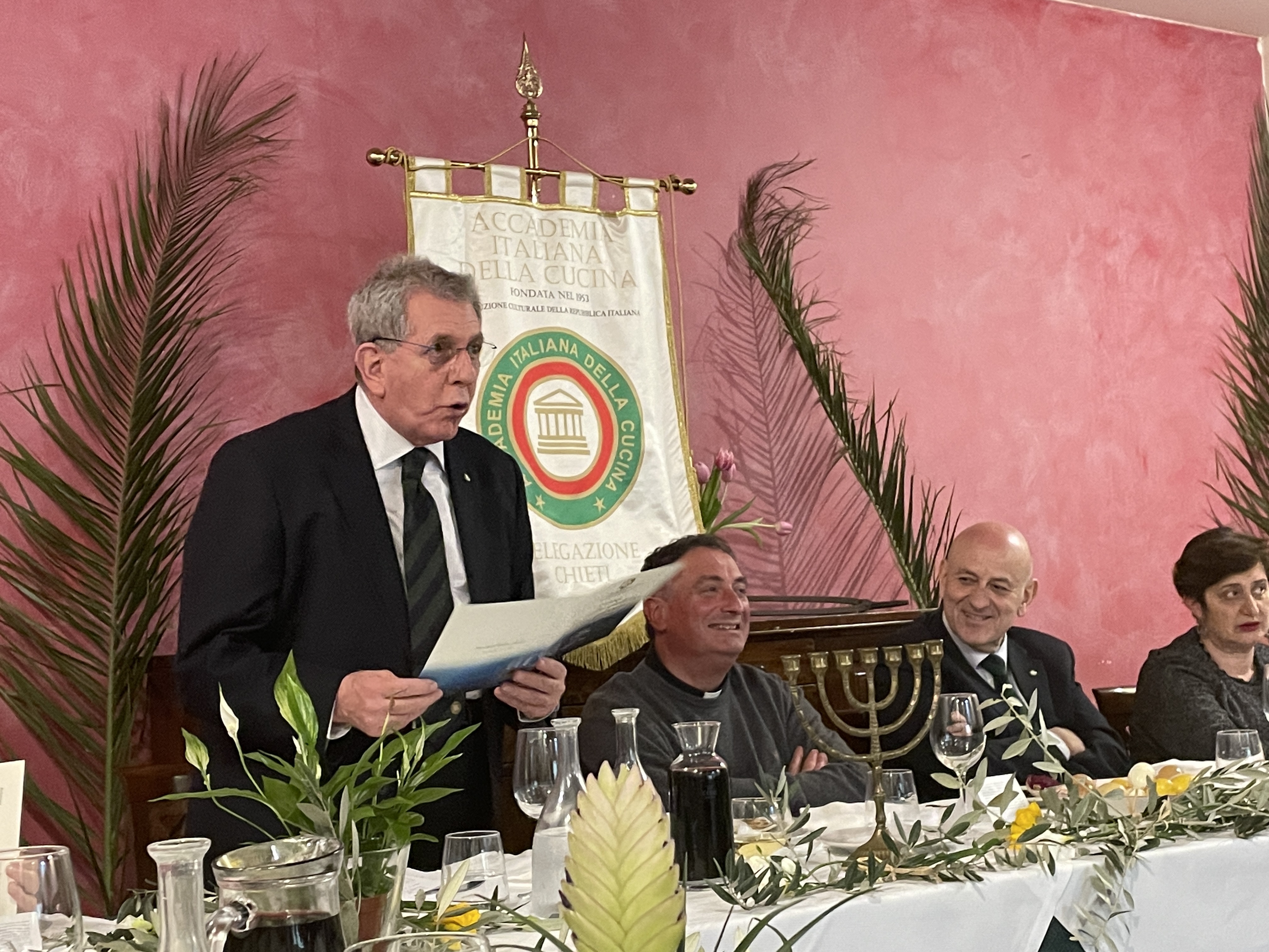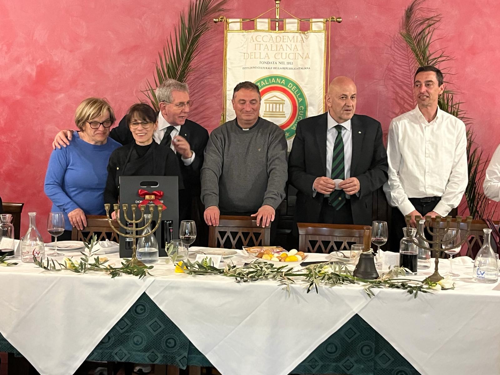 Alla vigilia del triduo pasquale, la Delegazione di Chieti, guidata dal Delegato Nicola D'Auria, torna alle origini della tavola della festa religiosa di primavera per eccellenza. Grazie alla cura del vice Presidente vicario e Delegato onorario Mimmo D'Alessio, Simposiarca d'eccezione, e alla dotta consulenza e all'accompagnamento in corso di conviviale di don Claudio Pellegrini, arciprete parroco della parrocchia della SS. Trinità a Chieti, è stata proposta la cena giudaica prescritta dal libro dell'Esodo per la celebrazione della Pasqua ebraica, con una piccola integrazione di tipicità abruzzese che ha dato alla serata una gioiosa intonazione locale. I piatti serviti, realizzati magistralmente da Patrizia Marinucci, cuoca e proprietaria del "Capsicum", in pieno centro storico, hanno scandito le tappe del menu che fu anche alla base dell'ultima cena di Gesù prima della passione. Gli azzimi tradizionali, accompagnati dalle erbe amare e dall'agnello cotto rigorosamente sulla brace, come prescrivono le norme kosher, si sono accompagnati ad altri piatti della tradizione giudaica, ma che non fanno parte strettamente della cena pasquale, come il carciofo alla giudìa o l'uovo sodo, che ha una forte simbologia religiosa. Come segni abruzzesi tipici della Settimana Santa, il baccalà in pastella, la pizza scima, simile al pane azzimo ma che prevede in aggiunta sale e olio di oliva e il vino Montepulciano. In chiusura del convivio di grande interesse culturale e di gusto particolarmente curioso, si sono esibiti i cantori della "Passione" con i canti tipici abruzzesi dedicati alle ultime ore di Cristo.
