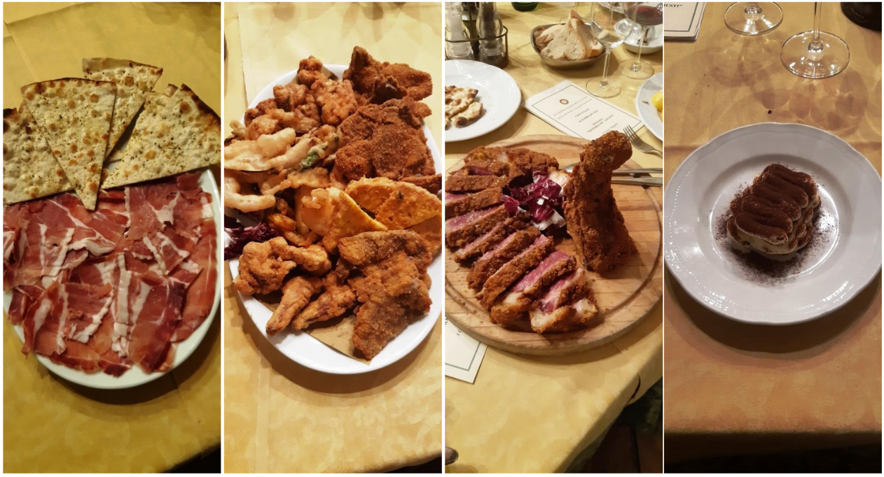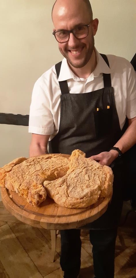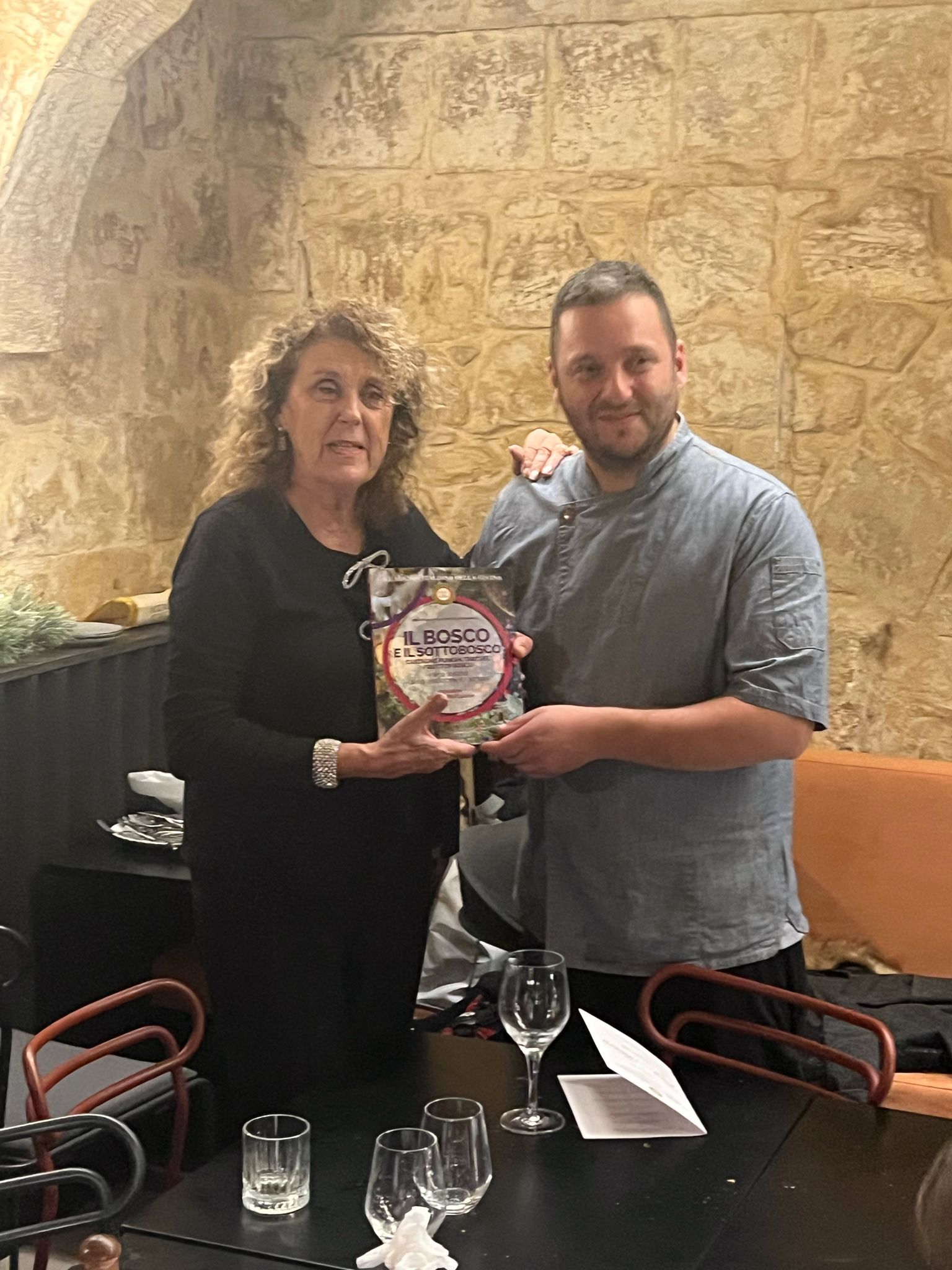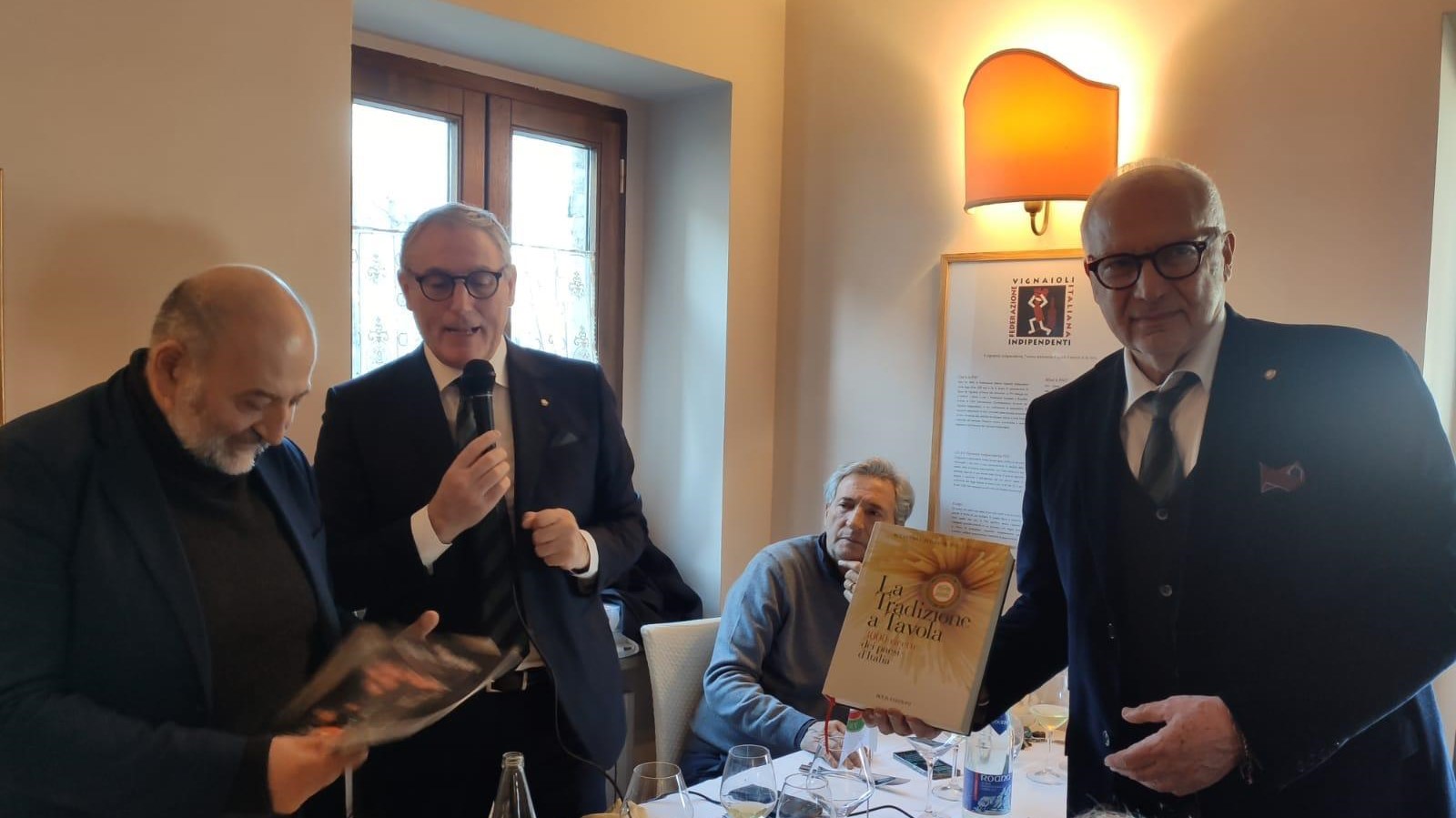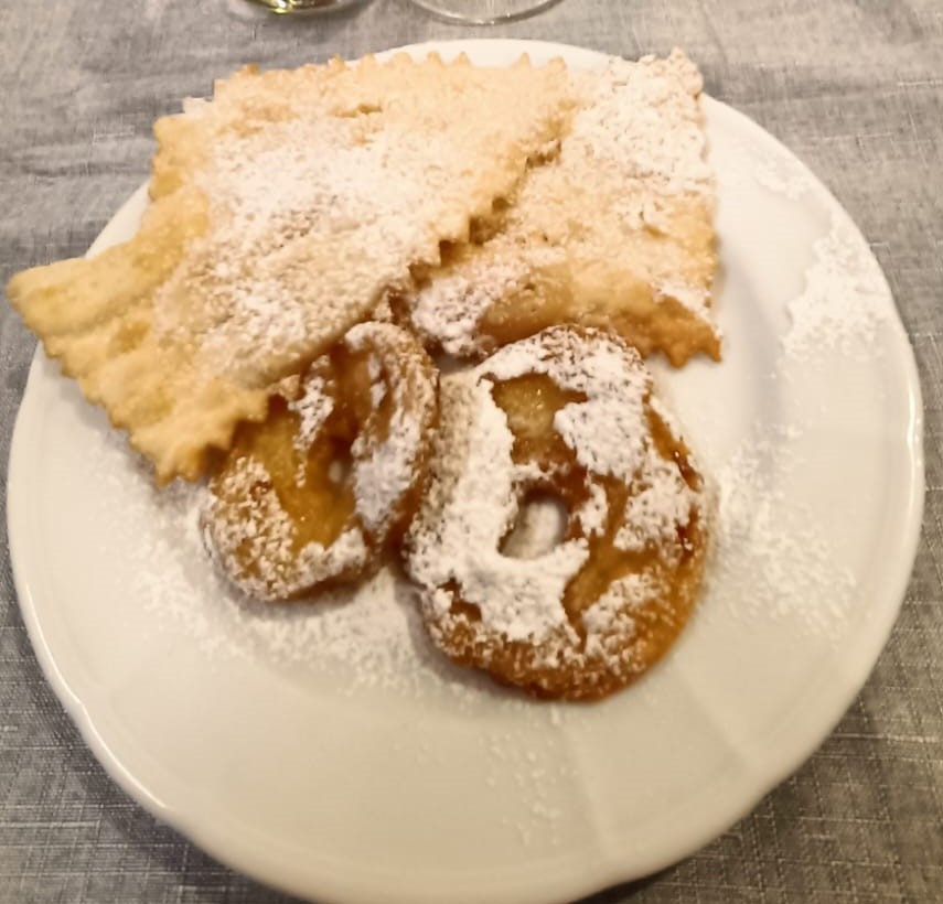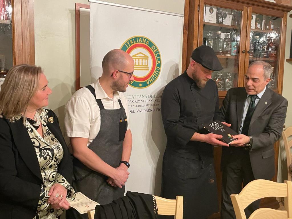 La riunione conviviale di febbraio si è svolta al ristorante Osteria de’ Giusti, famoso in tutta la Regione per la sua cucina tradizionale toscana, ma soprattutto per il suo Gran Fritto, protagonista assoluto della cena. Ospitata in un’accogliente sala dedicata (fig.1), la Delegazione ha gustato uno dopo l’altro i piatti preparati dallo chef Damiano Baloni e concordati dal Delegato Sandro Fusari con i titolari Alessandro ed Emanuel Giusti. L’inizio, stuzzicante, ha visto servire focaccine calde con prosciutto toscano tagliato al coltello e poi, a seguire, il piatto forte: dalle fette di pane bagnate nell'uovo e fritte, alle verdure, carciofi, cipolle, zucchine, patate, alle carni pollo, coniglio, agnello, fettine di vitello e "Sua Maestà" la "fiorentina" fritta che, tenuta nell'uovo 12 ore (foto 2), viene poi fritta in modo che il cuore rimanga sempre rosa. In abbinamento è stato servito un gradevole vino rosso Canaiolo in Anfora IGP dell’Azienda agricola Gabriele Mazzeschi e, per concludere, un ottimo tiramisù fatto in casa (foto 3, i piatti). Al termine della serata, dove al piacere della buona tavola si è unita la calda accoglienza dei padroni di casa, il Delegato e la Vice Delegata Roberta Ceppatelli hanno ringraziato lo chef e il maître di sala, Stefano, donando loro il libro dell’Accademia “1953-2023: le origini, l’evoluzione, il futuro” (fig. 4).