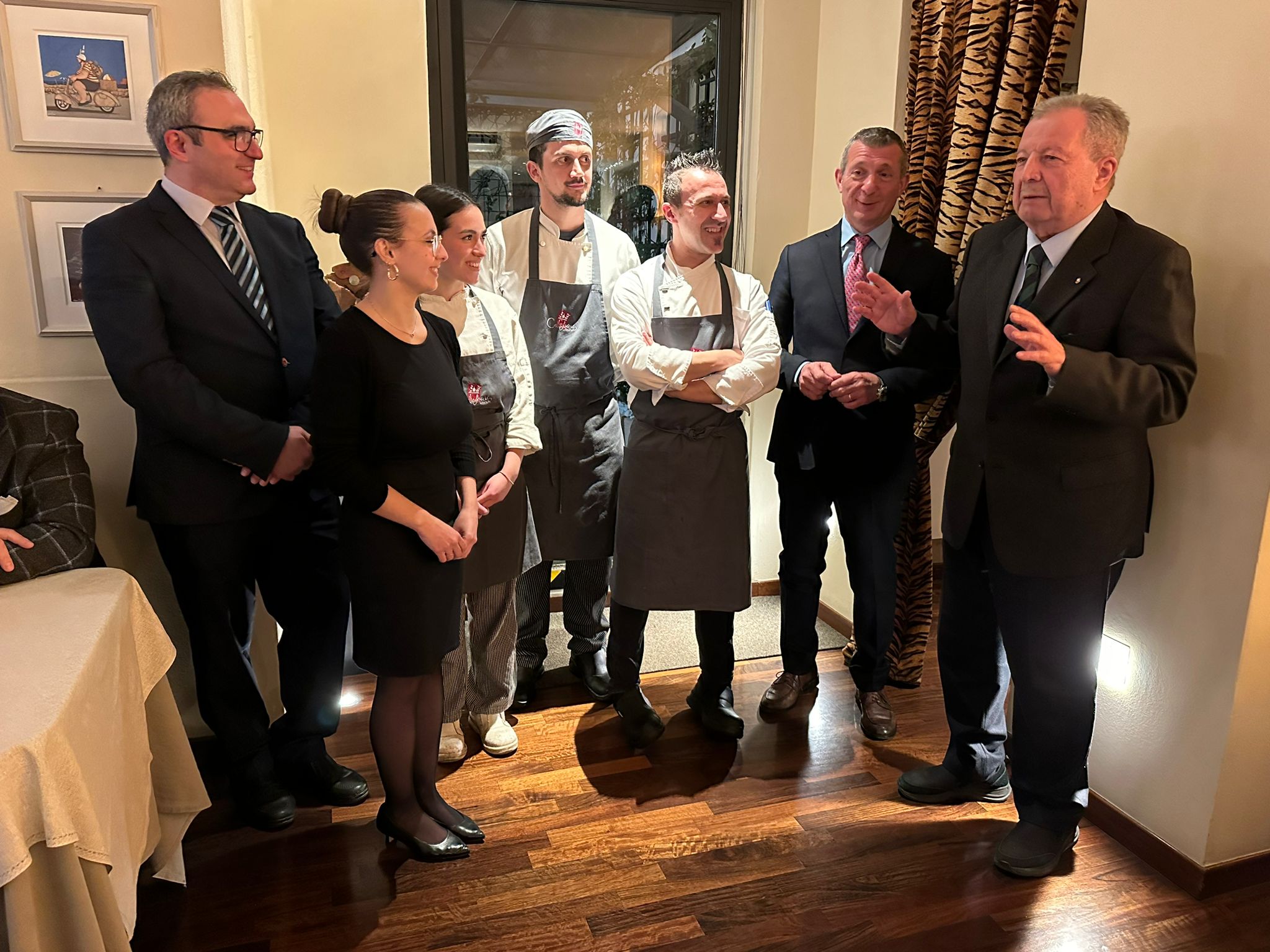 La prima riunione conviviale del 2024 è coincisa con il Carnevale e ha registrato una larghissima partecipazione della Delegazione. Il ristorante pizzeria Number One-1983 era stato visitato in passato dalla Delegazione anche per la vocazione culturale dell’esercizio collegato a un'importante azienda di produzione e commercializzazione di carni fresche. Un enorme banco a vista che espone una varietà di tagli di carne accoglie la clientela per l’acquisto al dettaglio e per la consumazione ai tavoli, distribuiti su tre piani, l’ultimo dei quali, la terrazza, con vista sulle luci notturne della città dove è stata accolta la Delegazione (Foto 1 e 2). Gli Accademici hanno apprezzato la proposta di pietanze coerenti con la tradizione carnevalizia, sia gli originali antipasti ispirati alla cultura locale rivisitata sia i maccheroncini al sugo di maiale e le eccellenti e variegate carni grigliate (salsicce, costolette, braciolettine, costatine) o stufate a lungo. La valutazione finale è stata condizionata dalla scadente qualità della pignolata e delle chiacchiere prodotte da un laboratorio esterno all'esercizio. Nonostante l'evidente latitanza della proprietà, il servizio di una giovane squadra, cortese e puntuale, è stato gratificato dal plauso generale e dalla consegna del guidoncino (foto 3).
