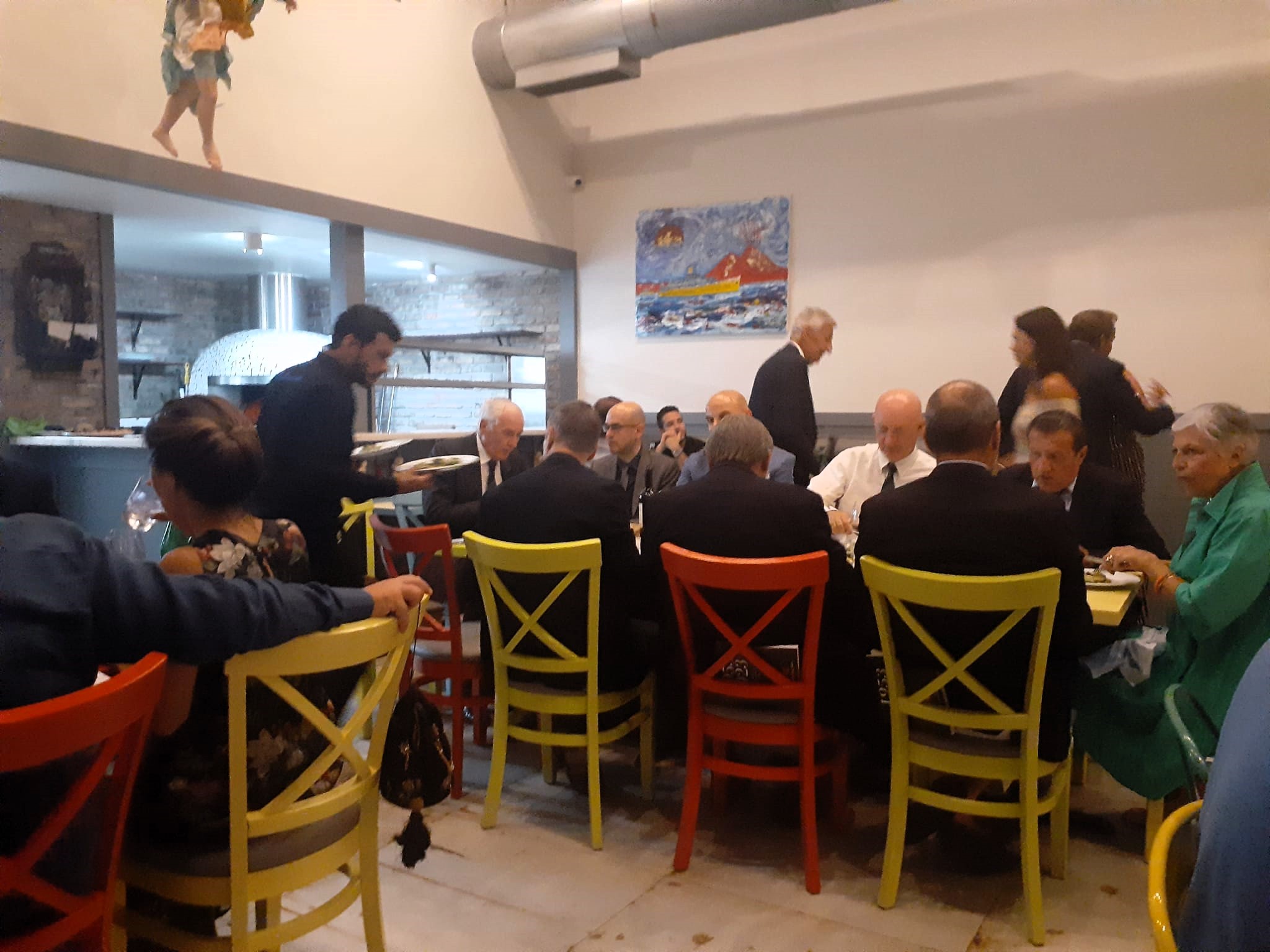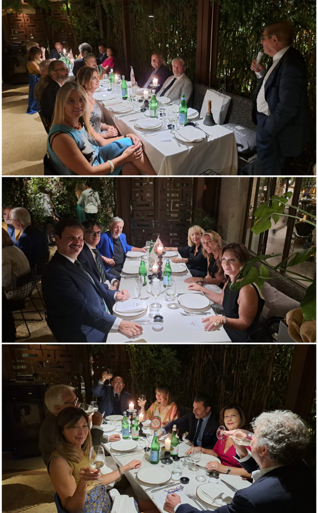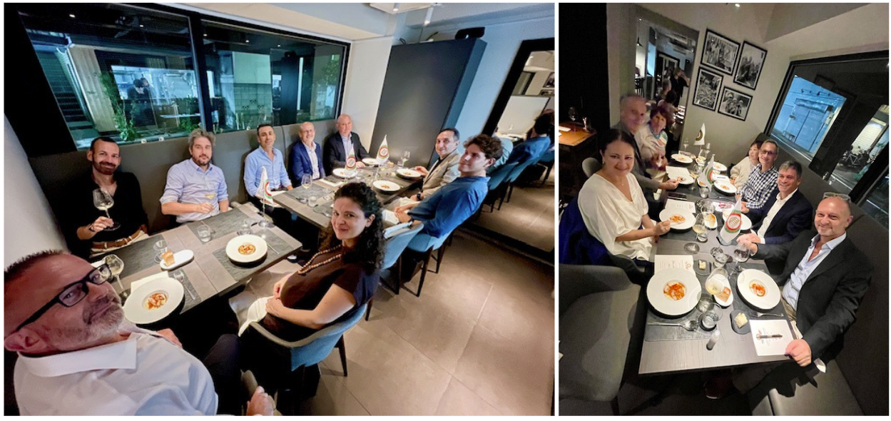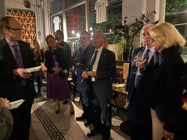 Al rientro dal periodo estivo, la Delegazione di Londra ha organizzato un apericena presso Enoteca Rosso, un locale nel cuore di Kensington che offre specialità italiane di ottima qualità. Una cinquantina di Accademici si sono dati appuntamento in una serata di grande convivialità, riprendendo contatto dopo la pausa estiva. Vini e aperitivi sono stati accompagnati da un menu, servito con grande efficienza dallo staff, che ha voluto rendere omaggio alla Regione Emilia Romagna, colpita da un disastro ambientale. Il menu comprendeva un tagliere emiliano di parmigiano reggiano invecchiato 24 mesi, crudo di Parma, coppa ferrarese con gnocco fritto, crostini di fegatini emiliani, crescione con spinaci, tortellini di carne con glassa di brasato, gnocchi emiliani serviti con ragù di porcini e fonduta di parmigiano e, per finire, pesche dolci con crema e torta al cioccolato Barozzi; il tutto accompagnato da Aperol, Select e Campari Spritz, Prosecco millesimato Zonin, Gavi di Gavi. Grazie alla Simposiarca, la Consultrice Elena Parigi Klat, e a tutto il personale di sala e cucina capitanato da Kim.