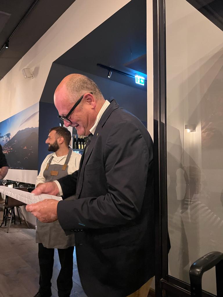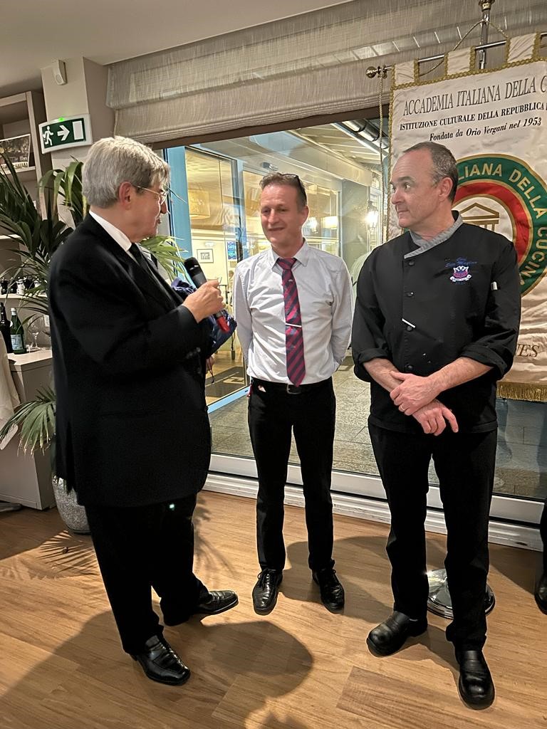Nell’elegante ristorante del Golf Club di Losanna, il vice Delegato Renato Galletti ha organizzato un incontro della Delegazione in onore dei nuovi Accademici di Losanna-Vennes. Julio Fernandes, responsabile del servizio di sala, e Eric Meylan, chef della brigata di cucina, con la loro competenza, esperienza e saper fare, hanno raccolto il plauso dei numerosi presenti. È stata l’occasione per il Delegato Alessandro Caponi di fare un breve bilancio della vita della Delegazione. Il menu servito, semplice, armonioso, ricco di sapori, profumi e colori, era composto da un aperitivo caldo (mini pizza e mini ramequin) e freddo (bruschetta e verrine di gaspacho con soppressata calabra) assolutamente appetitoso, un filetto di branzino su letto di misticanza di perfetta cottura e bella presentazione, un vitello arrosto fondente in bocca, con fricassea di bosco, patate rosolate e legumi, e da una Tarte Tatin con gelato di vaniglia, profumata e cotta a puntino. Graditissima la presenza del Console Generale d’Italia Tomaso Pietro Marchegiani. I commenti finali della serata sono stati affidati all’Accademico Vito Marques. Il piatto d’argento dell’Accademia è stato offerto ai responsabili del servizio di sala per la celerità e l’eleganza del servizio a tavola e allo chef della brigata di cucina per l’accuratezza del suo lavoro.