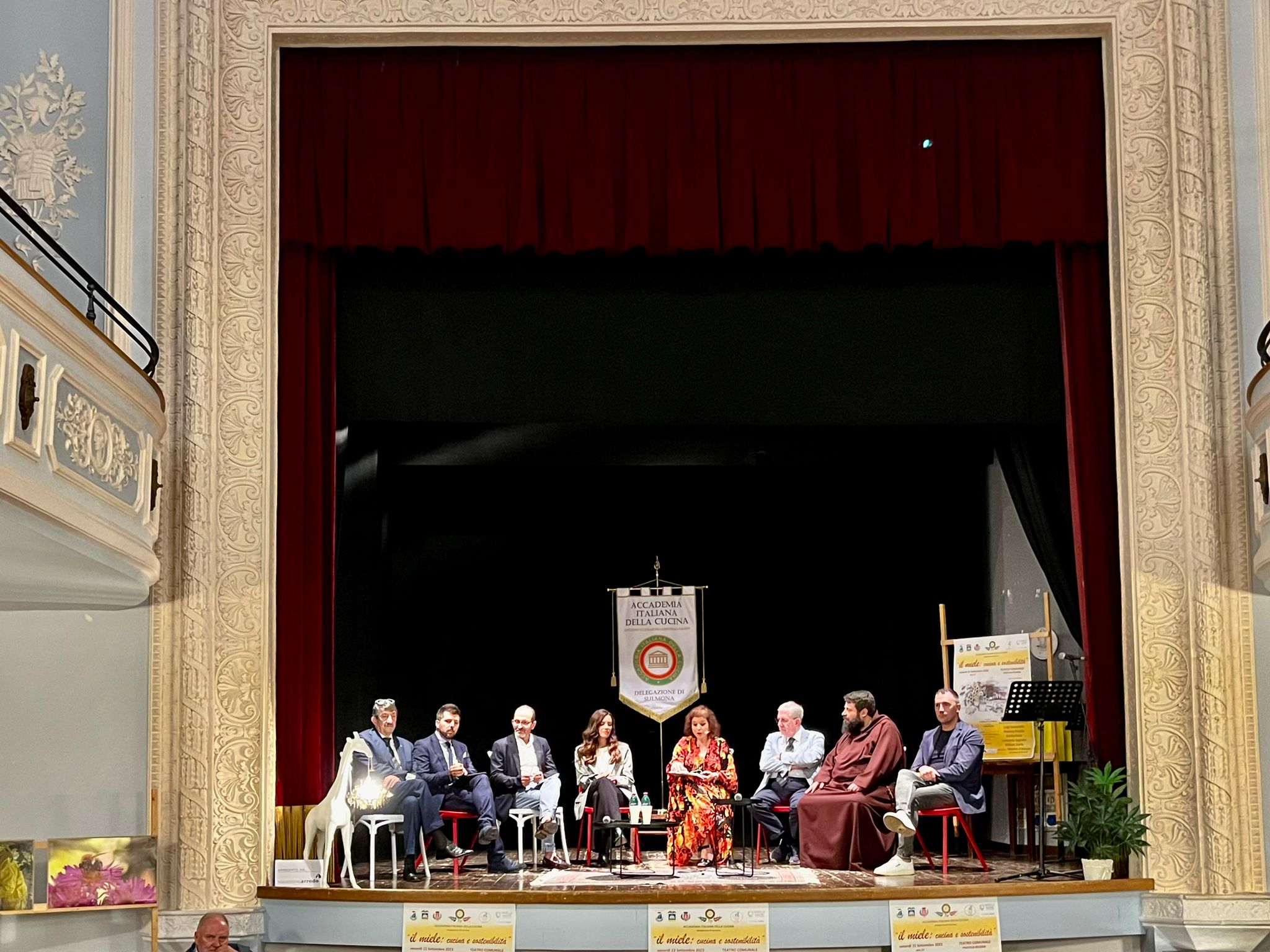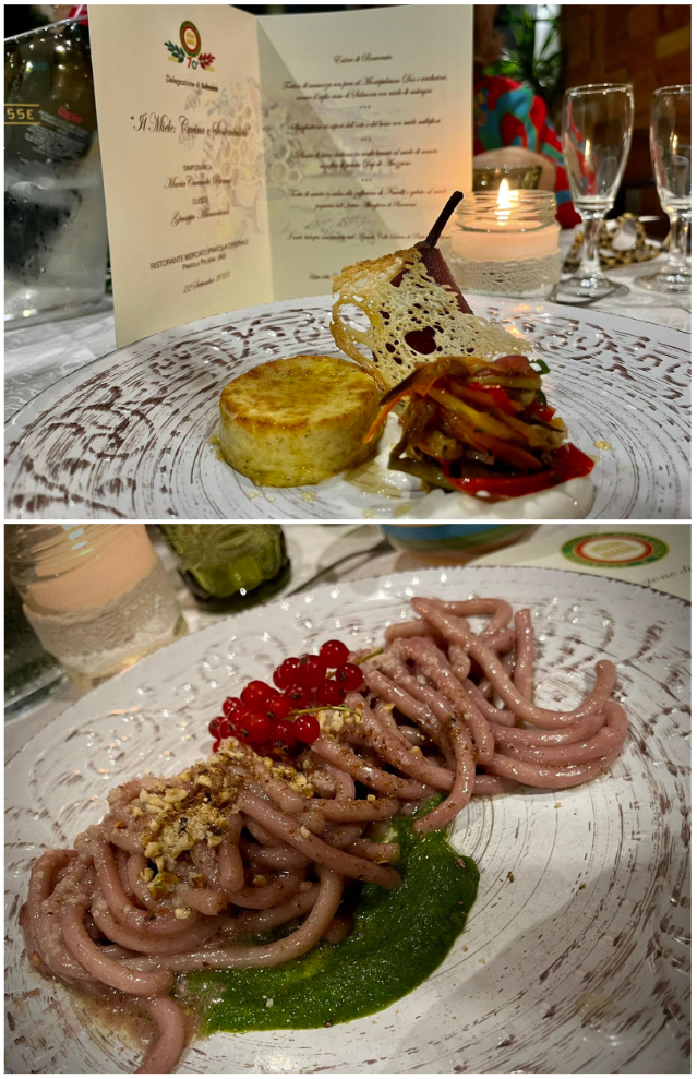 La Delegazione di Sulmona ha organizzato nel Teatro Comunale di Pratola Peligna il convegno "Il miele: cucina e sostenibilità". Un momento di incontro e confronto che ha visto importanti relatori e alcuni Istituti scolastici con i quali da tempo la Delegazione collabora, alla presenza di un numerosissimo pubblico. È seguita un’interessante riunione conviviale a tema presso il ristorante "Mercato Pratola Centrale" che ha riscosso il plauso dei commensali. Foto 1. Un momento del convegno. Foto 2. Consegna delle insegne accademiche a Giuseppe Rapone alla presenza del Vice Presidente Vicario. Foto 3. Tortino di scamorza con pera al Montepulciano, verdurine caramellate e miele di castagno; spaghettoni al profumo di bosco e miele millefiori. Foto 4. Torta di carote con gelato al miele preparata dall'Istituto alberghiero di Roccaraso.