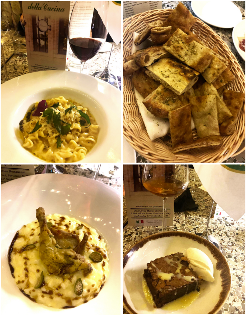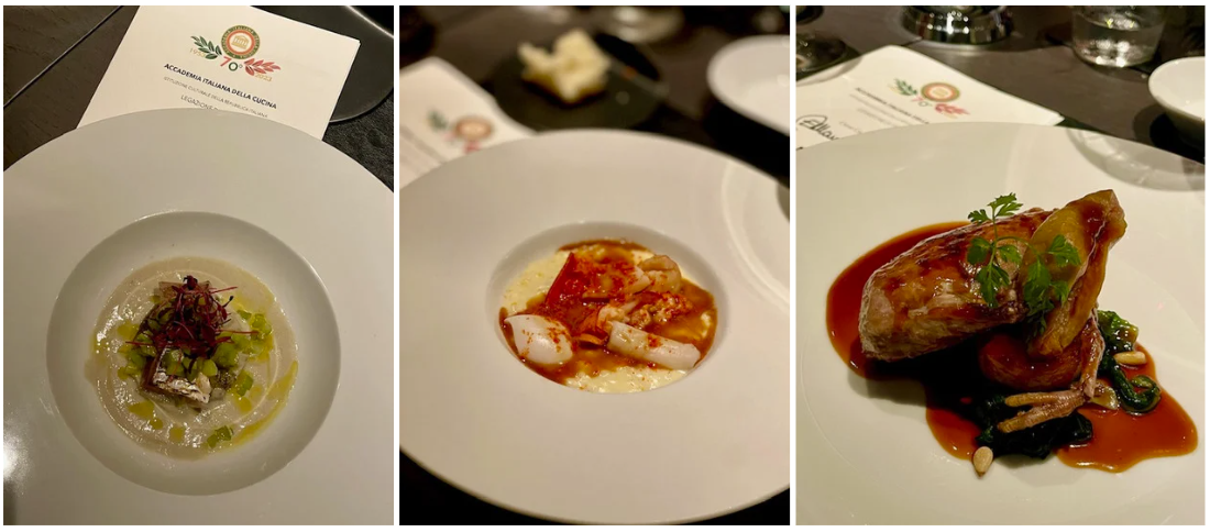 Dopo una pausa di circa sei mesi, il Delegato Santo Santoro ha riunito gli Accademici (foto 1) intorno alla cucina dello chef Dario Manca. Il ristorante “Rosmarino”, di recente apertura e di una raffinatissima architettura post-industriale, regala un’atmosfera accogliente e molto piacevole. Lo stile culinario è essenziale e offre il gusto dei veri sapori d’Italia a oltre sedicimila chilometri di distanza dalla nostra terra. I piatti (foto 2), di grande mano per originalità, equilibrio e nettezza dei sapori, mostrano un’analisi evidente di tutte le possibili espressioni, strutturate e destrutturate, di un singolo ingrediente, in una ricerca che conduce al “piatto ideale” di quella preparazione. In particolare, ha piacevolmente sorpreso la punta sapida dei cucunci nel risotto. Ottima la scelta dei vini operata dal proprietario, Andrea Gatti, che hanno accompagnato ogni portata. Alla fine della riunione conviviale, il Delegato ha consegnato al cuoco e al proprietario il piatto dell’Accademia (foto 3 e 4).