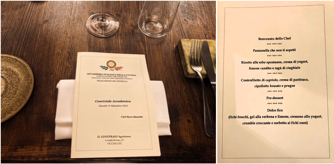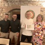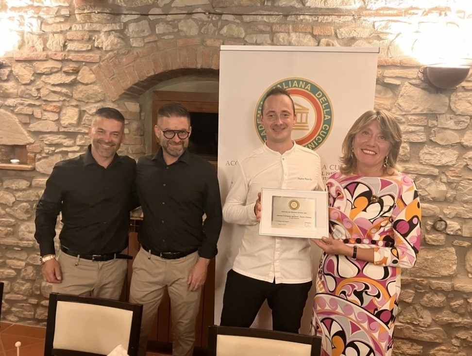 Nel corso della riunione conviviale di settembre è stato consegnato il Diploma di Buona Cucina al ristorante Il Ginepraio Agriristoro - Vicchio (FI), situato all’interno dell’agriturismo Vita Nova, un elegante resort immerso nella natura con una vista straordinaria sui più alti rilievi dell’Appennino tosco-romagnolo. Un riconoscimento importante che premia la passione e la grande abilità di Marco Bianchini, giovane chef di origine mugellana, che propone una cucina curata e raffinata, sensibile alla stagionalità e ai prodotti del territorio, che parte dai piatti della tradizione per lasciare spazio anche alla creatività e alle tecniche di preparazione più evolute. Assai elevato l’apprezzamento da parte degli Accademici del menu preparato per questa importante occasione e ispirato ai sapori, ai profumi e ai colori dell’autunno con la cacciagione, come il ragù di cinghiale sfilacciato e il controfiletto di capriolo, e anche con le erbe spontanee, le prugne e infine i fichi alla base del delizioso dessert. Grande l’emozione di Bianchini nel ricevere l’attestato, con a fianco Simone e Lorenzo Boni che gestiscono l’agriturismo e curano con premurosa attenzione il servizio in sala.