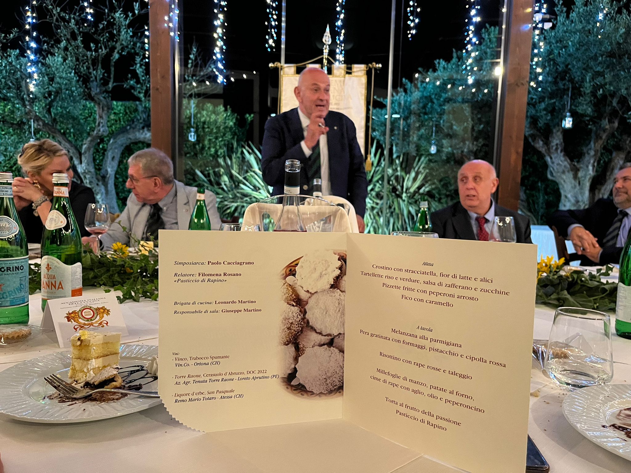 Alla ripresa delle attività accademiche, la Delegazione teatina ha scelto di ripartire da un locale che ha fatto della sua capacità di reinterpretare le tradizioni pedemontane il suo marchio di fabbrica. Il Simposiarca Paolo Cacciagrano, sposando appieno la filosofia dei fratelli Martino del ristorante Il Vignale, ha presentato una riunione conviviale originale che, partendo dagli ingredienti del territorio, ha spaziato in abbinamenti inediti, sapientemente accostati per un menu di grande impatto, visivo e gustativo. La serata è stata anche l'occasione per riscoprire uno dei dolci delle zone interne abruzzesi, il pasticcio di Rapino, presentato da Giustino De Nardis, cultore delle tradizioni rapinesi: un dolce che ha origini costiere e che tramite passaggi di tavola nobiliare in tavola nobiliare ha raggiunto la montagna trasformandosi ma mantenendo il gusto unico della storia.