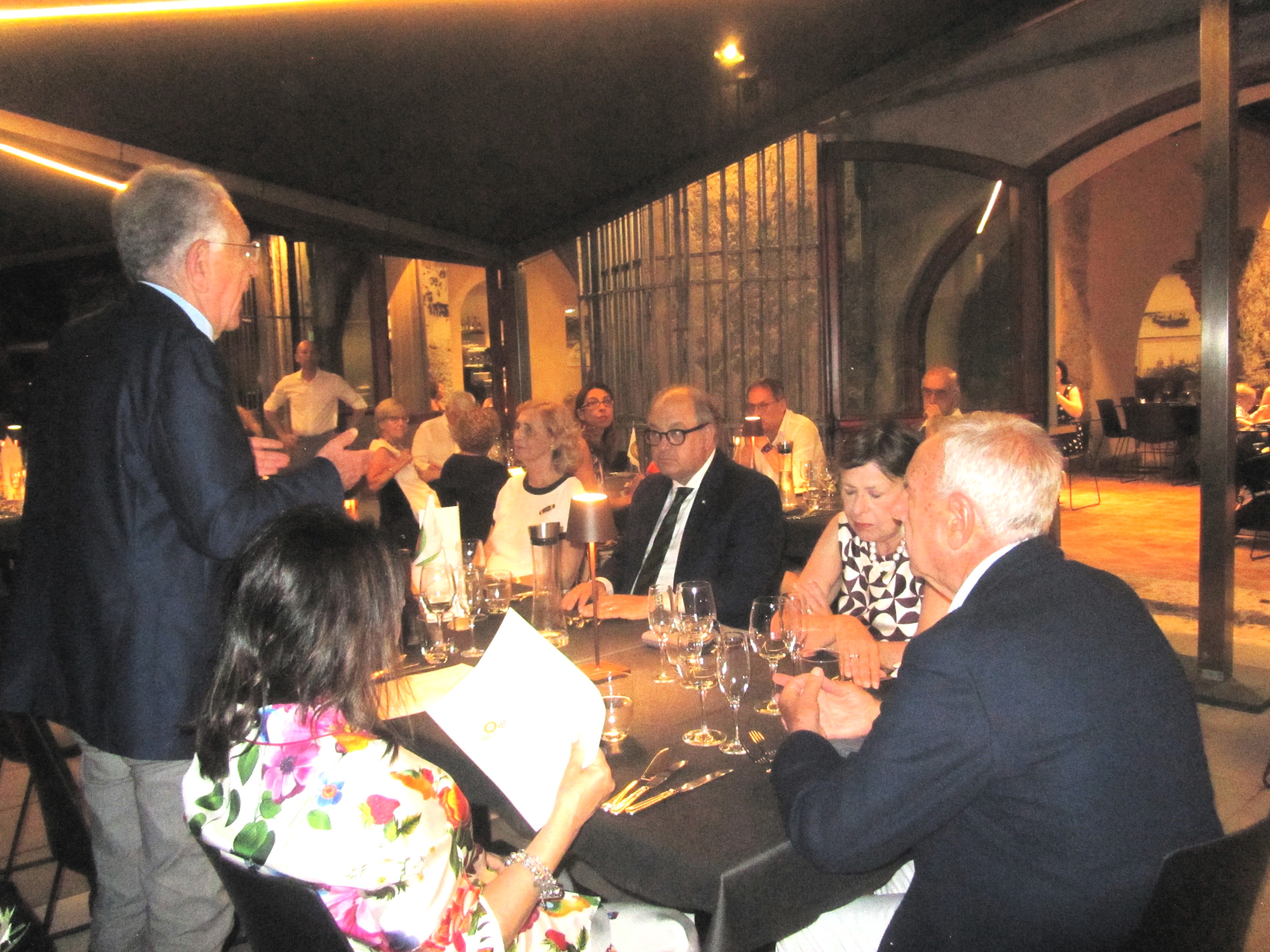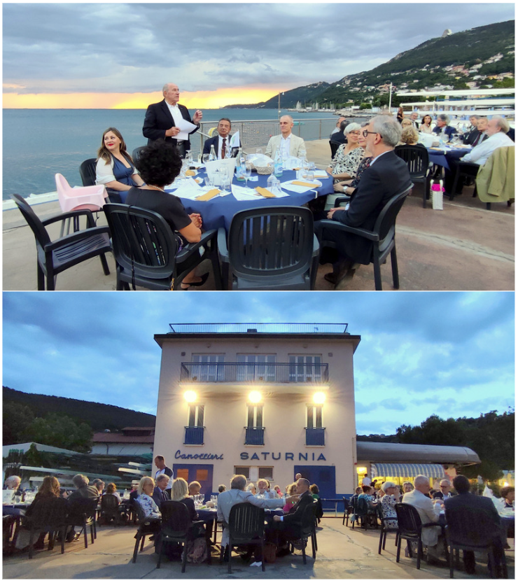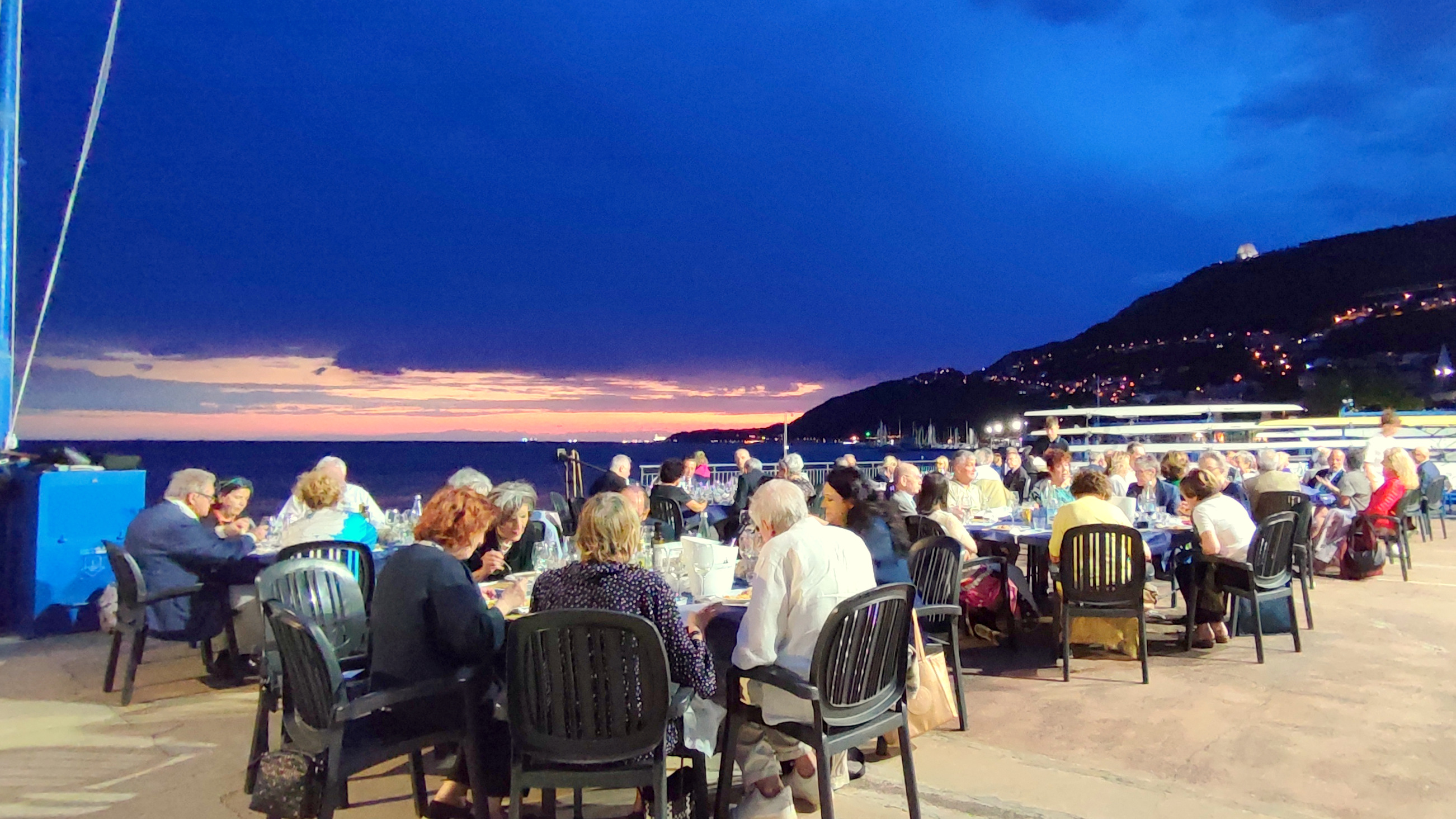 Nello stupendo scenario di Barcola, frazione di Trieste, si è svolta la cena conviviale che vede tradizionalmente riunite le cinque Delegazioni del Friuli Venezia Giulia in occasione del solstizio d’estate. Per la riunione è stata richiesta dal Delegato di Trieste, Paolo Penso, l’ospitalità presso il Ristorante “Otto Senza” situato all’interno del Circolo Canottieri Saturnia. Accomodati ai tavoli imbanditi su una grande terrazza affacciata sul mare, gli Accademici ed i loro ospiti hanno potuto gustare le saporite pietanze di pescato preparate dal “fritolìn” e dai suoi collaboratori. In un clima conviviale e festoso, il Delegato di Trieste ed il CT del Friuli Venezia Giulia hanno ricordato l’importanza di questa ormai consolidata tradizione che permette di implementare e consolidare l’amicizia di tutti gli Accademici della Regione. All’evento ha partecipato anche il CT del Veneto e Delegato di Mestre Franco Zorzet. Il menu, molto ricco, prevedeva un aperitivo con melanzane e zucchine impanate e fritte accompagnate dagli immancabili “sardoni barcolani”. A seguire, grancevola, baccalà mantecato, alici marinate e “in saôr”, per poi continuare con un risotto di frutti di mare e delle farfalle con gamberi e zucchine. Quindi un graditissimo “branzìn” al cartoccio accompagnato dal radicchio del Carso con i fagioli, per concludere con l’immancabile crema carsolina, un millefoglie di antica tradizione, e con un sorbetto al vino Terrano passito.
