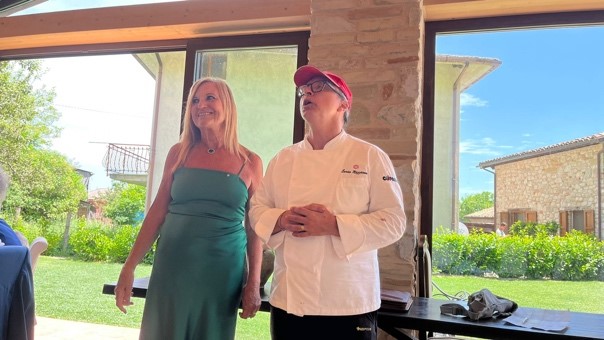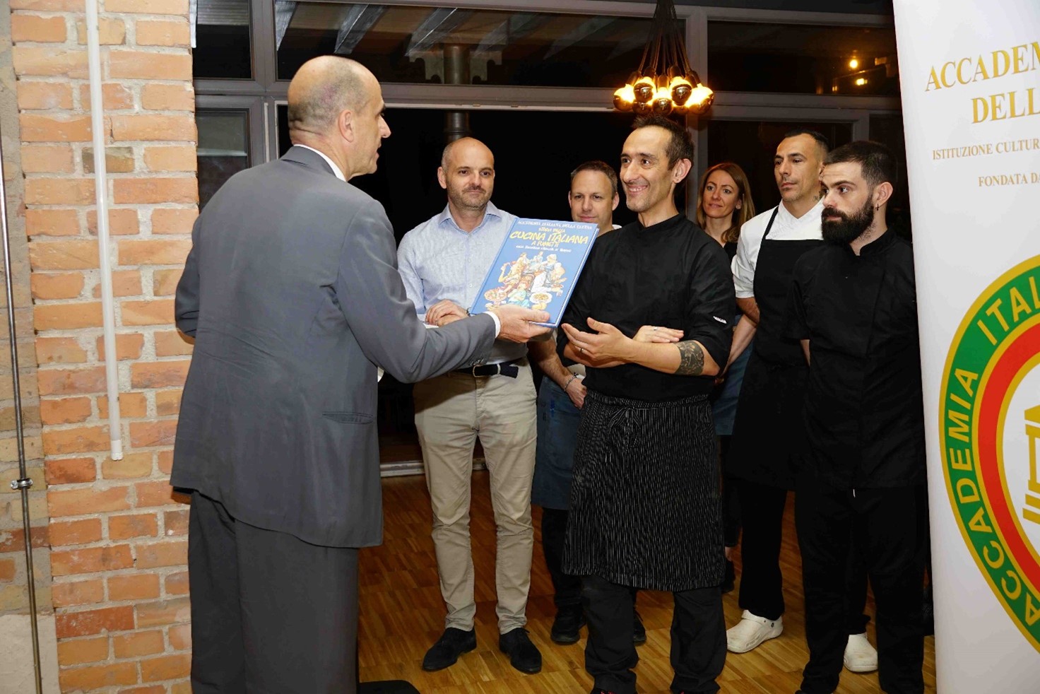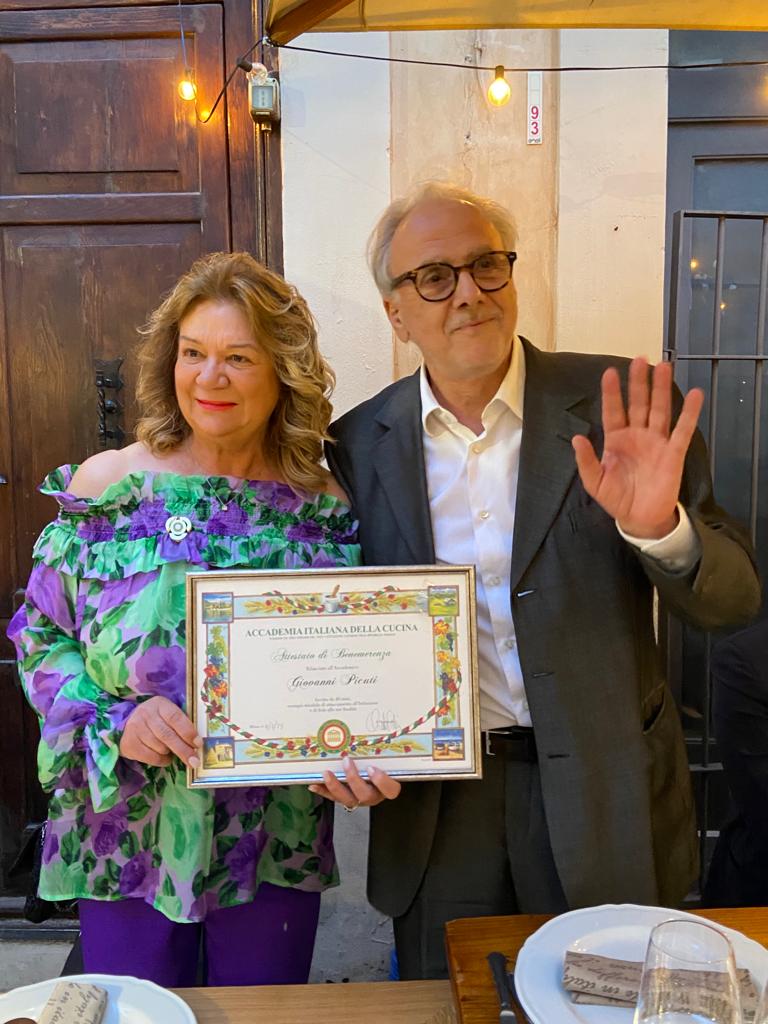 Si è svolto presso l’Osteria Bacerotti di Foligno il convivio per celebrare l’Accademico Giovanni Picuti nel quarantesimo anniversario del suo ingresso in Accademia, avvenuto nel 1983. L’occasione, organizzata dai Simposiarchi Claudia Valentini e Daniele Falchi, è stata propizia per proporre un menù che volgesse gli occhi al passato, riecheggiando piatti ormai scomparsi dalle tavole, ma che quarant’anni fa erano di comune diffusione e richiestissimi dal gusto del tempo. L‘evoluzione della cucina guarda nel presente addirittura con sospetto ad alcuni di essi, ma la Delegazione, con questa operazione di recupero storico filologico, ha inteso rendere omaggio a quell’atmosfera vissuta come testimonianza del cambiamento intervenuto. Questa la proposta: vol au vent con insalata russa, vitello tonnato, giardiniera di verdure, grissino avvolto nella fetta di prosciutto come antipasti; tagliatelle paglia e fieno alla boscaiola, cappelletti alla panna e tartufo tra i primi piatti; per secondo filetto al pepe verde seguito dal dessert pesca melba. I ricettari riportano queste ricette nelle varie edizioni dal secondo dopoguerra in poi, quando il cimentarsi con una cucina diversa da quella tradizionale di derivazione rurale, oggi ampliamente recuperata, significava misurarsi con lo sviluppo sociale ed economico che riempiva di speranza il futuro che allora si intravedeva. La serata è iniziata con la consegna, da parte della Delegata Claudia Valentini, dell'attestato di benemerenza dell'Accademia; un sonetto ad opera di Daniele Falchi è stato l’omaggio conclusivo della breve cerimonia.